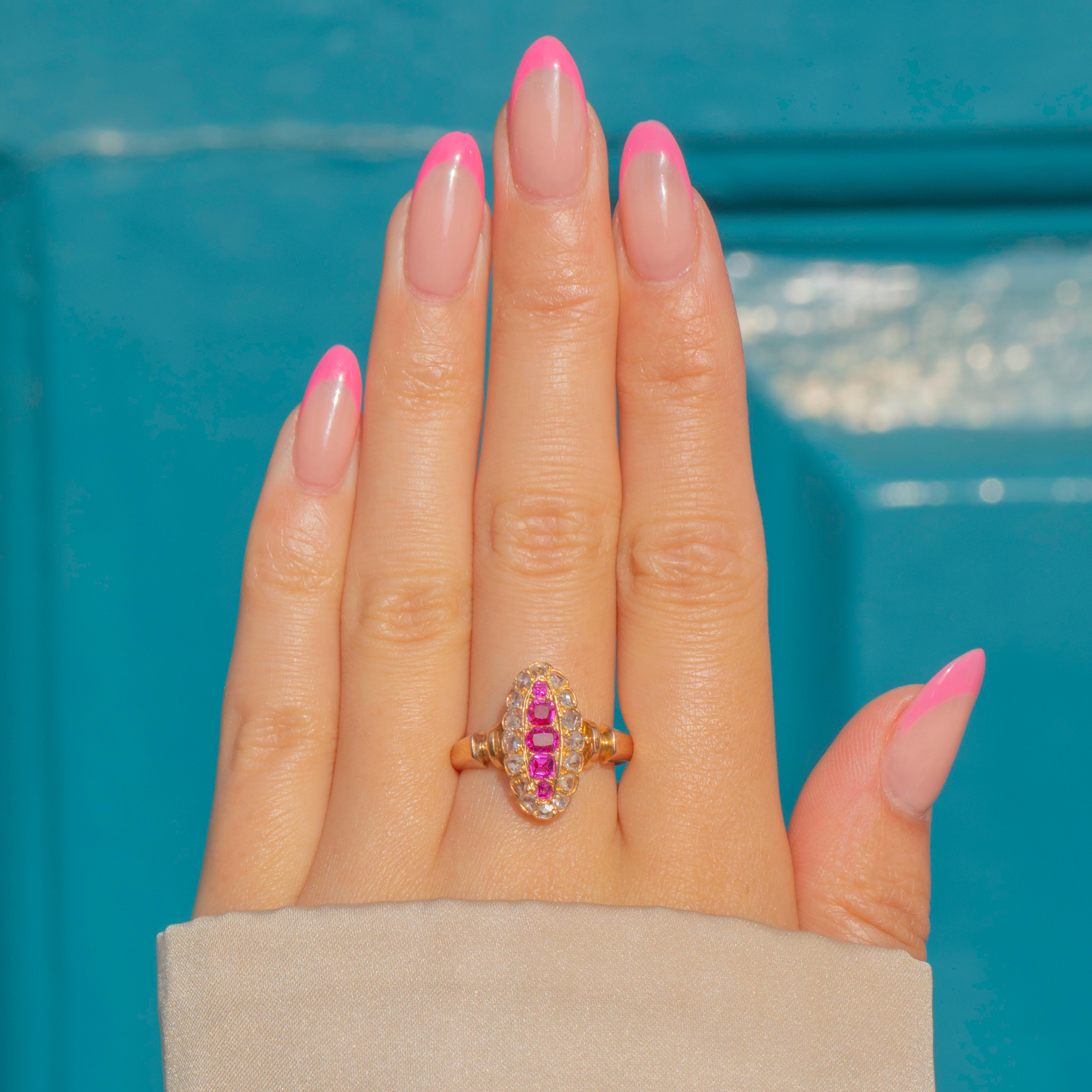 Antique French 18ct Gold Ruby Diamond Navette Cluster Ring