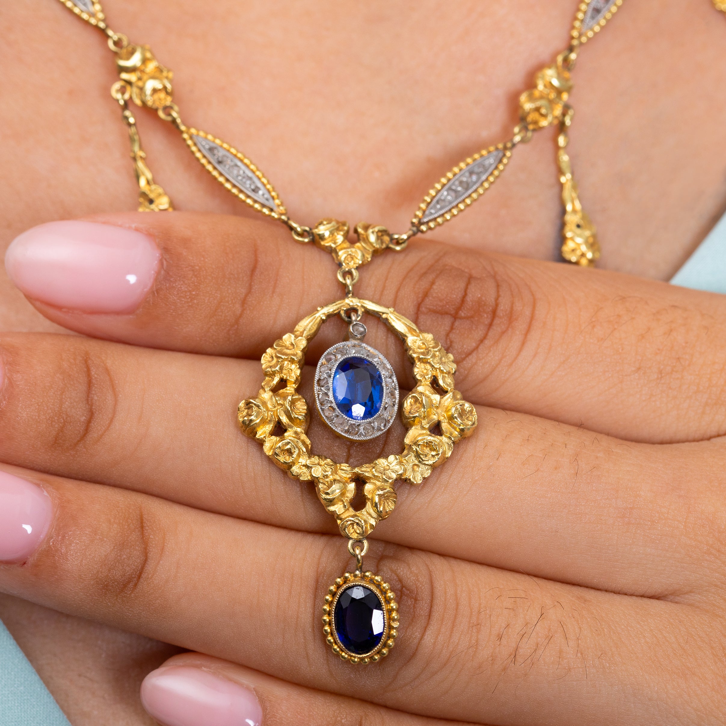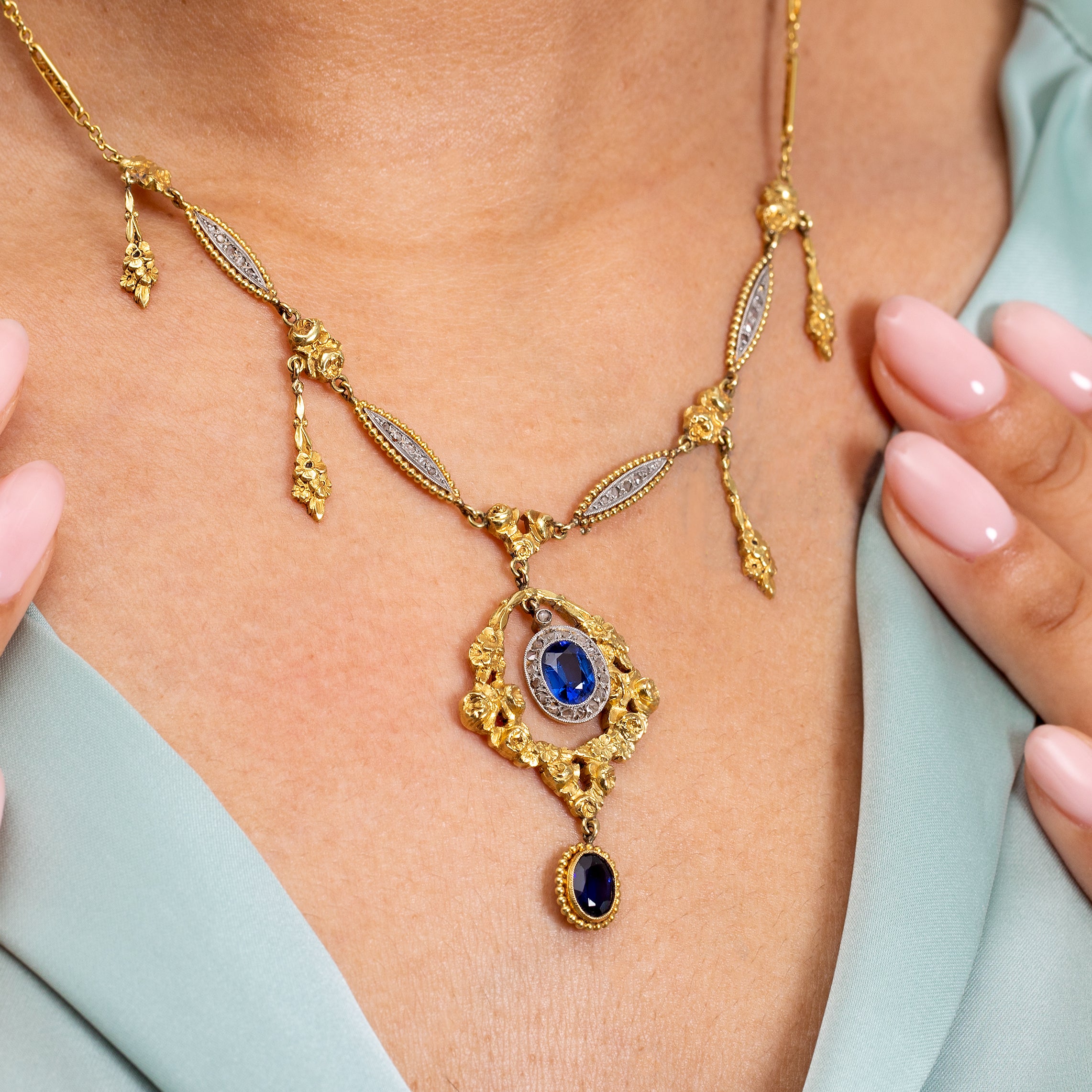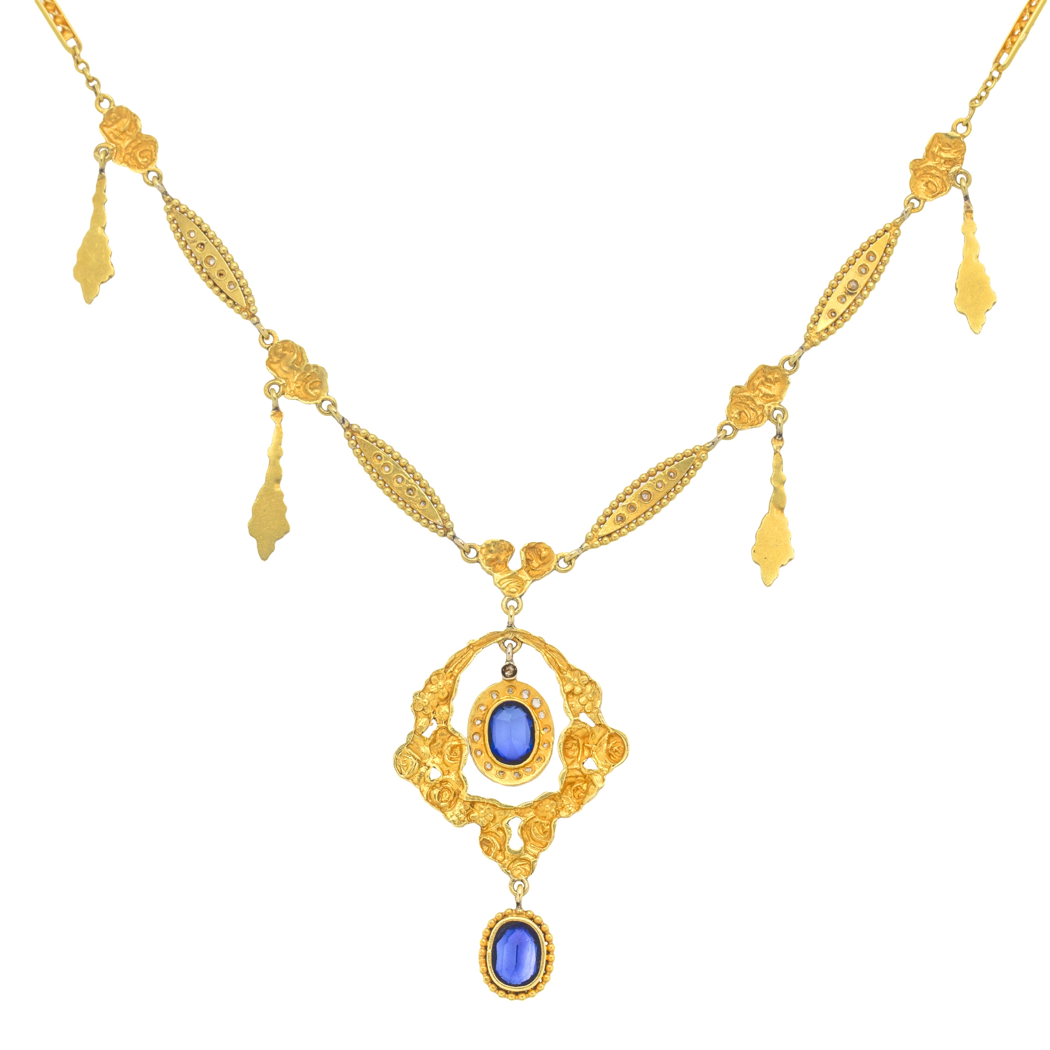 Antique French 18ct Gold Sapphire Diamond "Roses" Fringe Necklace