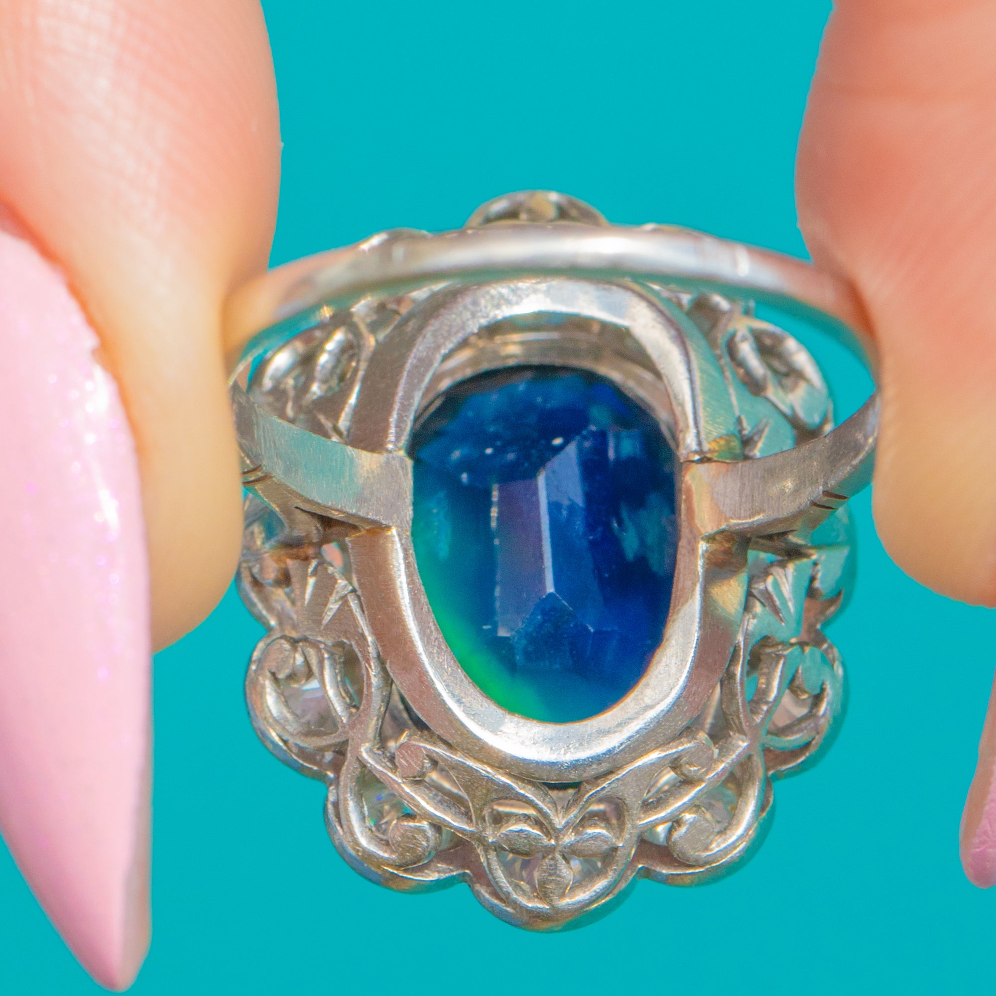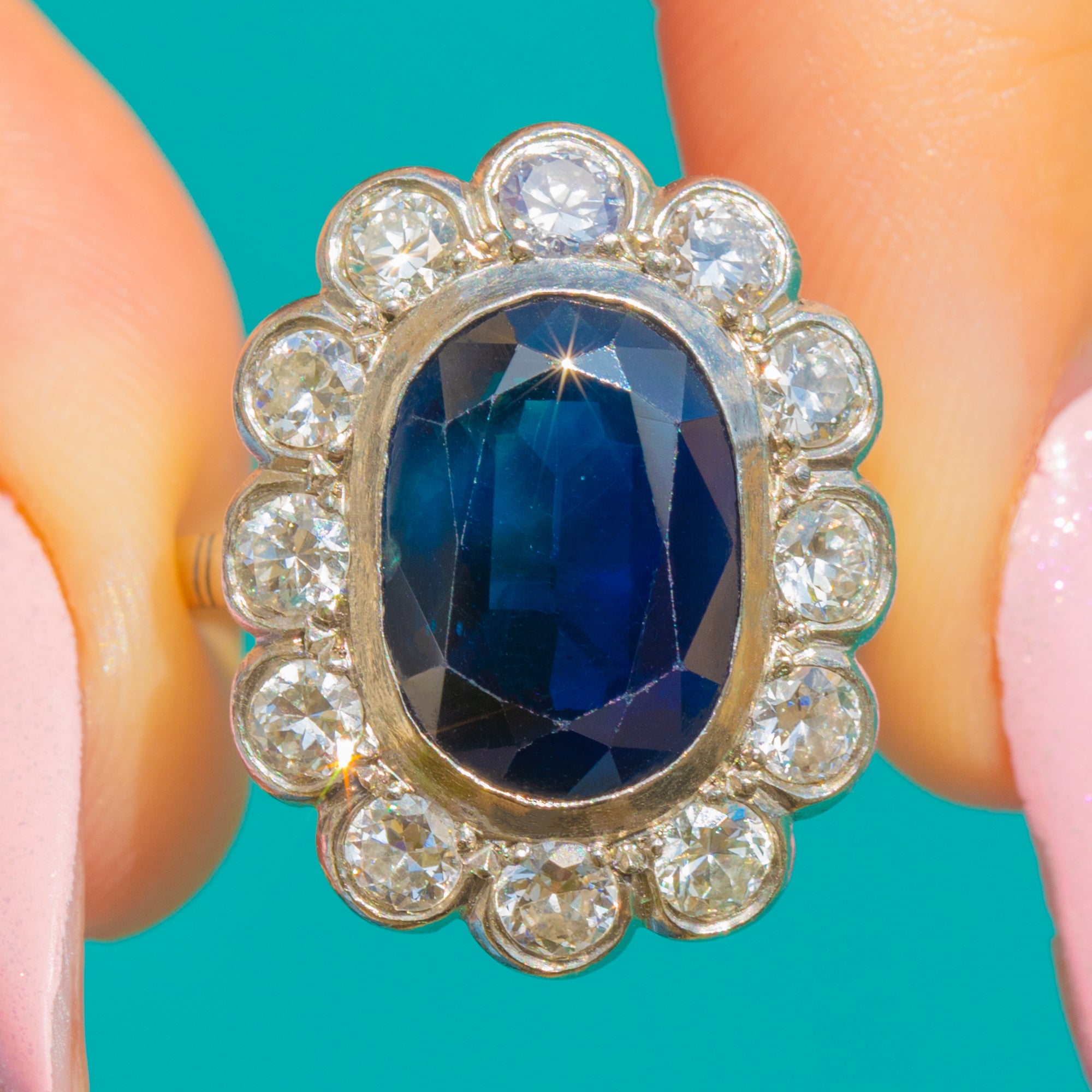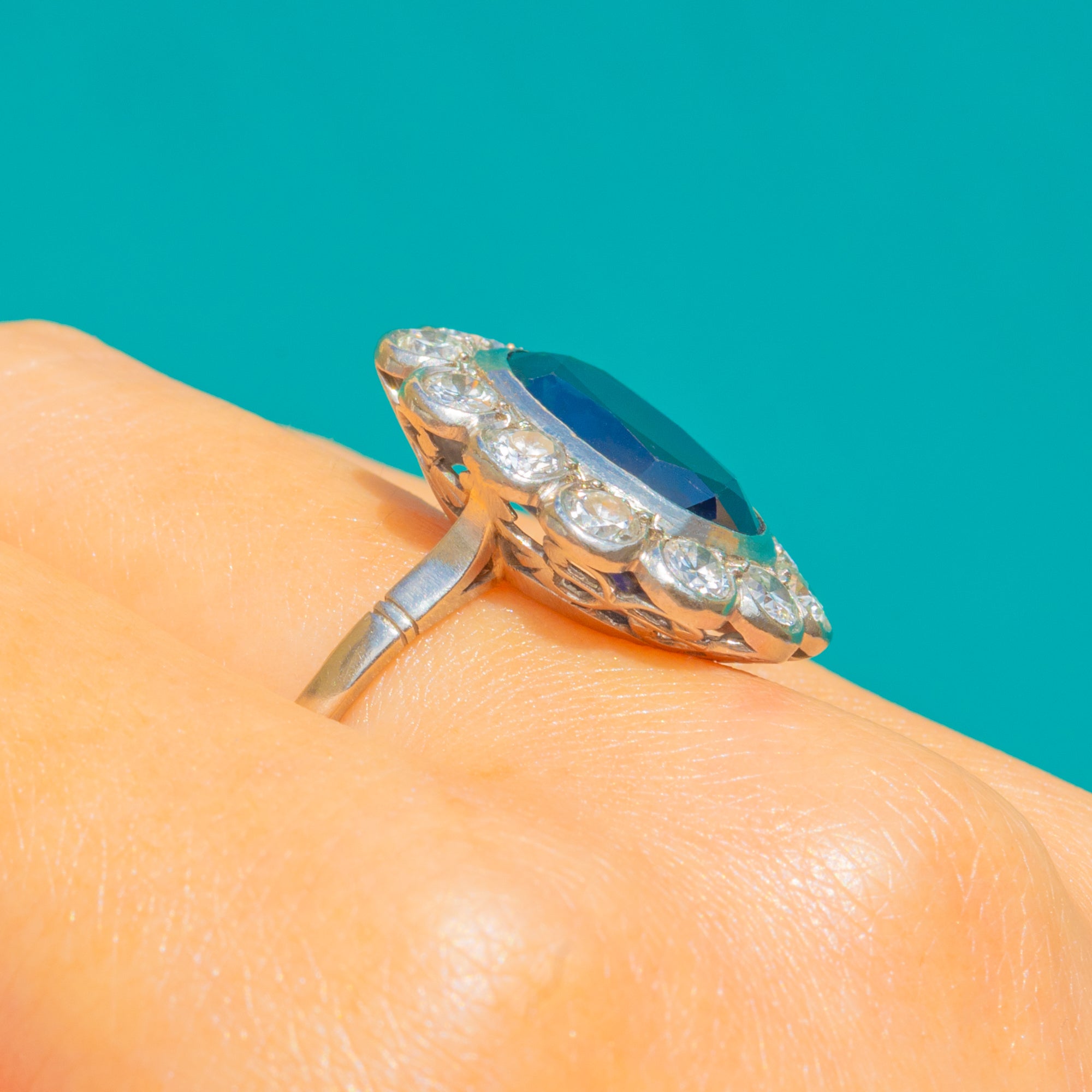 Antique French Art Deco Sapphire Diamond Cluster Engagement Ring, 5.25ct Natural Sapphire