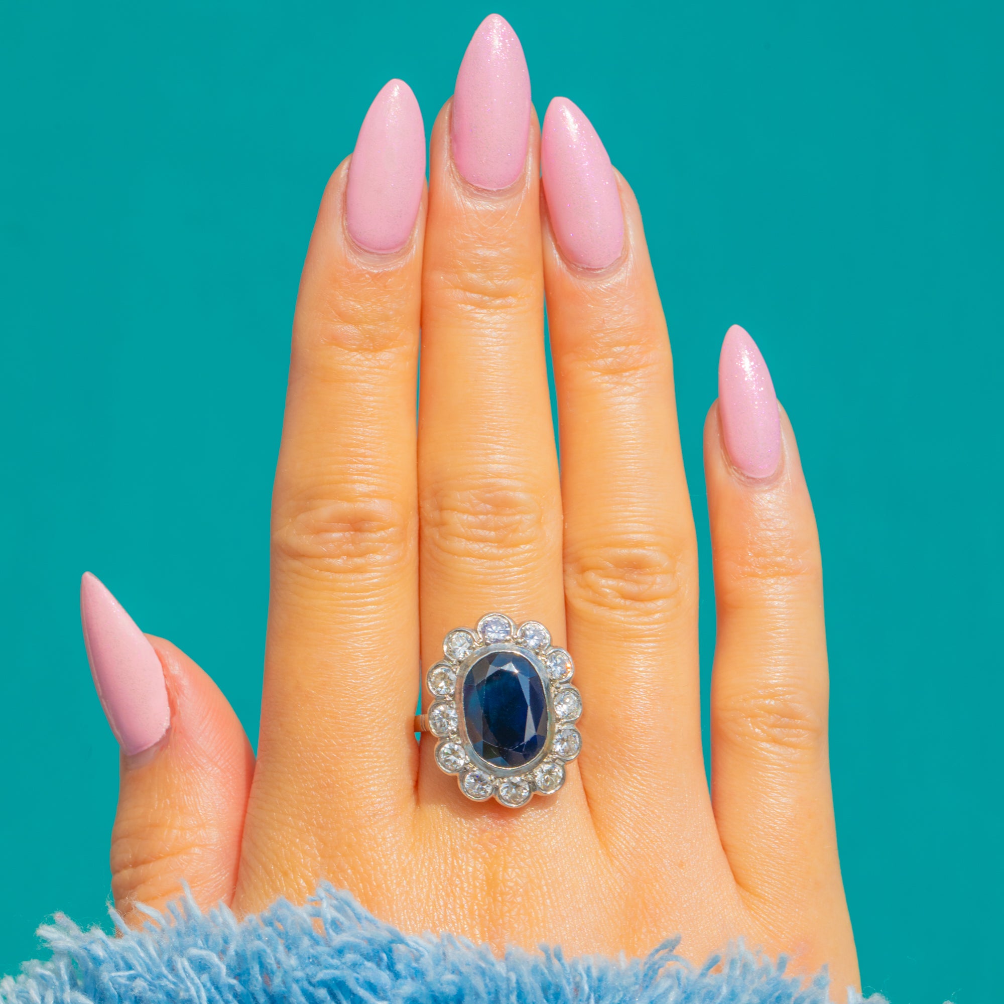 A radiant French Art Deco cluster ring showcasing a natural, unheated 5.25ct Sapphire of sumptuous, saturated blue, framed by a scalloped halo of twelve bright Diamonds. The oval Sapphire is set high in a refined bezel, its vivid hue offset by the crisp sparkle of the surrounding stones for a timeless, statement silhouette.