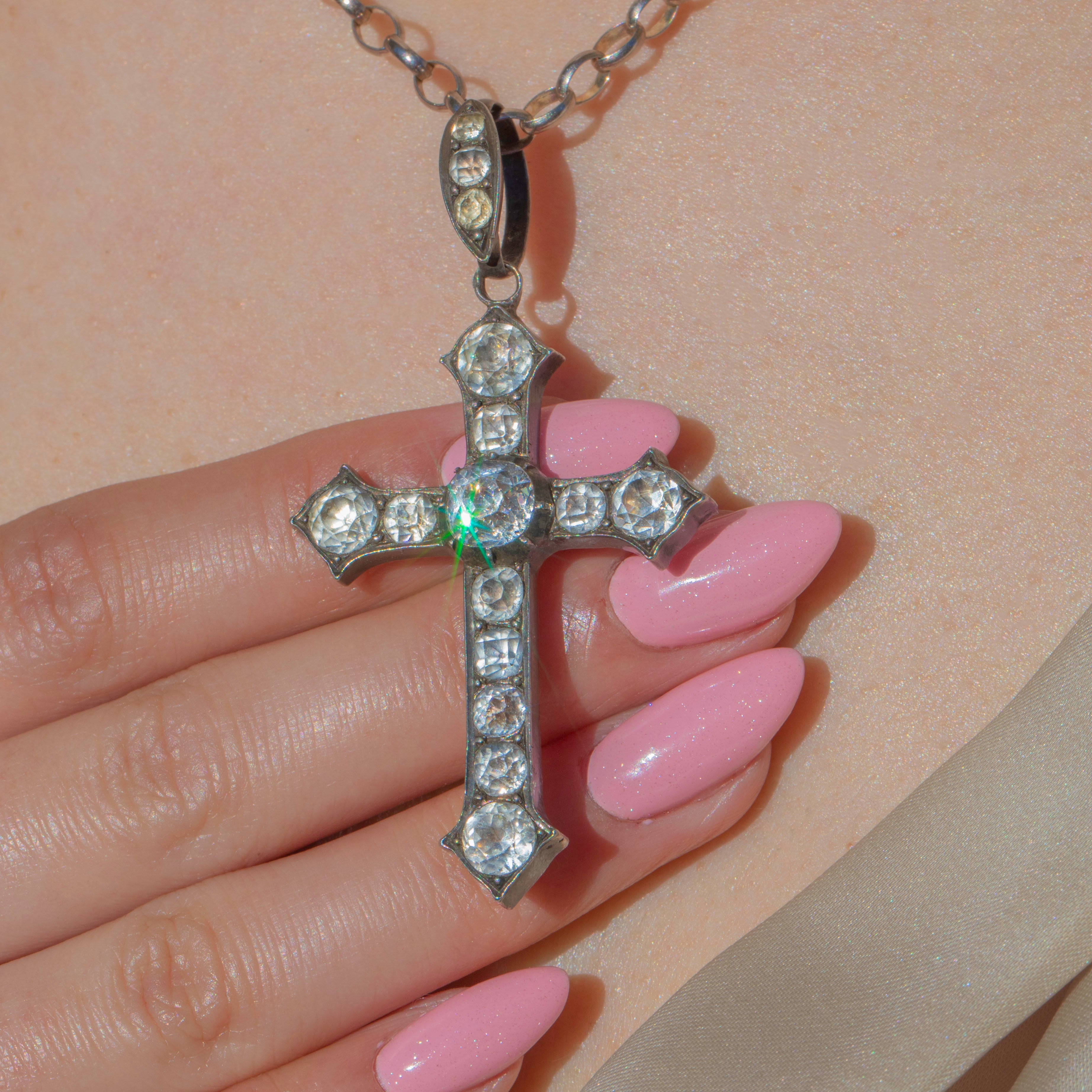 This antique French Silver Paste cross pendant will elevate your jewellery collection! Set with crisp white Paste gemstones and boasting a distinct Victorian gothic style, we love everything about this piece.