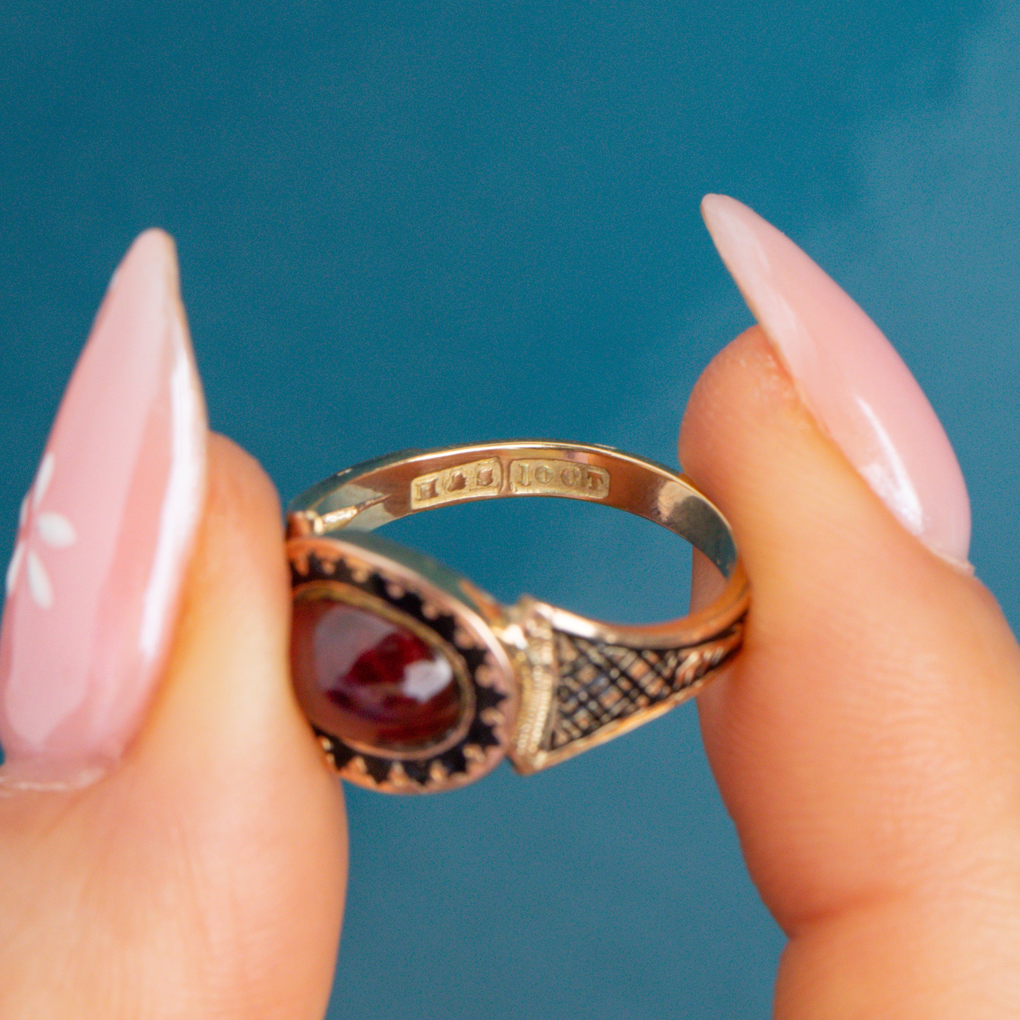 EXCELLENT. This antique 10ct Gold Garnet cabochon & black Enamel ring is in excellent condition! The Gold is buttery throughout and the band has retained its rounded form well, with nice clear stamps on the inside. The Garnet is smoothly domed and securely set, free from chips or abrasions and the Enamel is pristine with no wear to note. This superb piece of Victorian will make a fine addition to any antique jewellery collection!