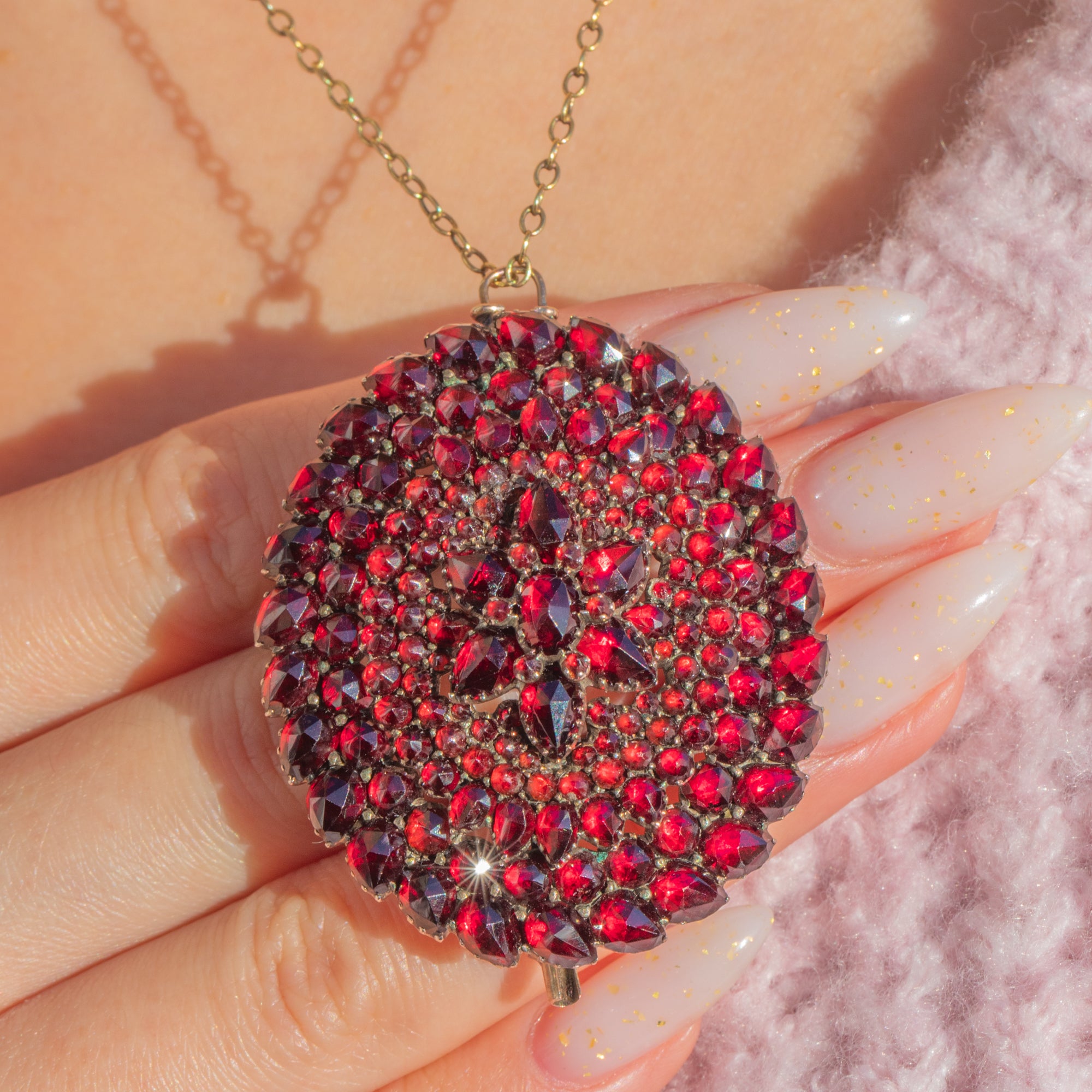 Glowing with saturated pomegranate-red light, this dramatic Victorian brooch pendant is a triumph of pavé-set Garnets. The domed cluster is arranged in concentric rosette tiers with a star-like centre, culminating in a scalloped fringe of pear-shaped stones—an opulent Victorian statement that shimmers beautifully on the neckline or lapel.
