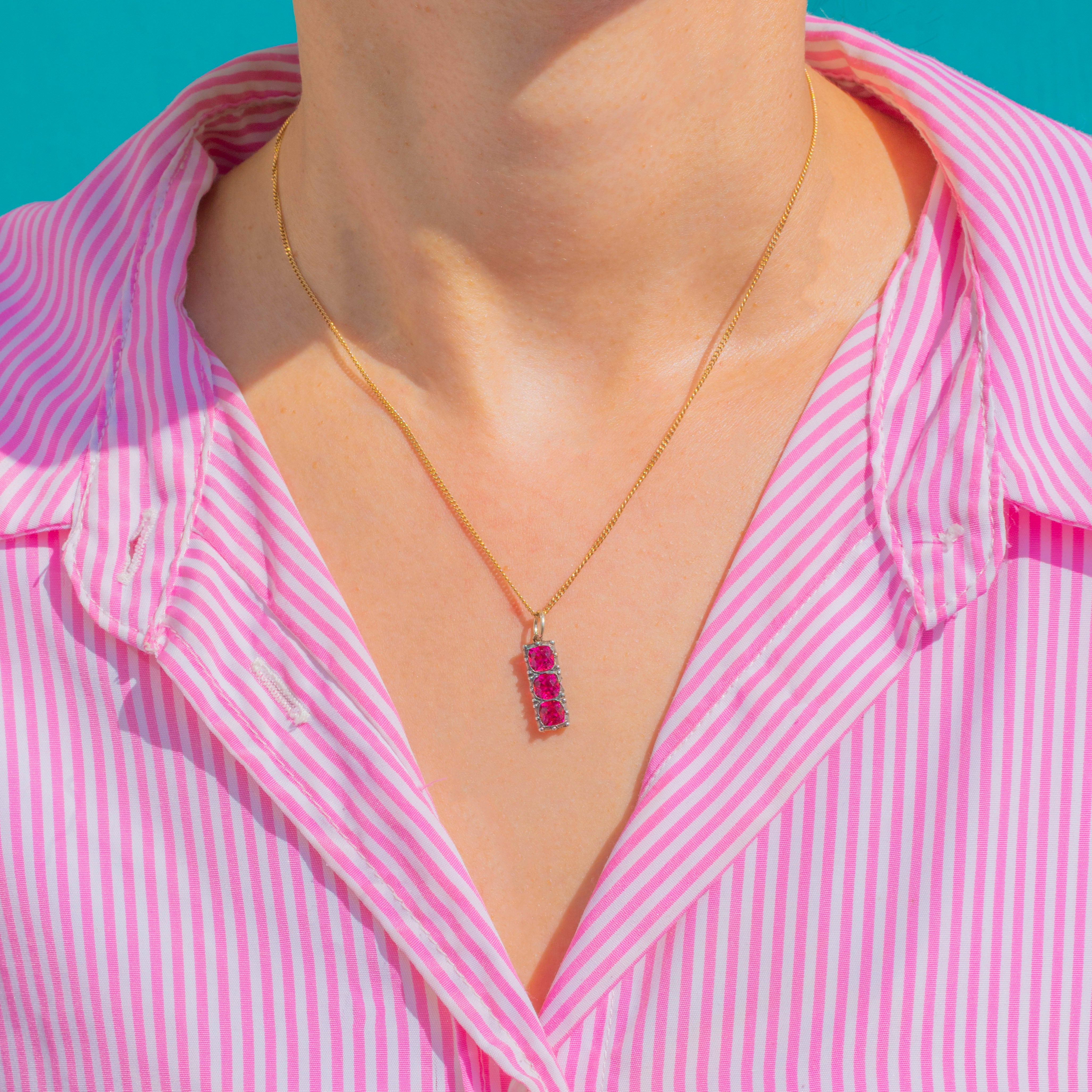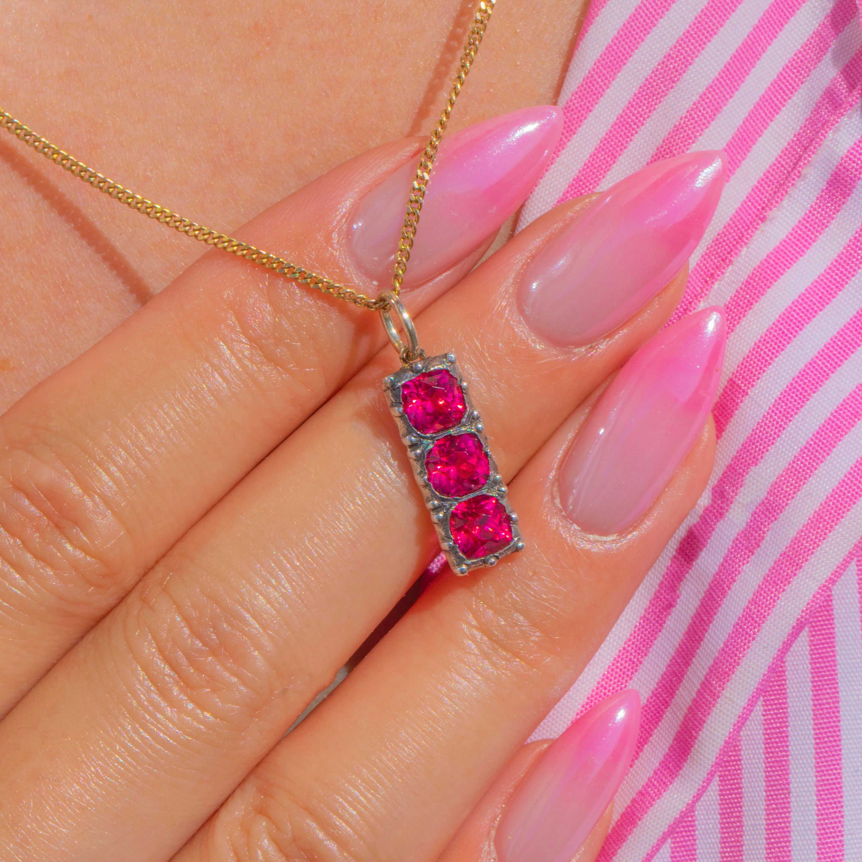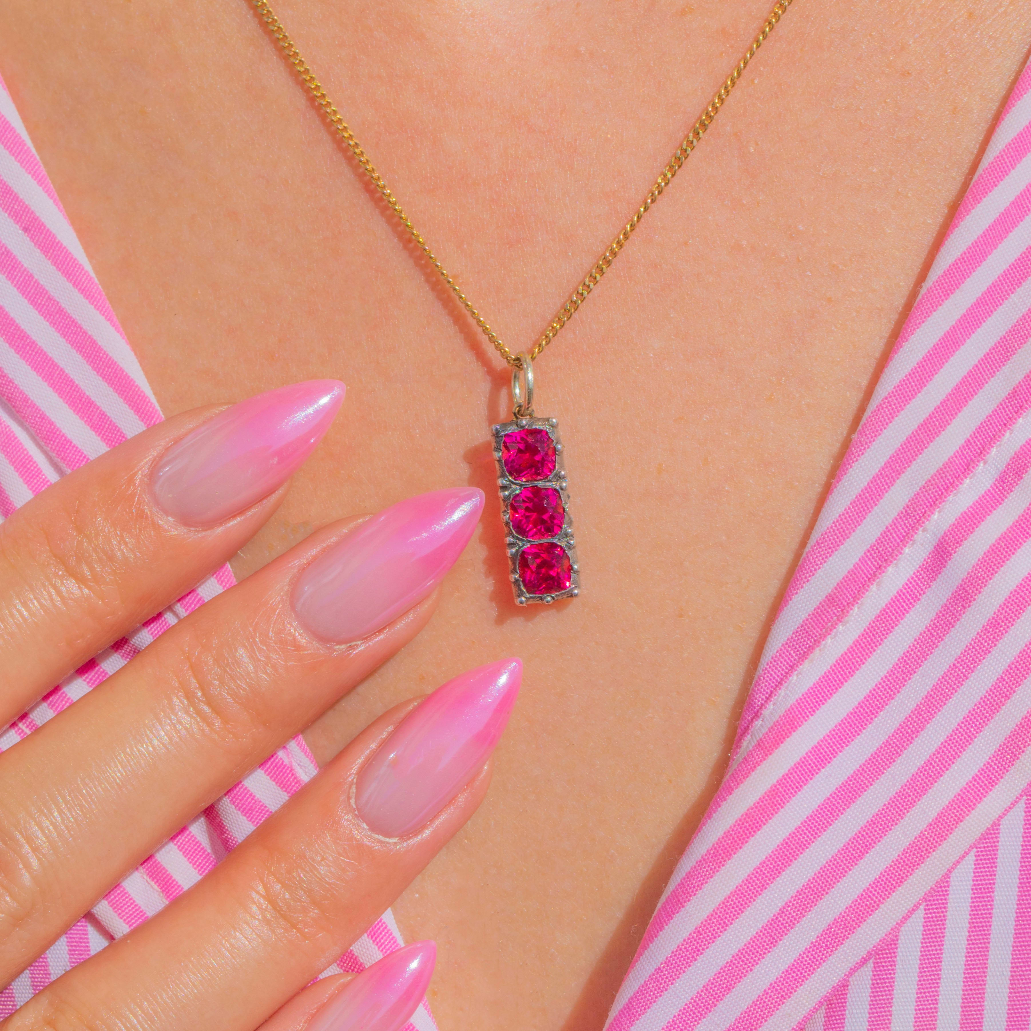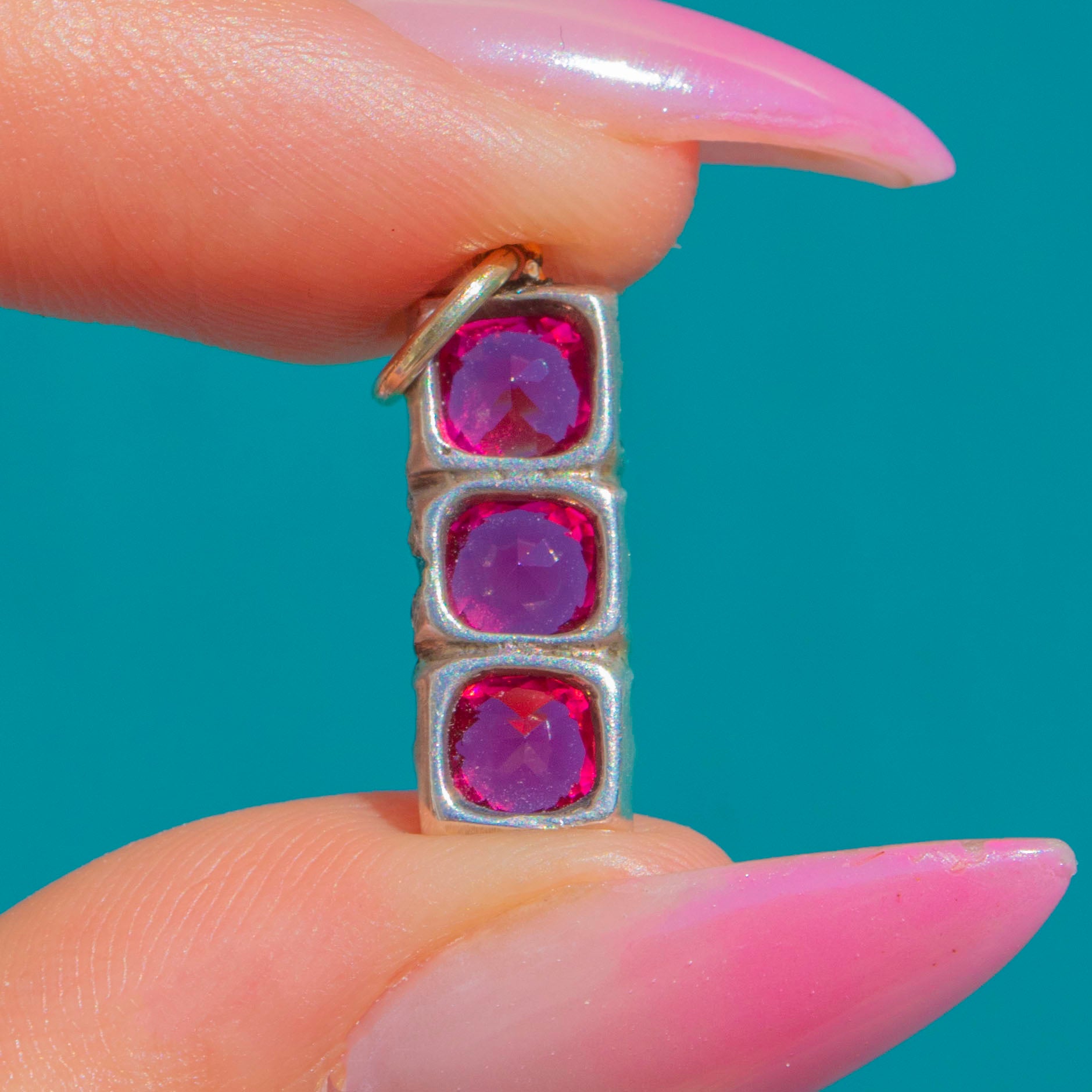 A vivid Edwardian drop charm, crafted in Silver with a 9ct Gold bail and set with three hot Pink Paste stones. The saturated pink hue gives this antique piece a wonderfully playful flash of colour, catching the light beautifully as it moves.