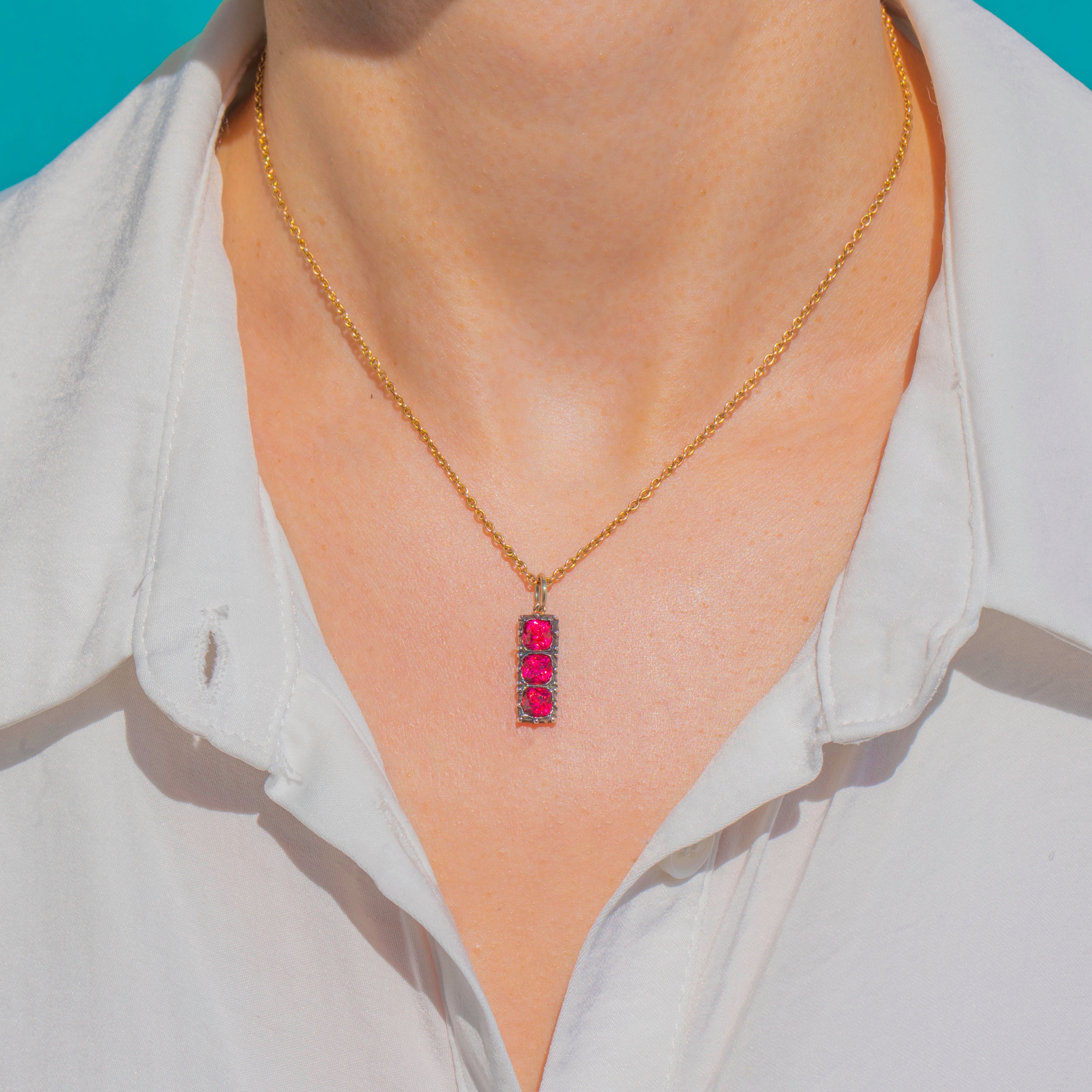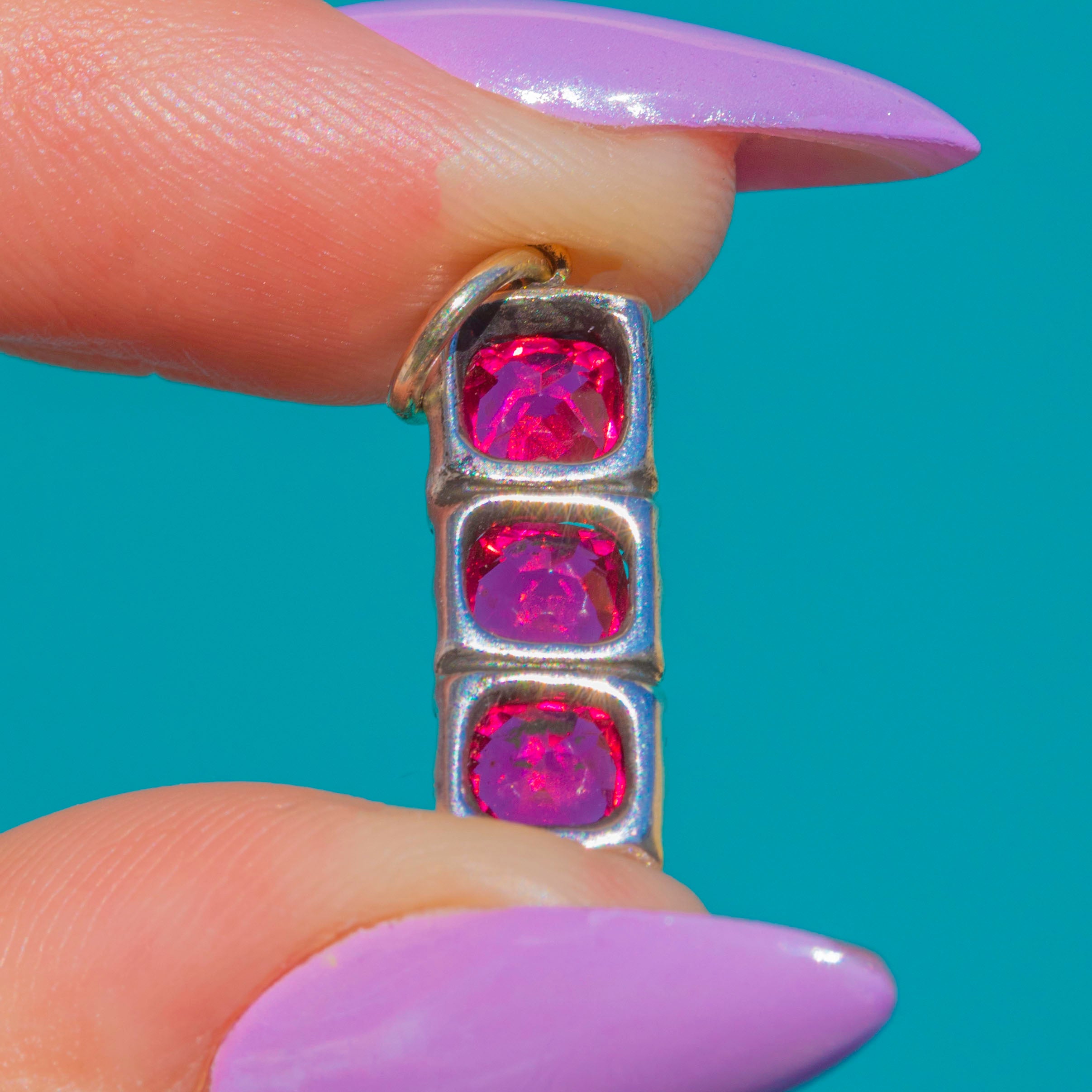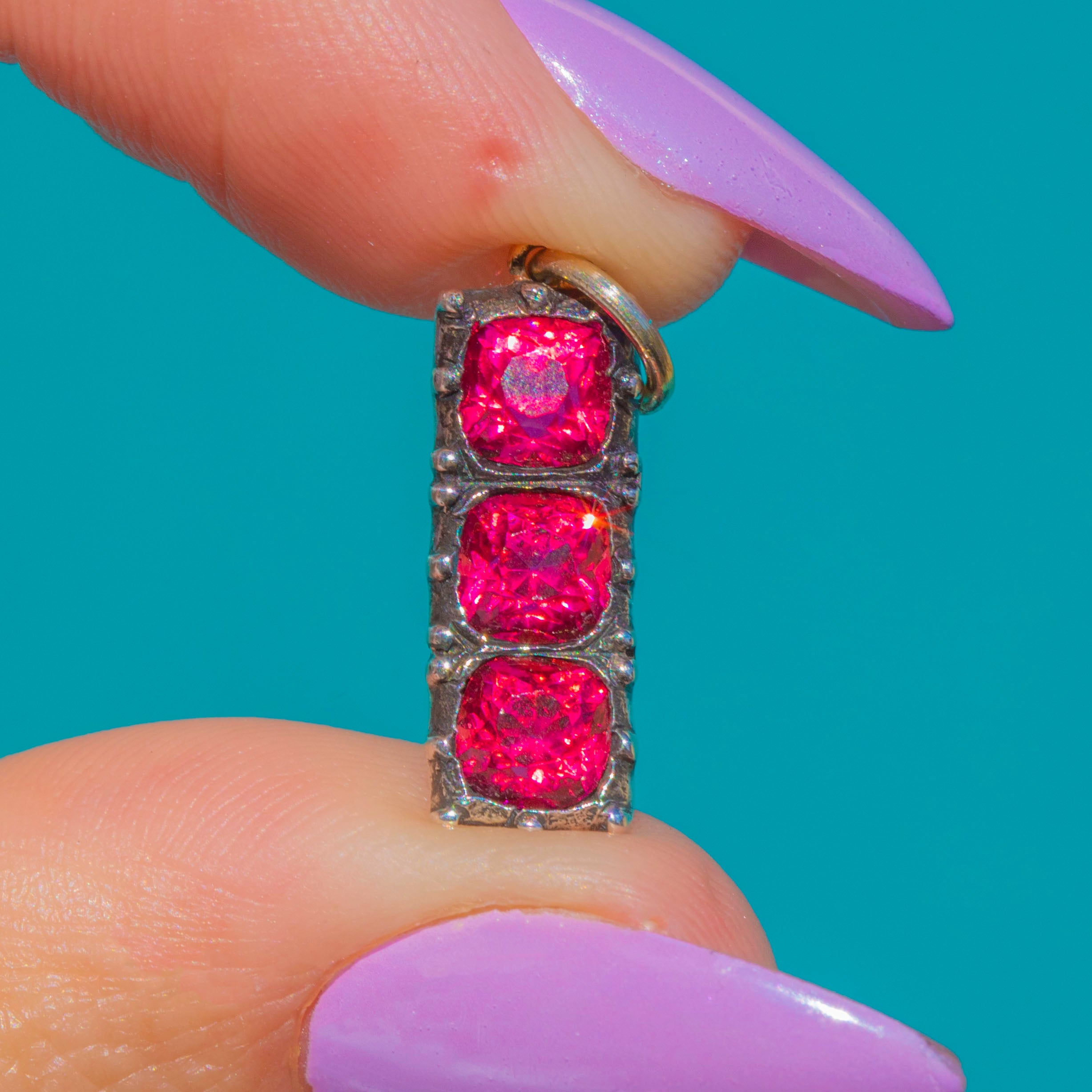 This antique Edwardian drop charm dates to circa 1901 and is a wonderfully eye-catching little piece. Tests as Silver with a 9ct Gold jump ring, it is set with three vivid hot pink Pastes in a neat vertical arrangement, creating a bright pop of colour with lovely antique charm.