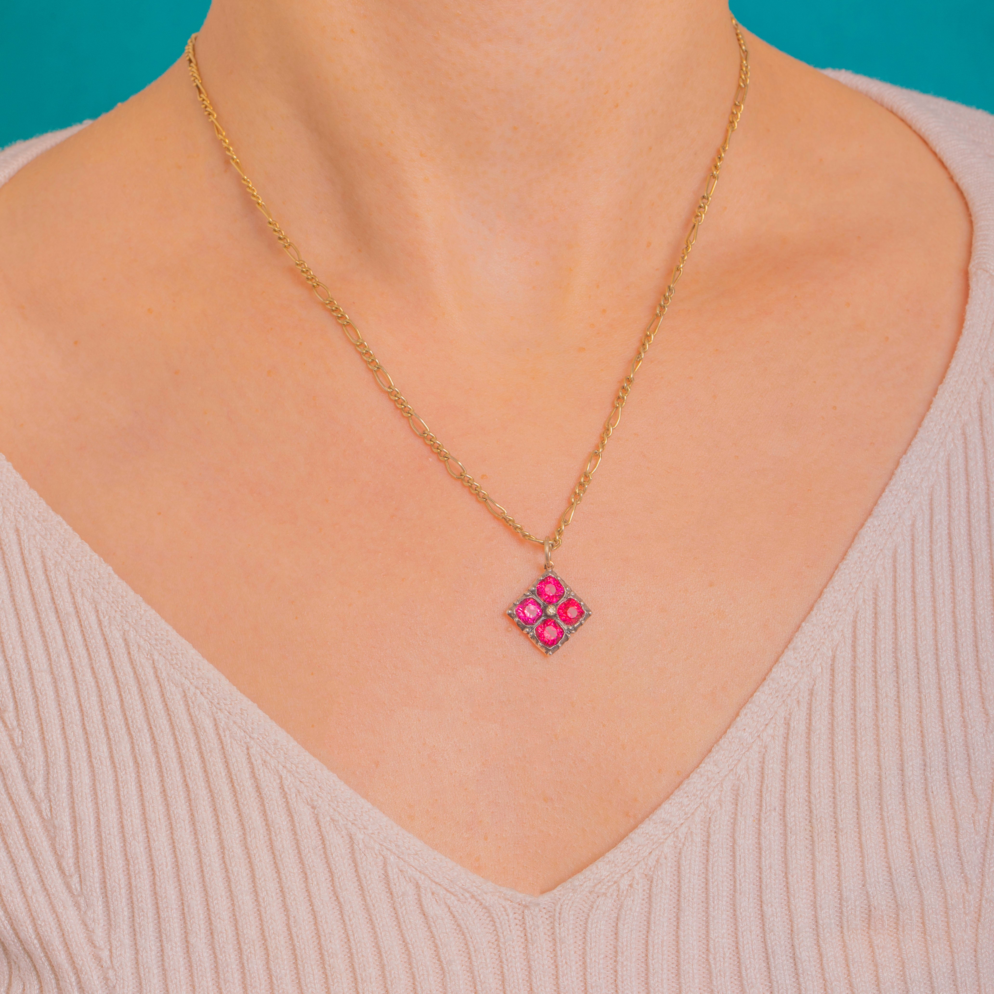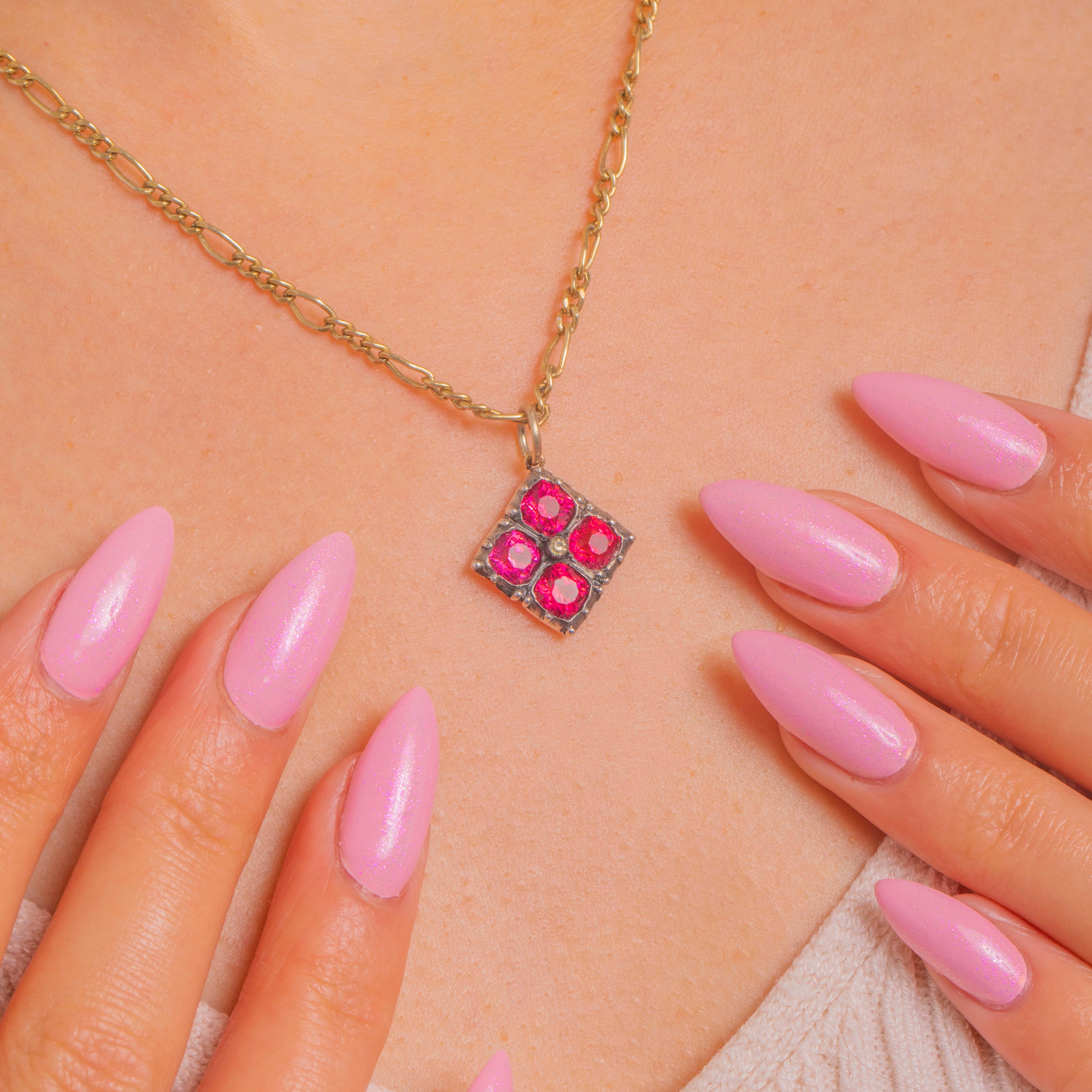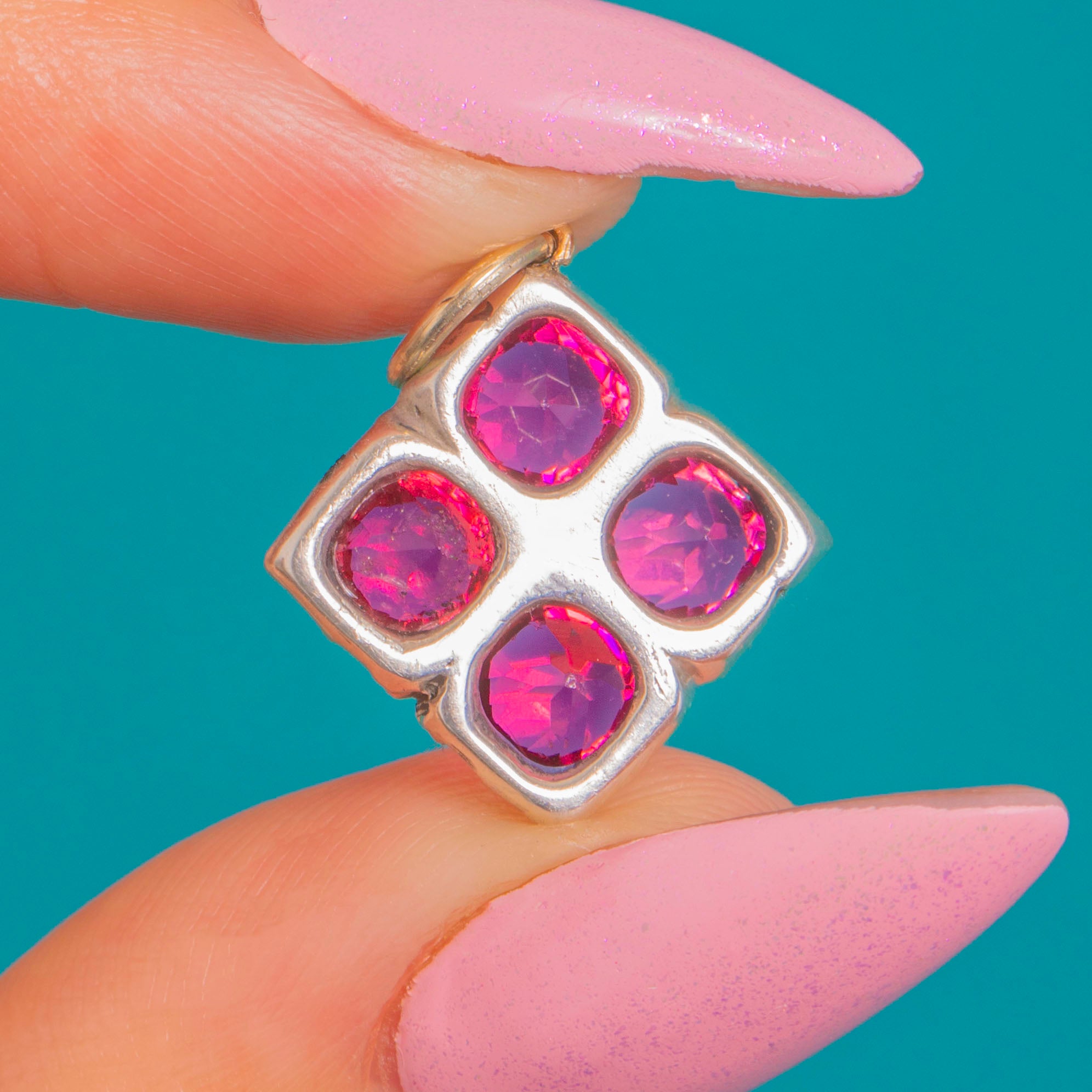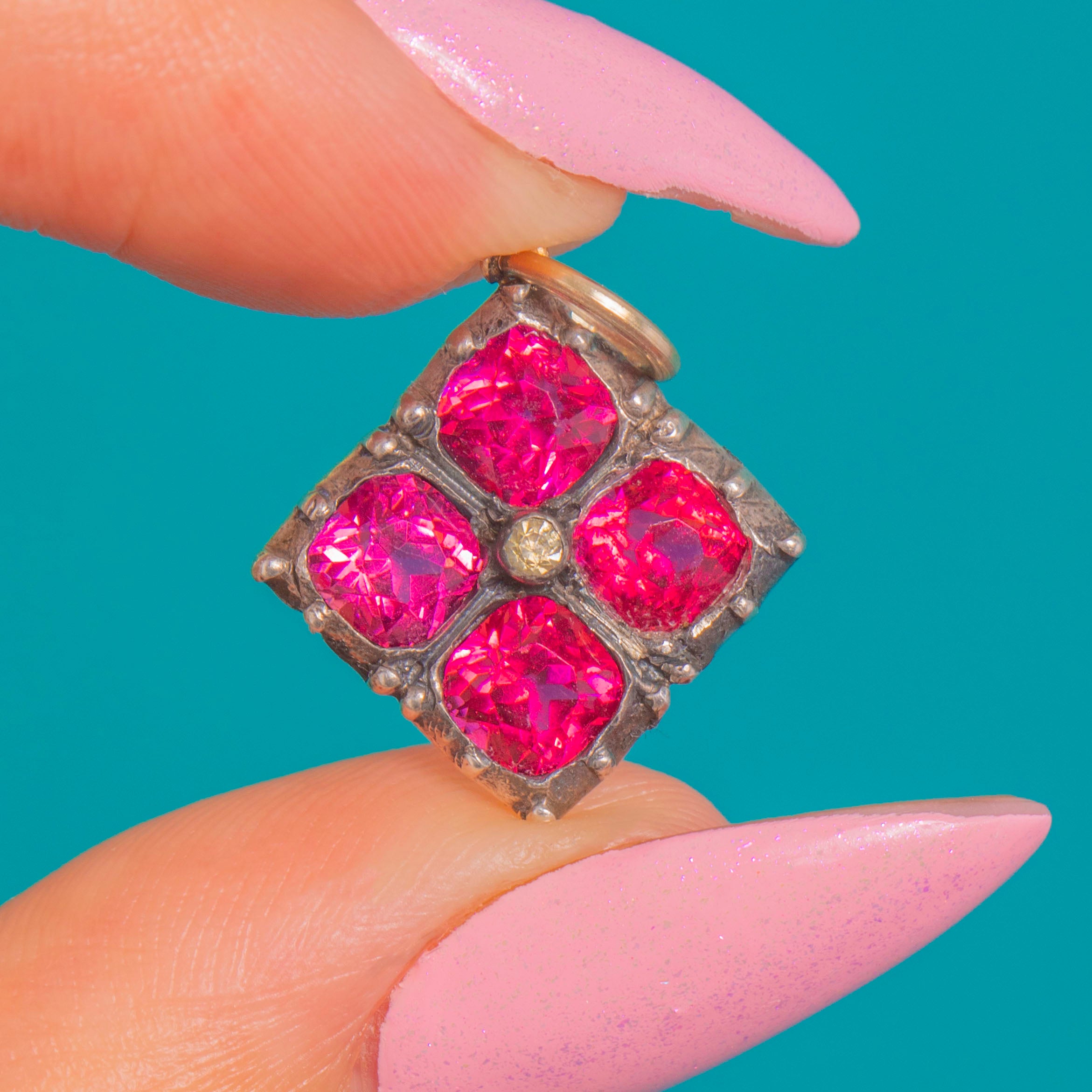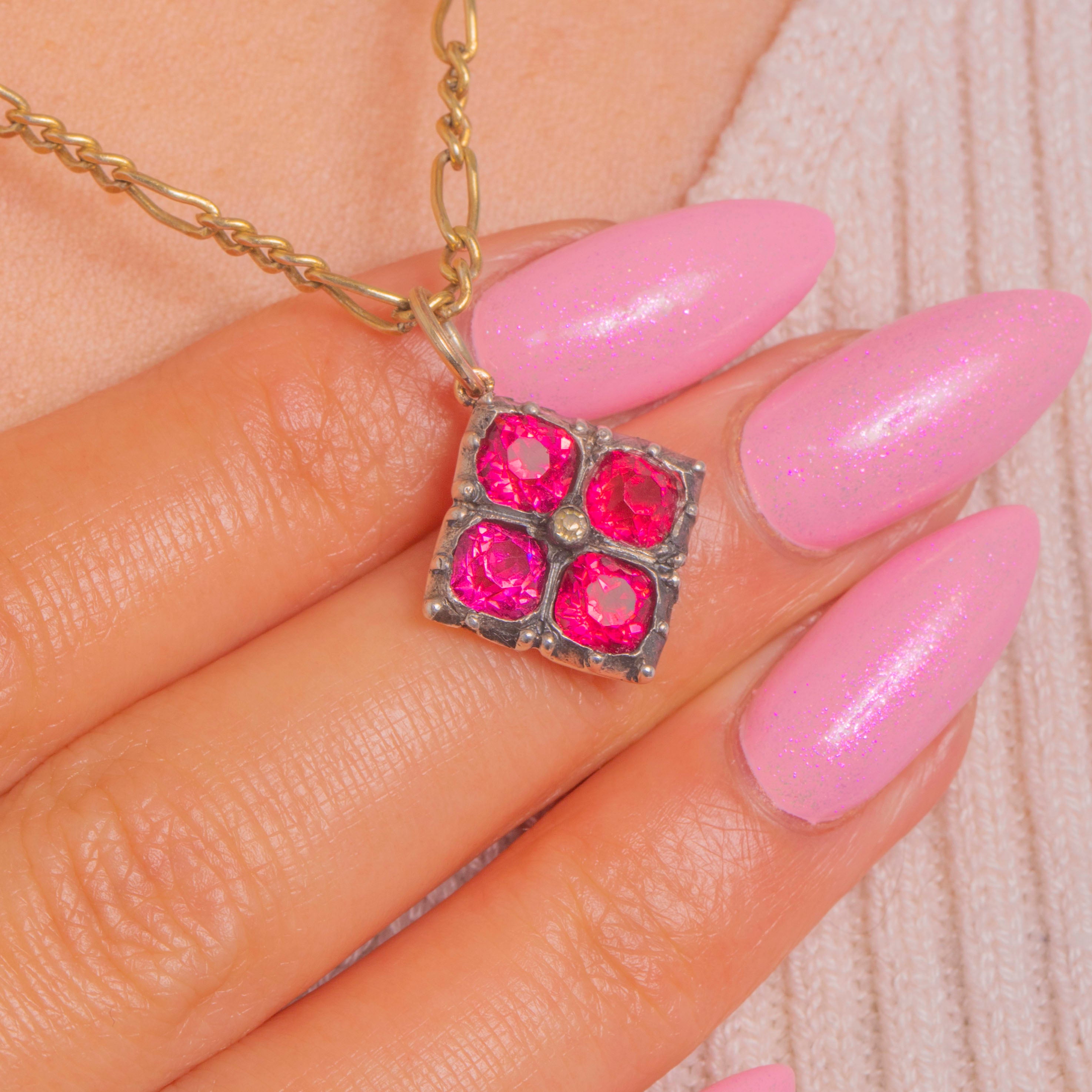 A vibrant Edwardian treasure, this petite flower charm blooms with four vivid Pink Paste stones arranged in a refined quatrefoil. Each jewel sits in a raised Silver collet, their lively fuchsia hue accentuated by delicate beaded junctions and a softly patinated finish that lends beautiful depth and character.