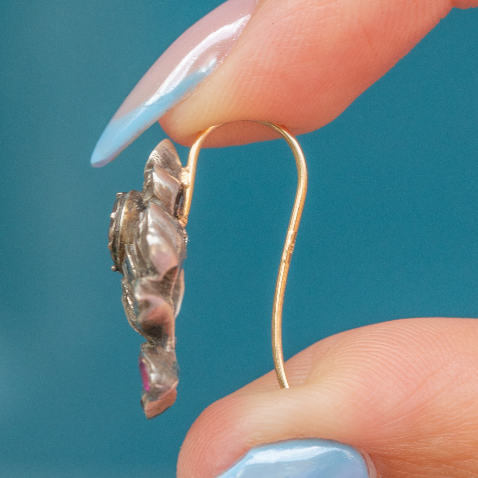 MATERIALS: Tests as Silver, 9ct Gold hooks, Natural unheated Rubies (1.38ct), Rose-Cut Diamonds.