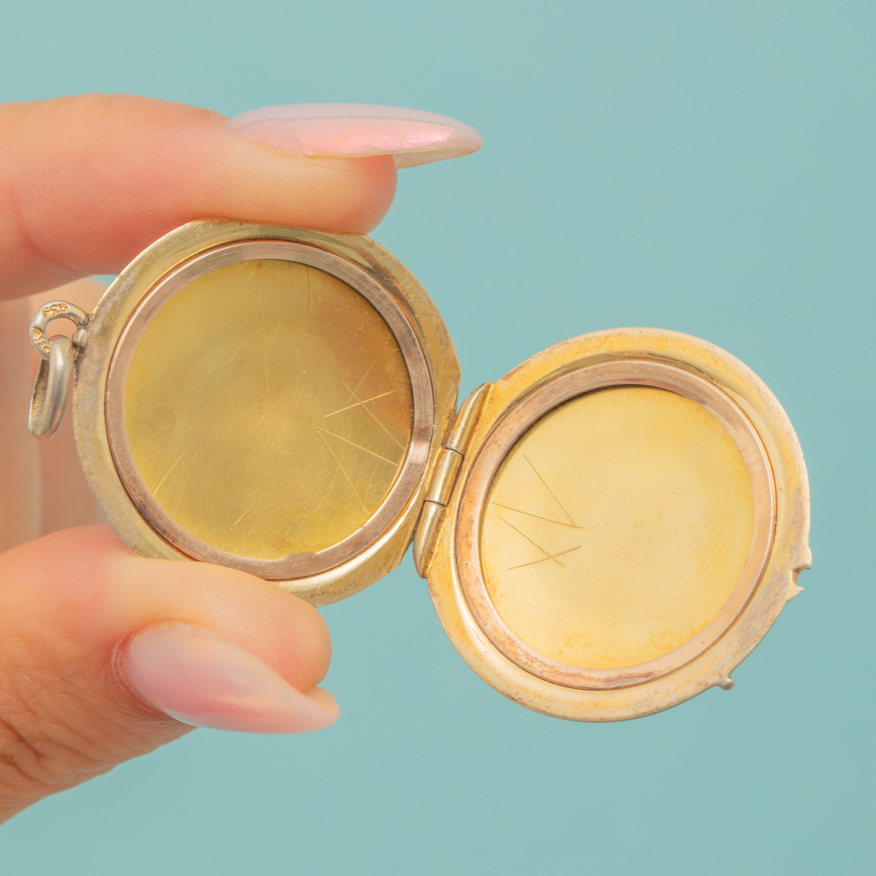 Crafted from glossy Silver, this circular Art Deco locket is complemented by a delicate Guilloché Enamel front. With intricate swirled engravings providing texture and depth, paired with the vibrant green Enamel, she is a minty delight!