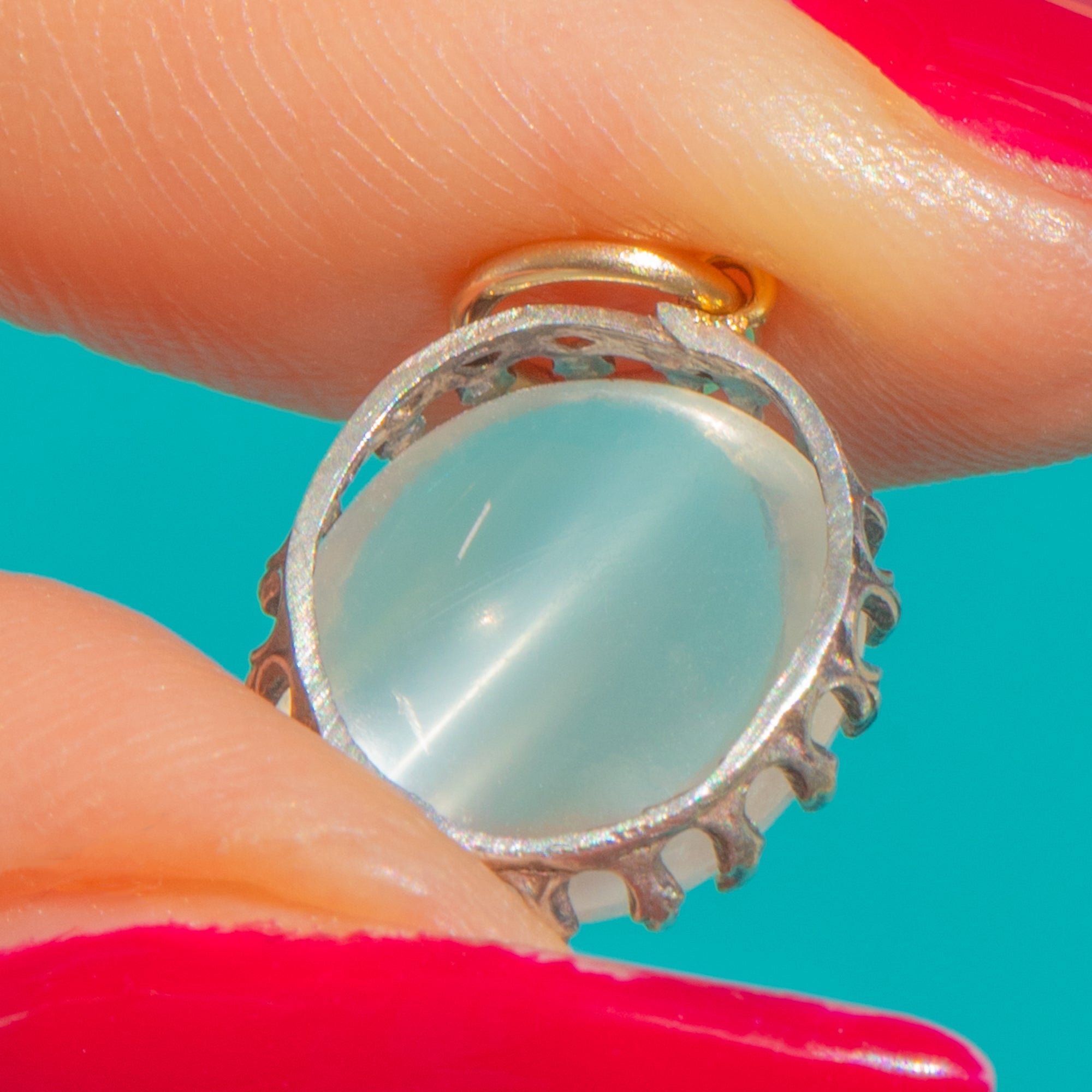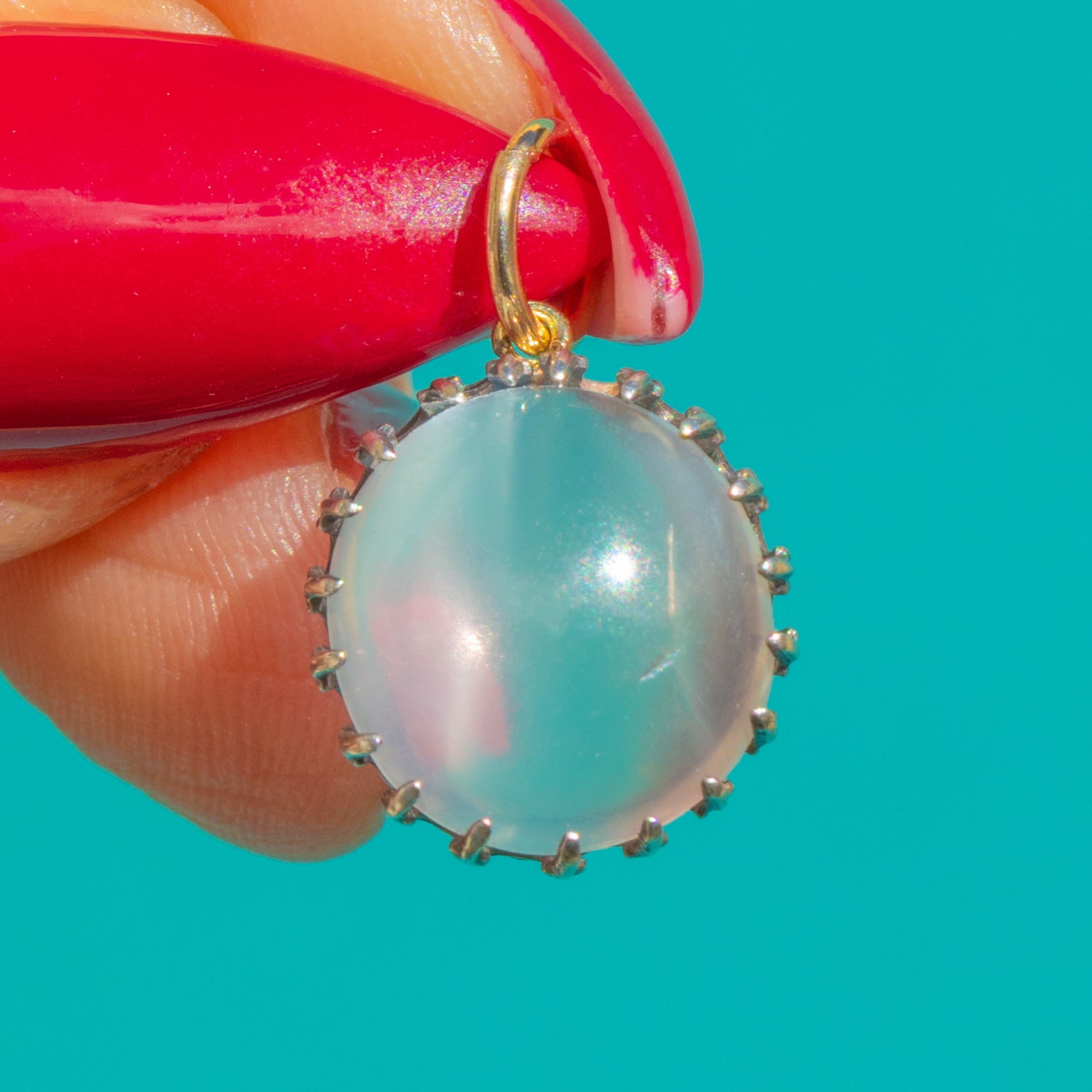 A luminous Edwardian Moonstone charm, crafted in cool Silver with a delicate scalloped crown setting that cradles a domed cabochon. The gem shimmers with that ethereal blue-white adularescence Moonstone is loved for, giving a soft, romantic glow.