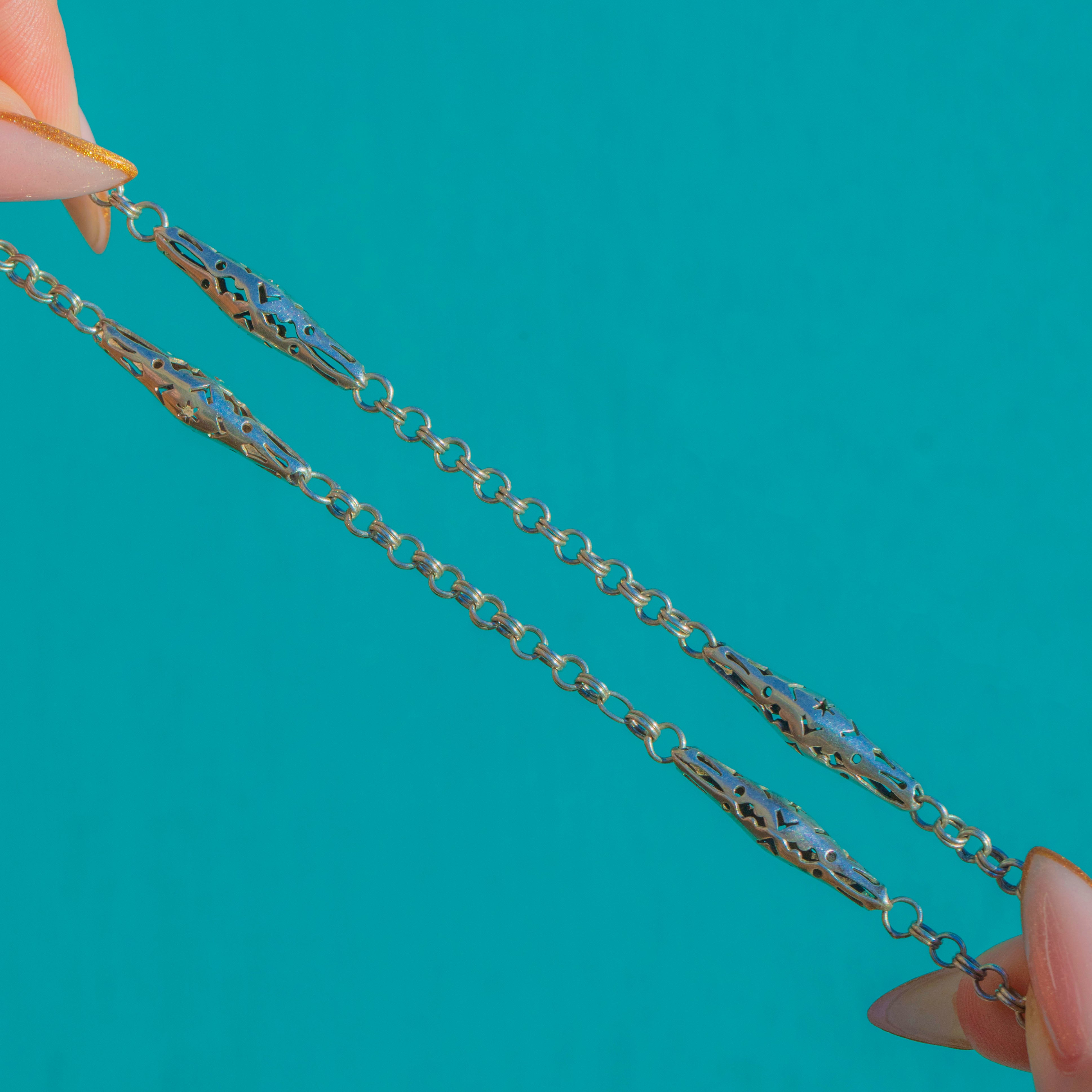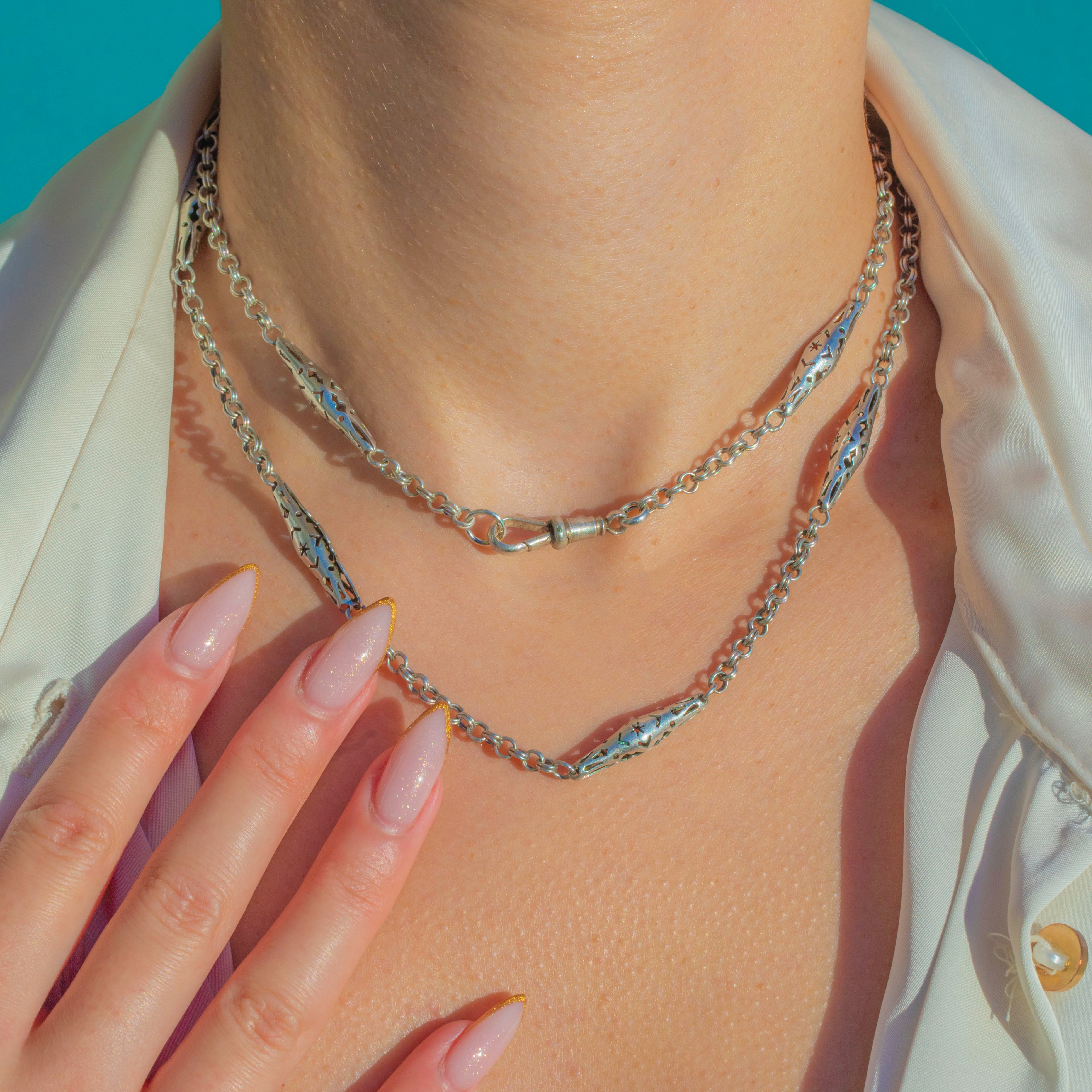 This Victorian Silver chain necklace is full of character, showcasing beautifully formed lozenge links with striking pierced star motifs. The star-cut panels bring a soft, celestial elegance, while the cool glow of the Silver gives the piece an effortlessly wearable, timeless feel.