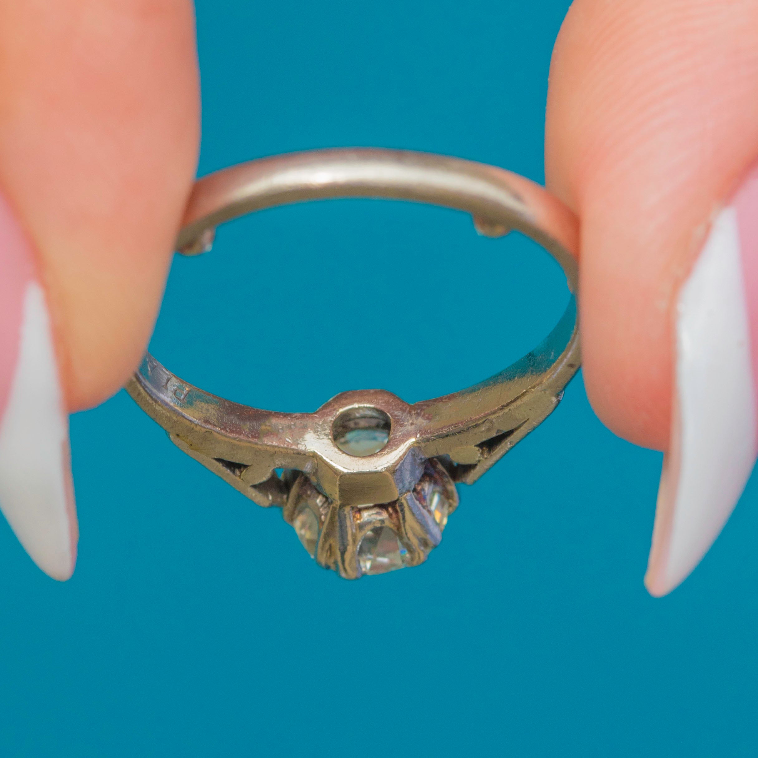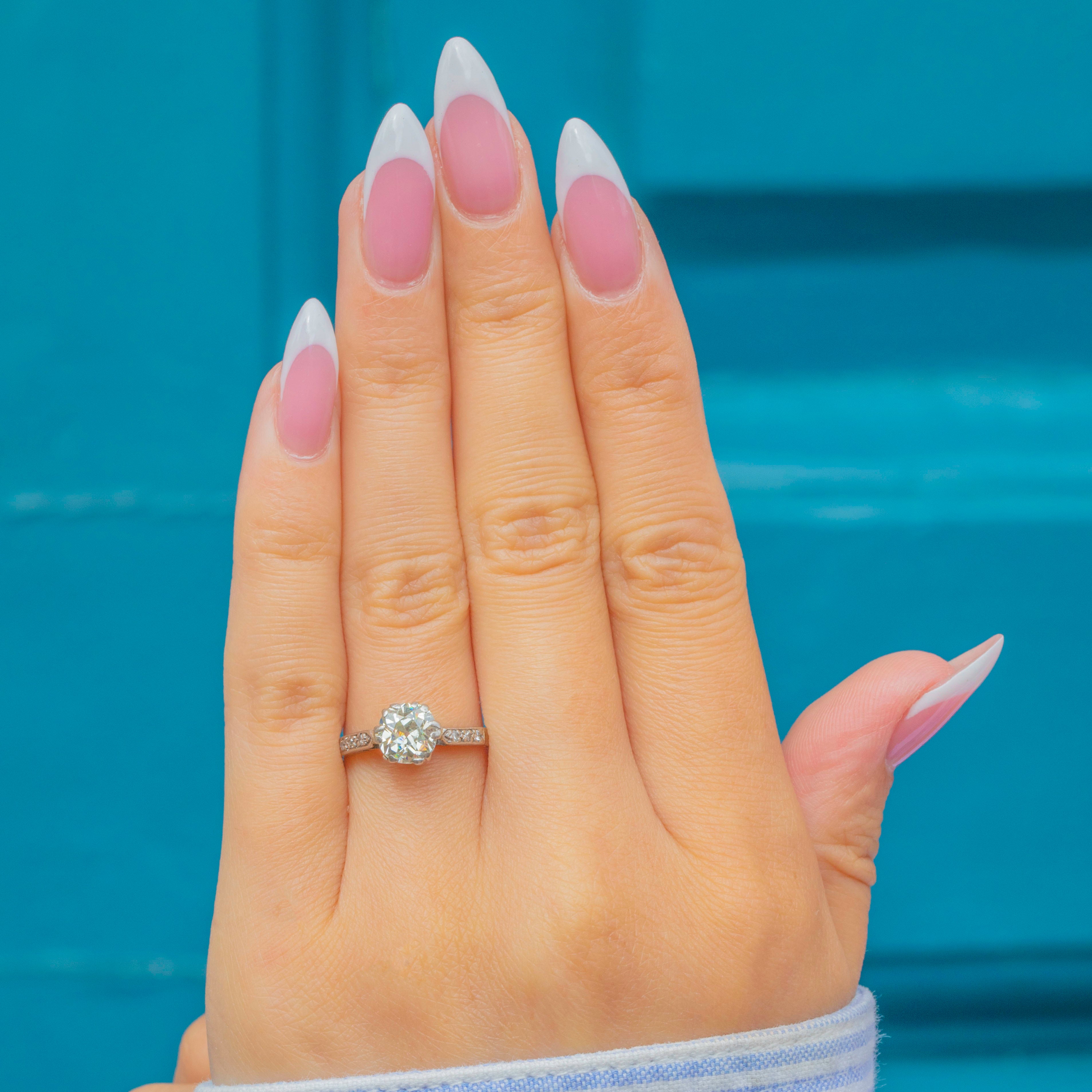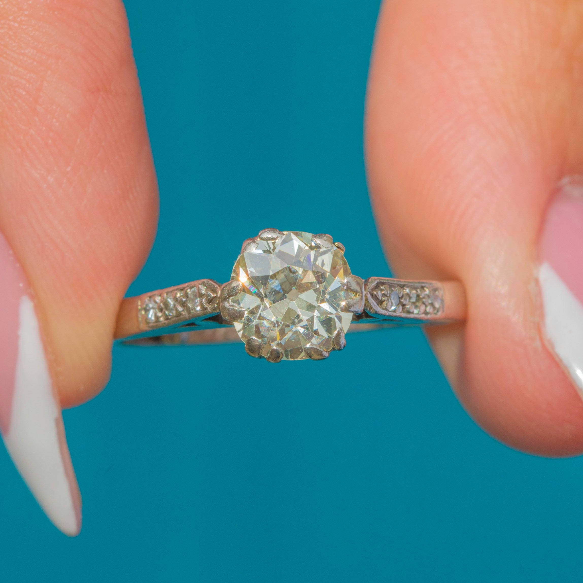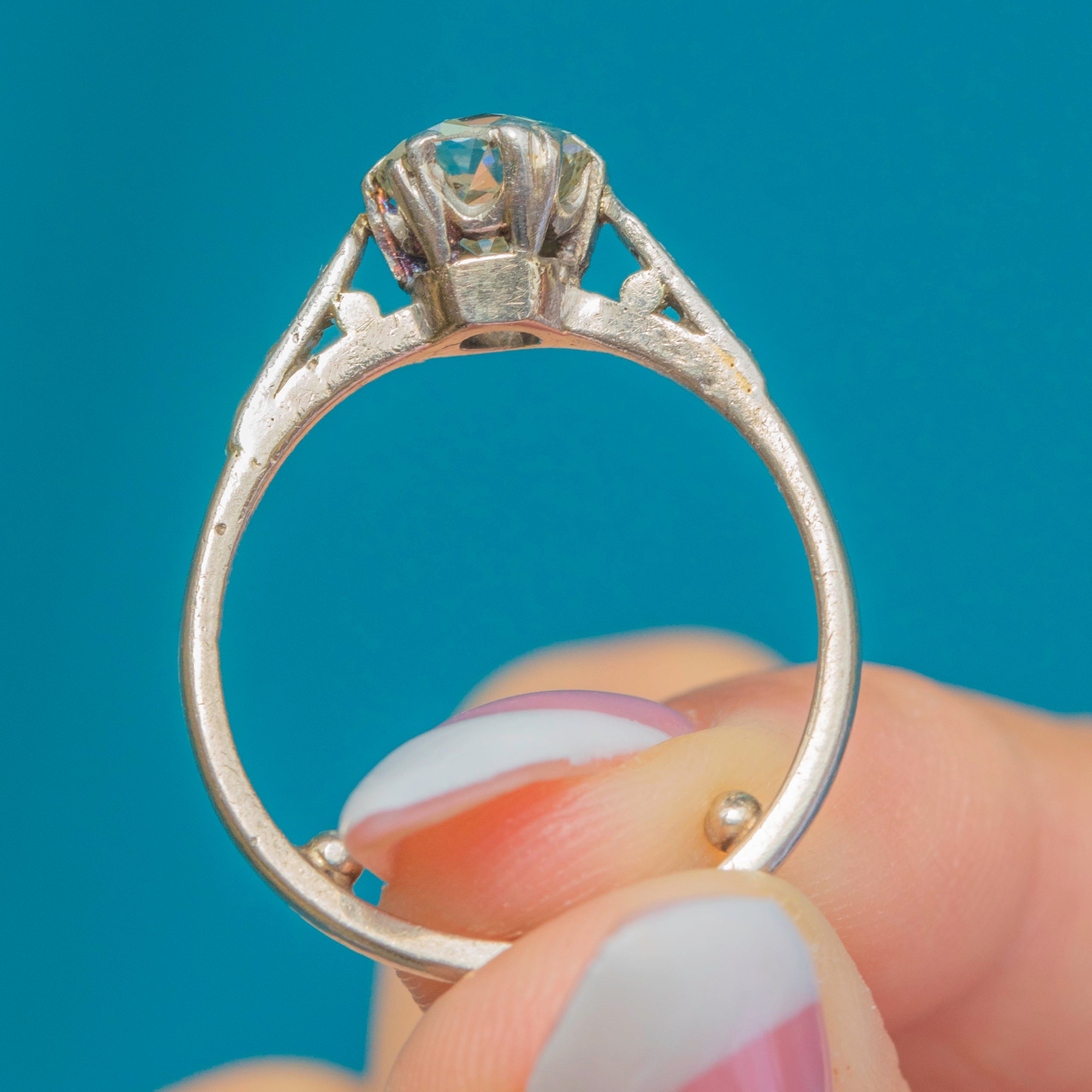 The central antique Diamond is bright and charming- secured by double typical 1929’s era claw details and accented on each side by petite Diamond accents to the shoulders, lending a delicate sparkle while keeping the focus on the beautifully faceted old-cut centre.
