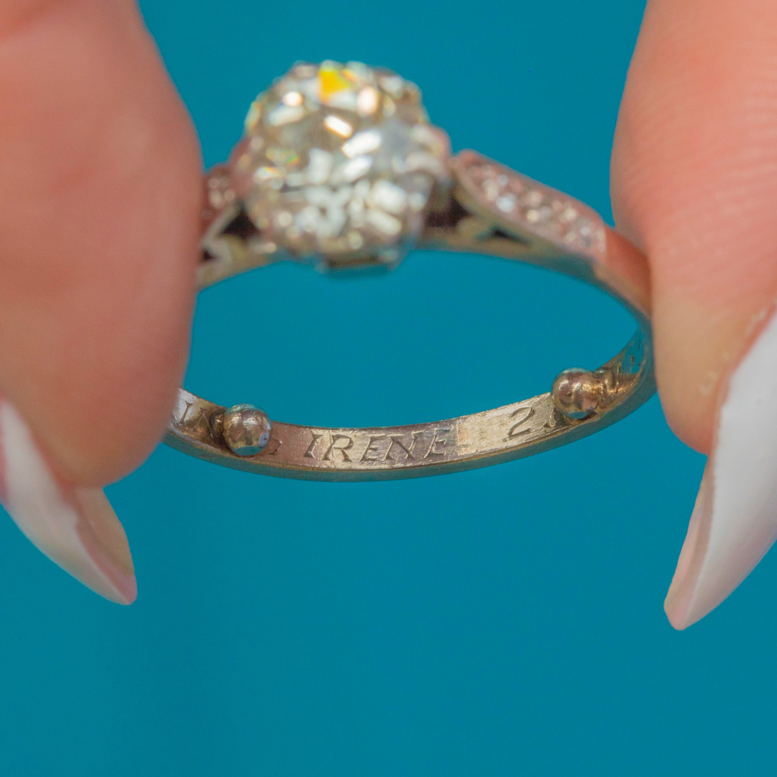 VERY GOOD: Overall very good condition. One claw on a double claw setting is missing, which may slightly affect the security of the centre Diamond long term, but currently the Diamond is perfectly secure. The Old European Cut Diamond and shoulder Diamonds remain bright and beautifully presented. The Platinum mount shows only light wear consistent with careful use. Engraving detail on the inside of the band is slightly worn but reads "Iain and Irene, "2. *. 53"