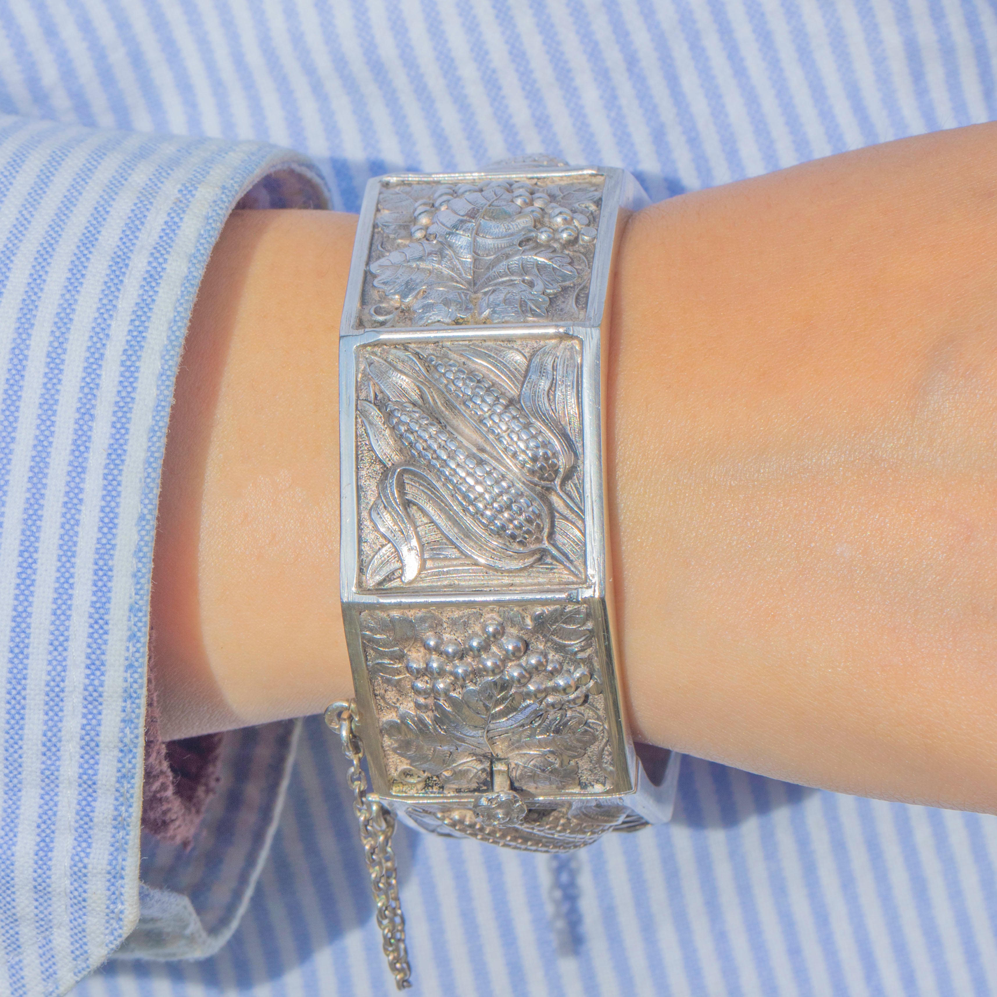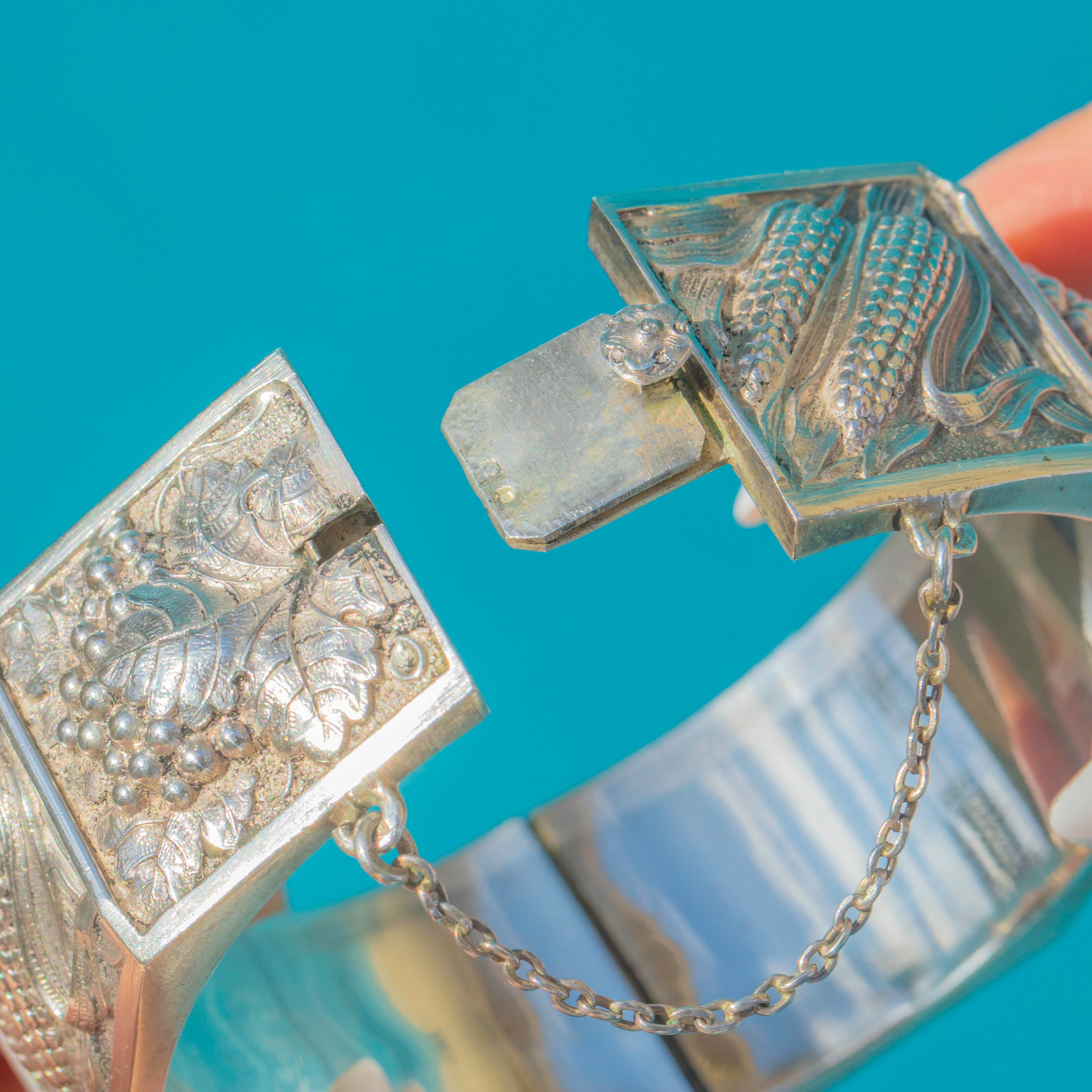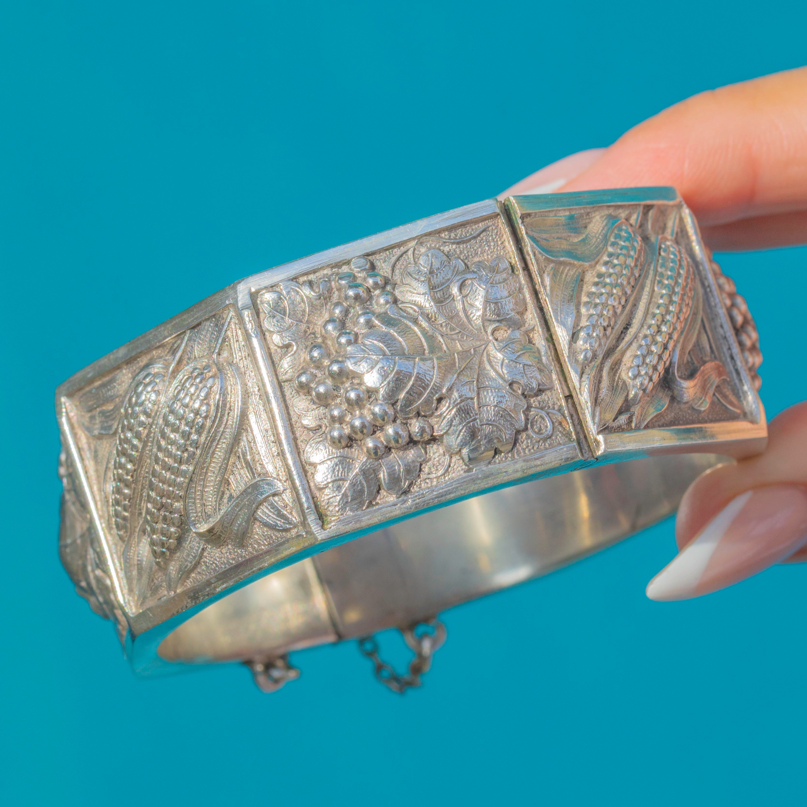 EXCELLENT. This splendid antique Portuguese Silver harvest motif bangle is in excellent condition! Each of the panels has a beautifully detailed harvest motif which has accrued a glorious patina that makes every millimetre stand out. The bangle closes securely and is complete with a safety chain for added security. The Silver has remained wonderful throughout the years and there is really no damage to note other than subtle signs of wear visible on the inside of the band.