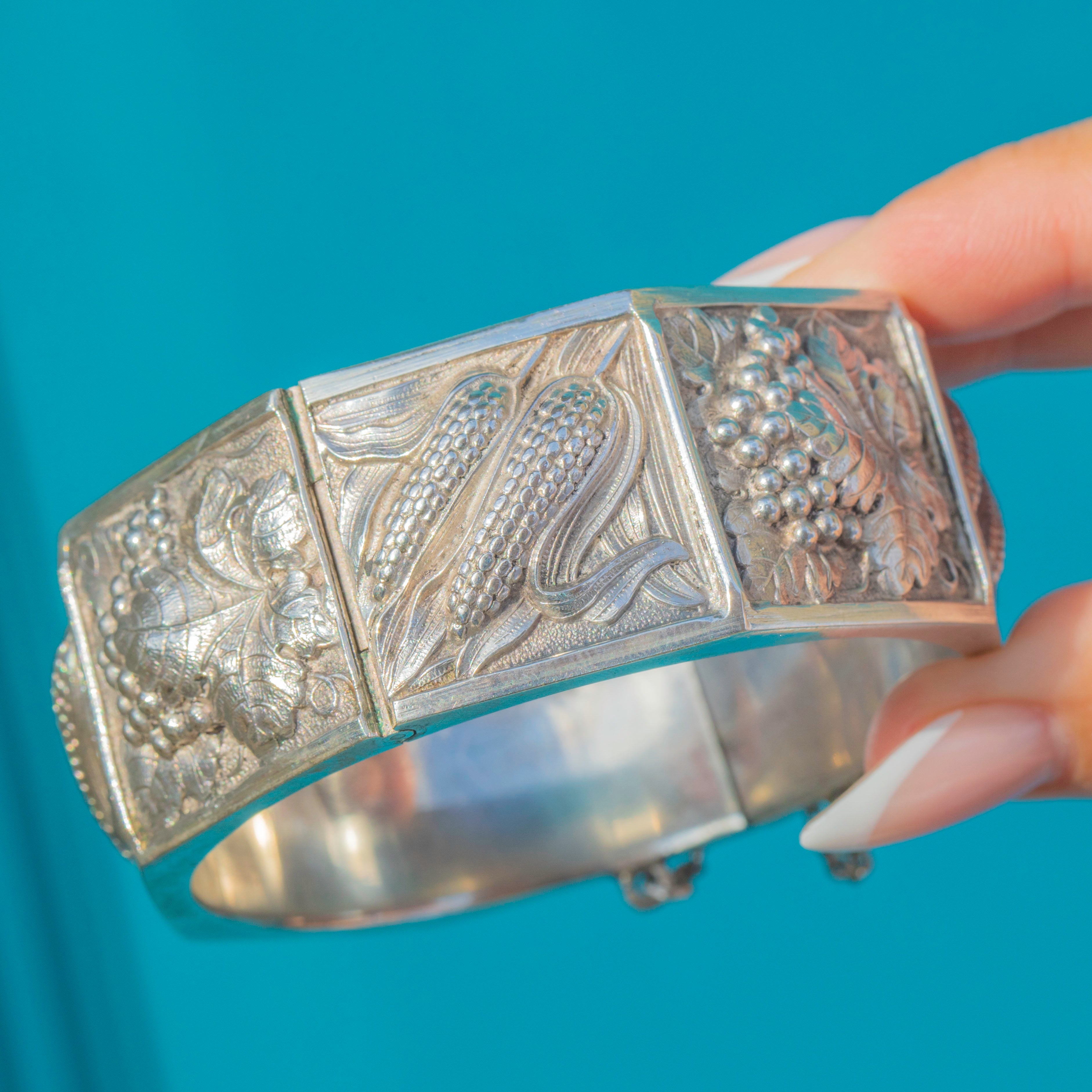Antique Portuguese Silver Harvest Motif Bangle, 7"