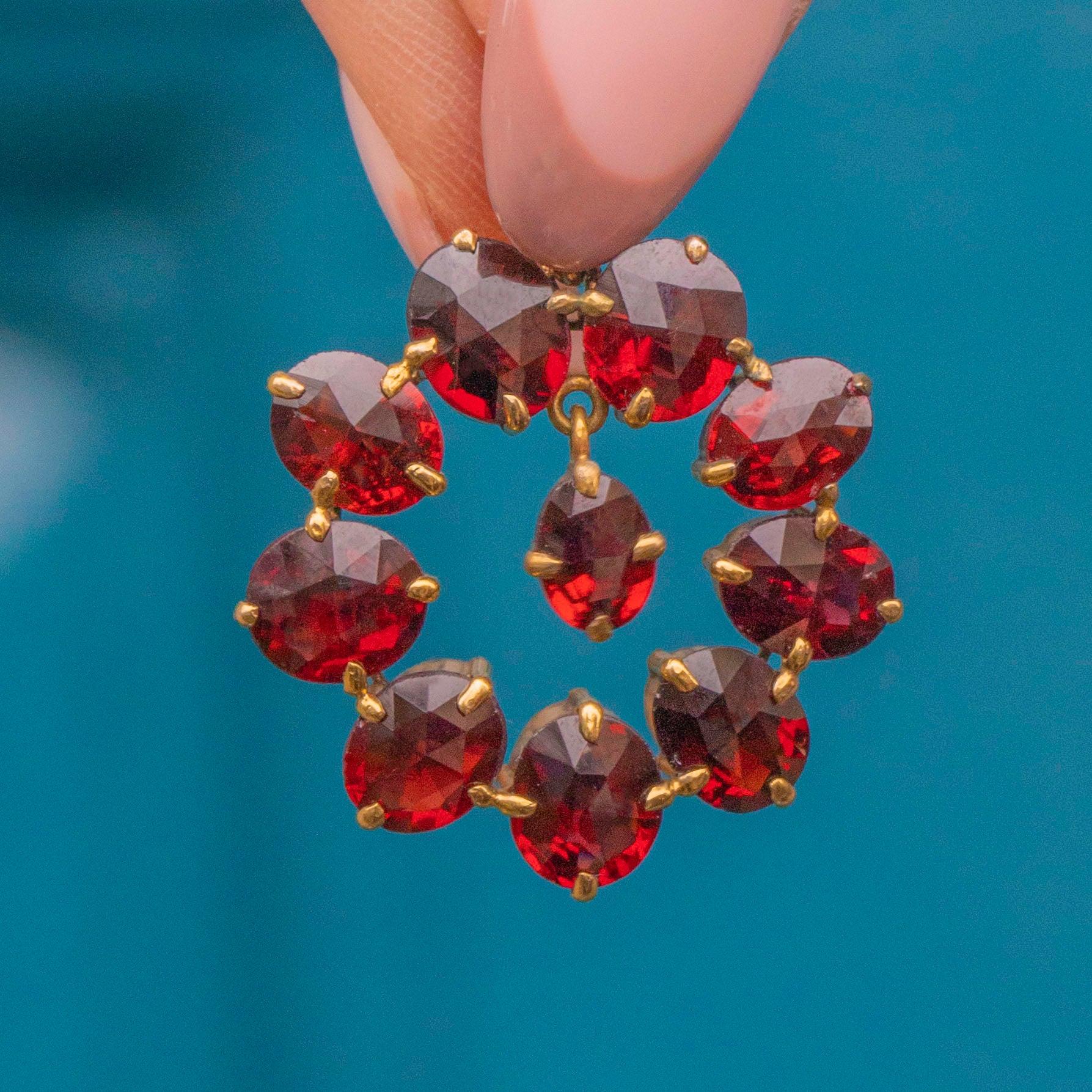 Crafted from buttery 9ct Gold, this roundel pendant features ten brilliant Garnets, boasting 8.86ct. Each Garnet radiates a rich, crimson hues from their gorgeous facets, and is complimented effortlessly by the warmth of their settings.