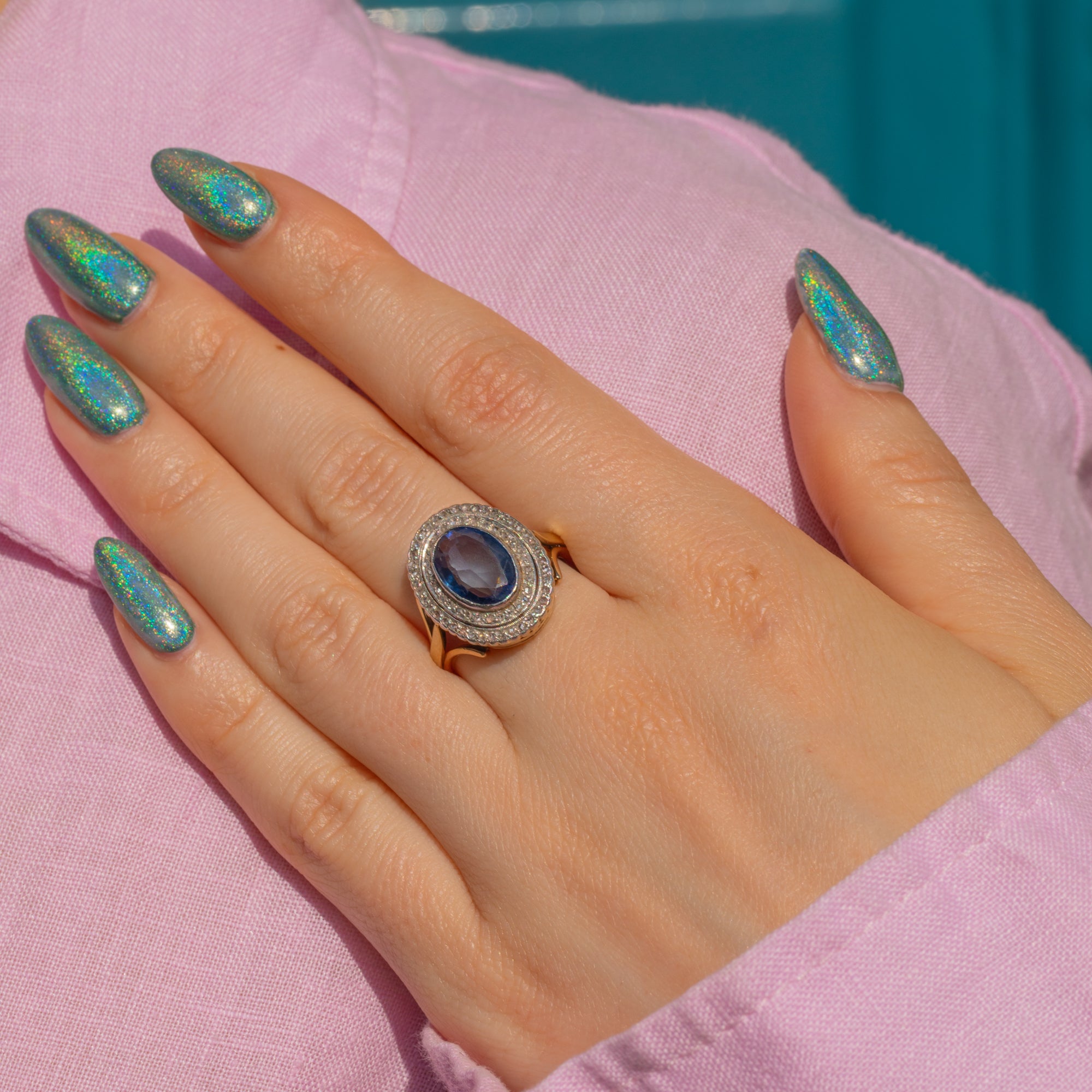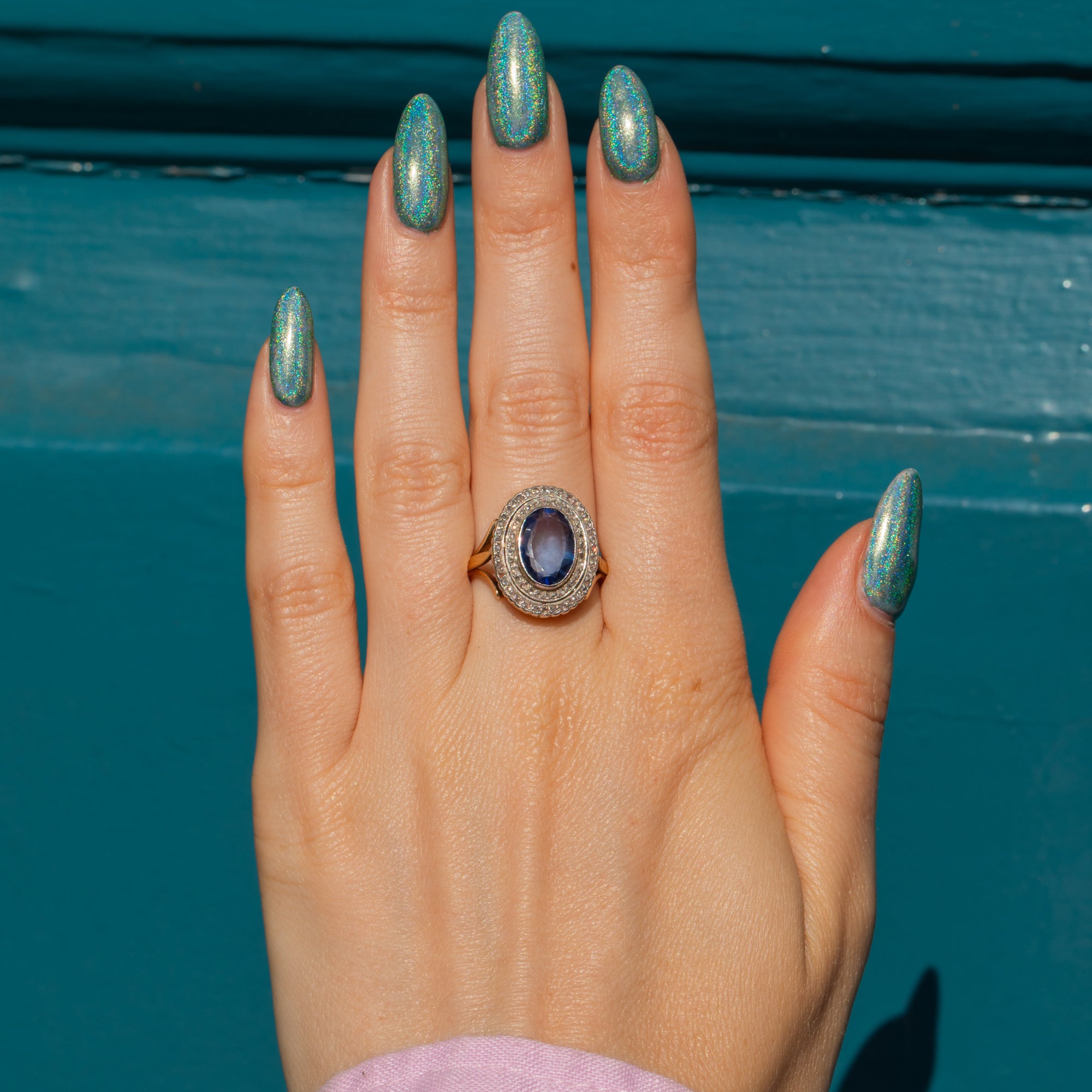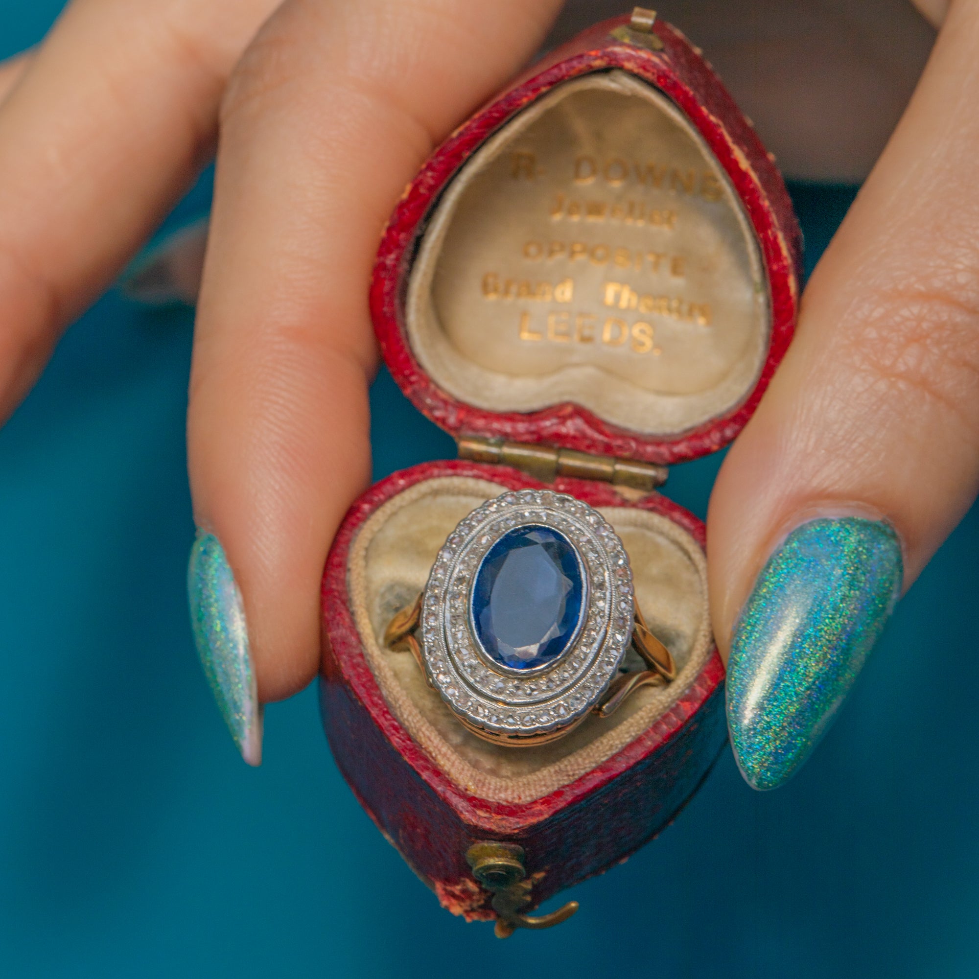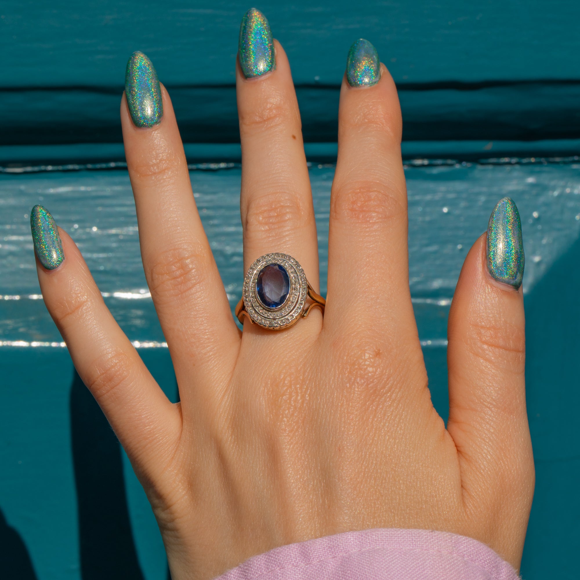 This antique Sapphire and Diamond oval cluster ring is an absolute showstopper! Centred by a 1.40ct Sapphire flaunting spellbinding midnight blue hues, she is haloed by not one but two rows of dainty Diamonds, each one with a characterful sparkle that will make you weak at the knees.