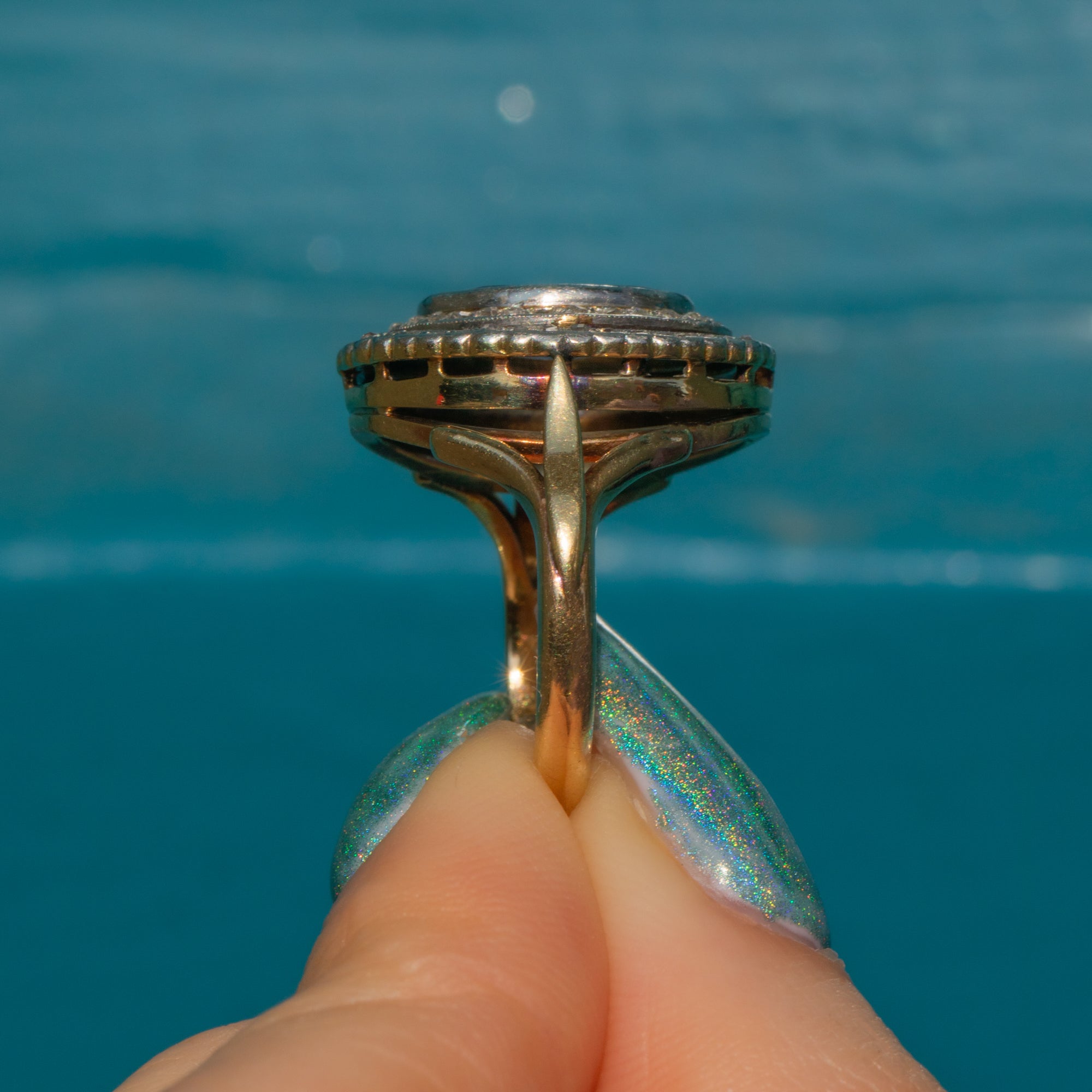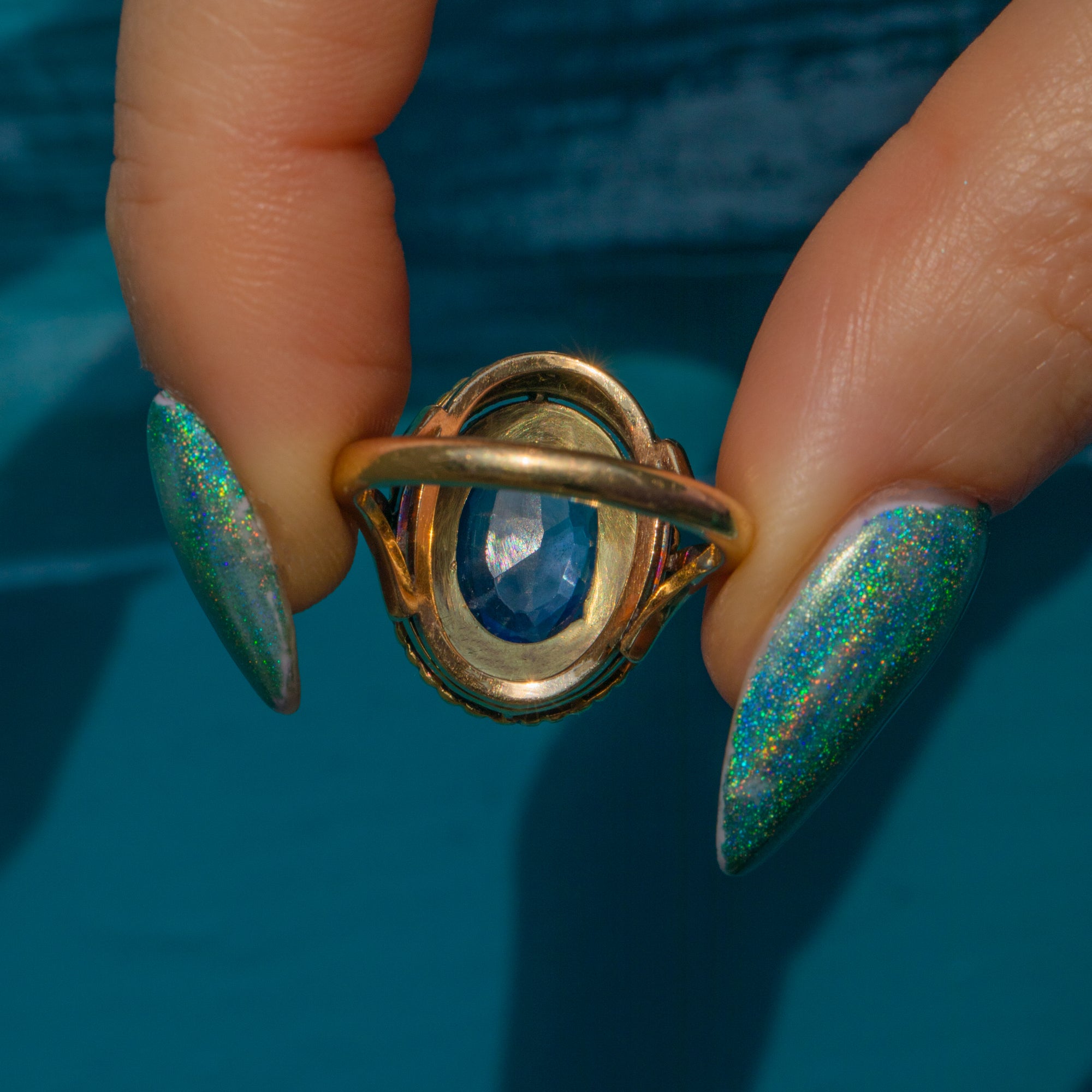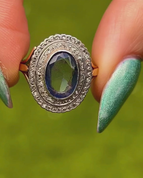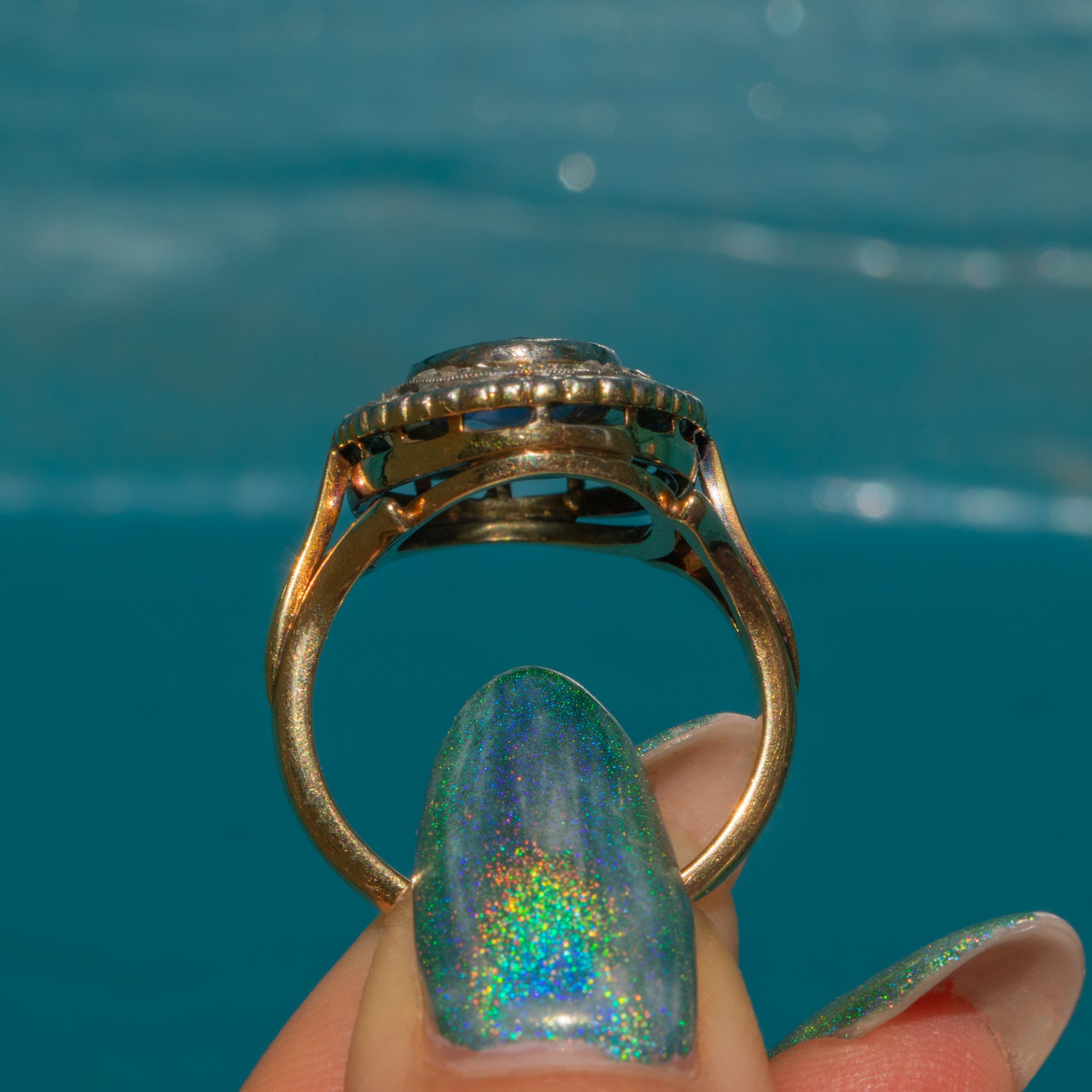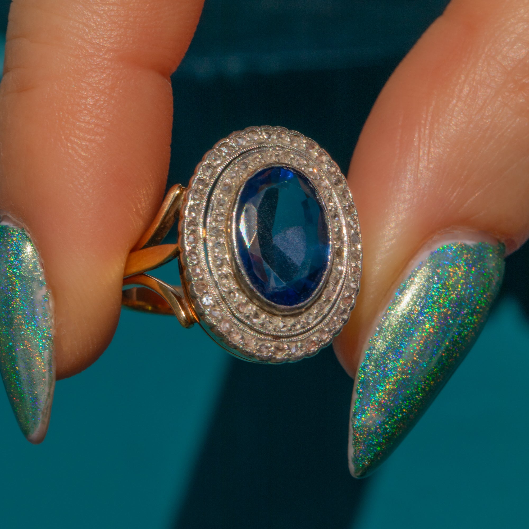 This antique Sapphire and Diamond oval cluster ring is an absolute showstopper! Centred by a 1.40ct Sapphire flaunting spellbinding midnight blue hues, she is haloed by not one but two rows of dainty Diamonds, each one with a characterful sparkle that will make you weak at the knees.