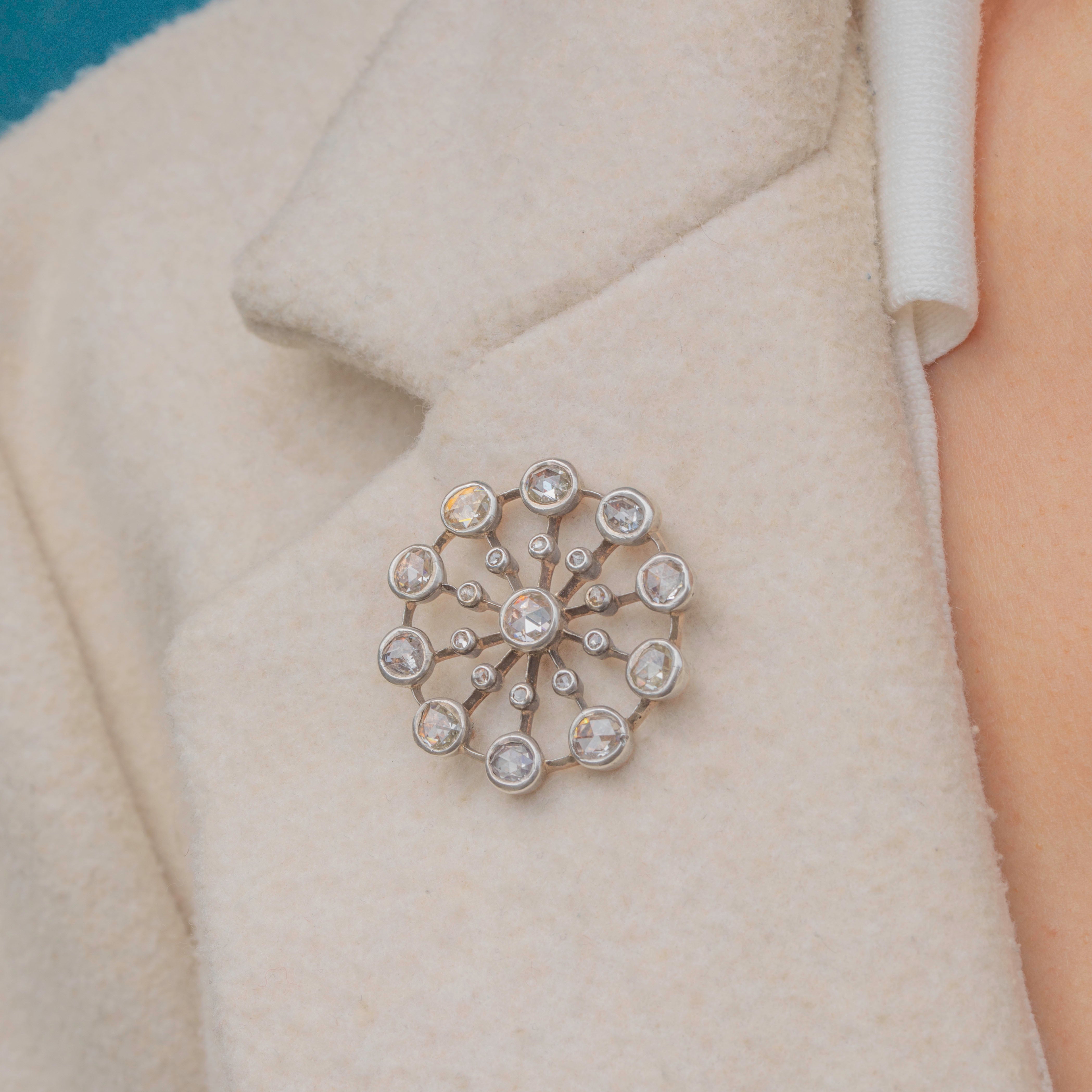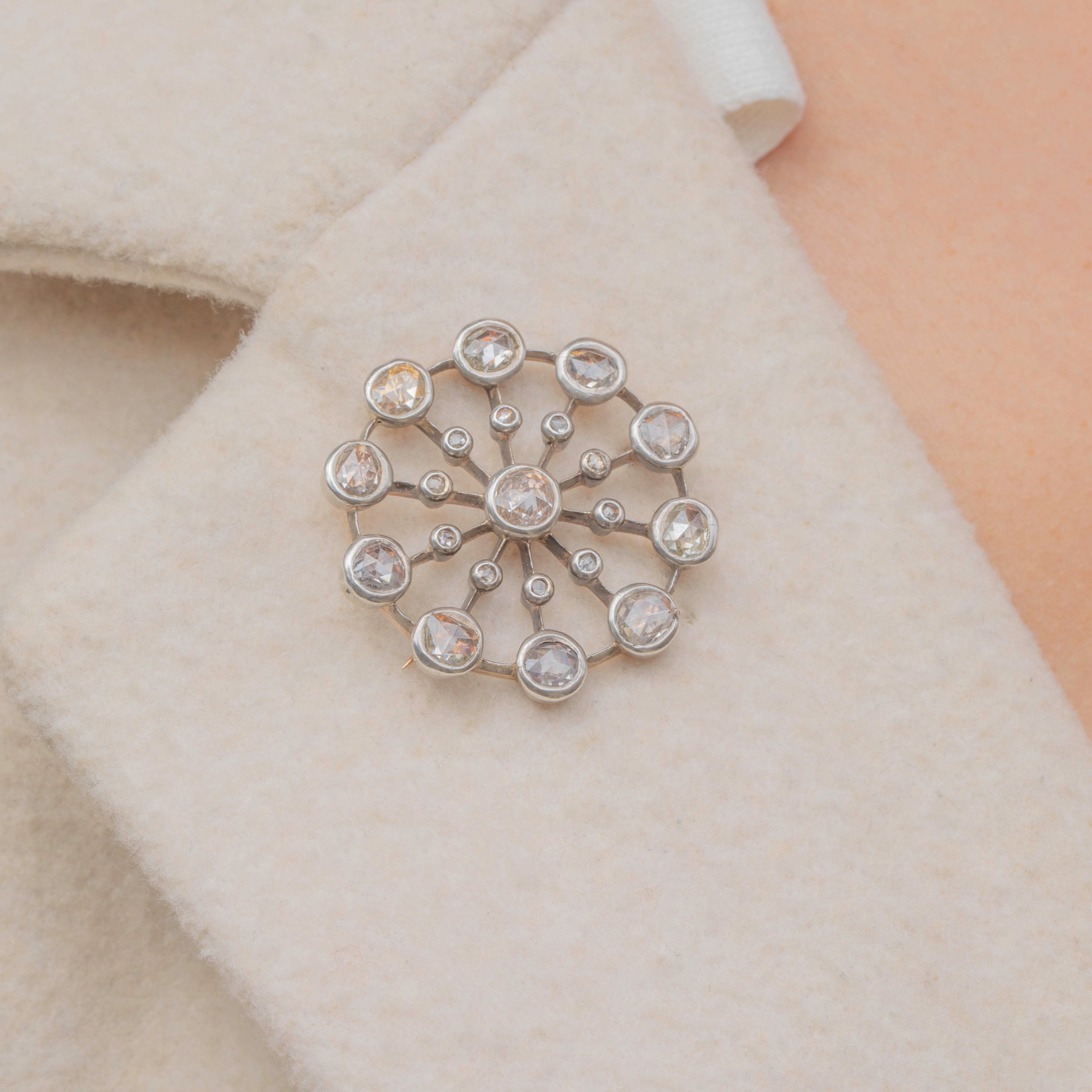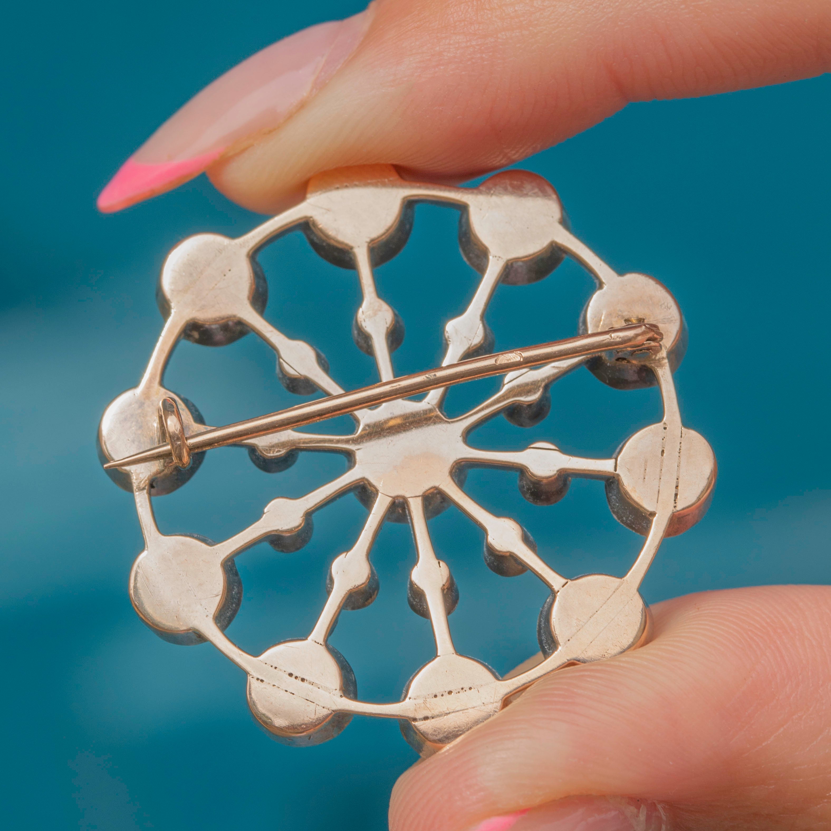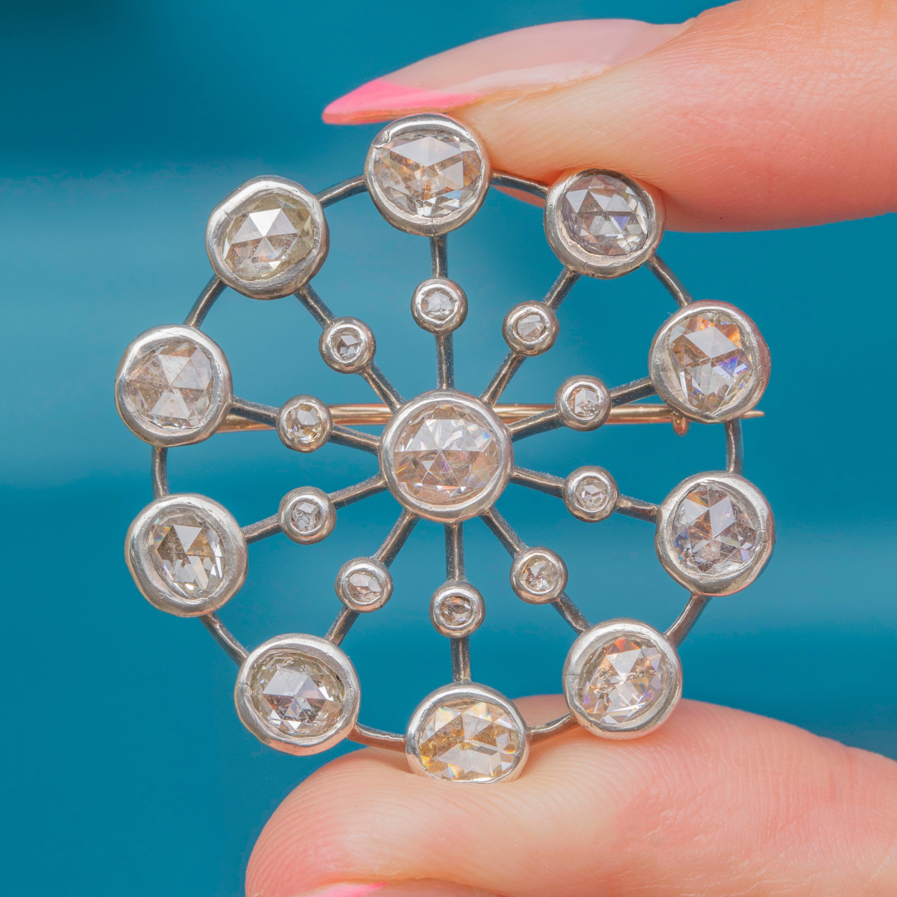 This antique 15ct Gold rose-cut Diamond cluster brooch is quite the statement piece! Akin to a burst of scintiallting stars, this Victorian brooch boasts twenty-one rose-cut Diamonds, with a combined 3.33cts, that will catch the light from every direction, whatever the lighting conditions.