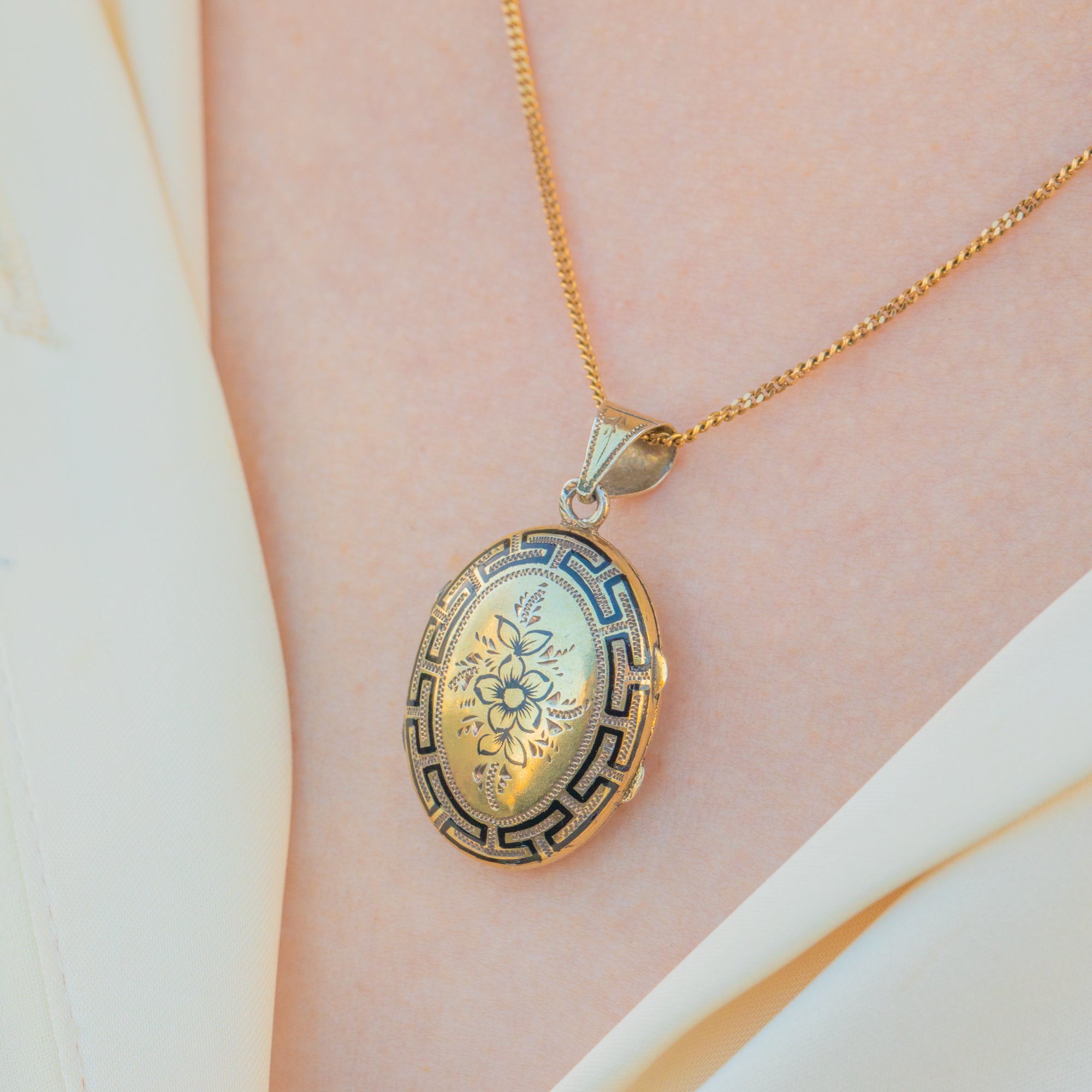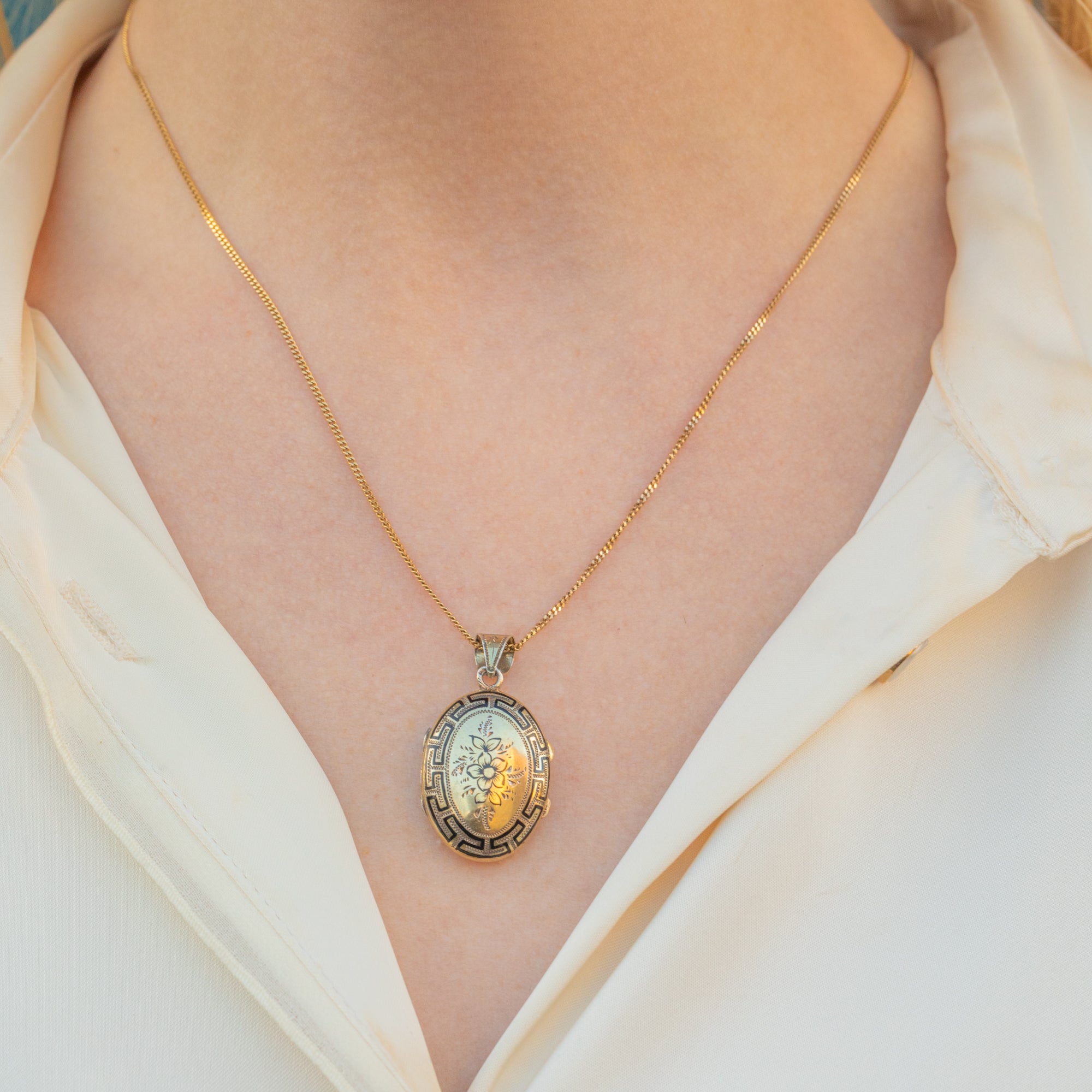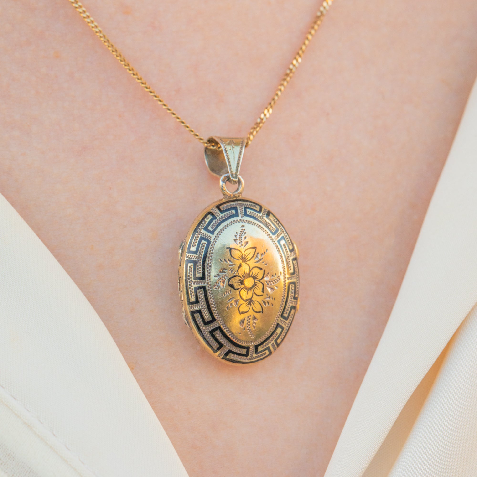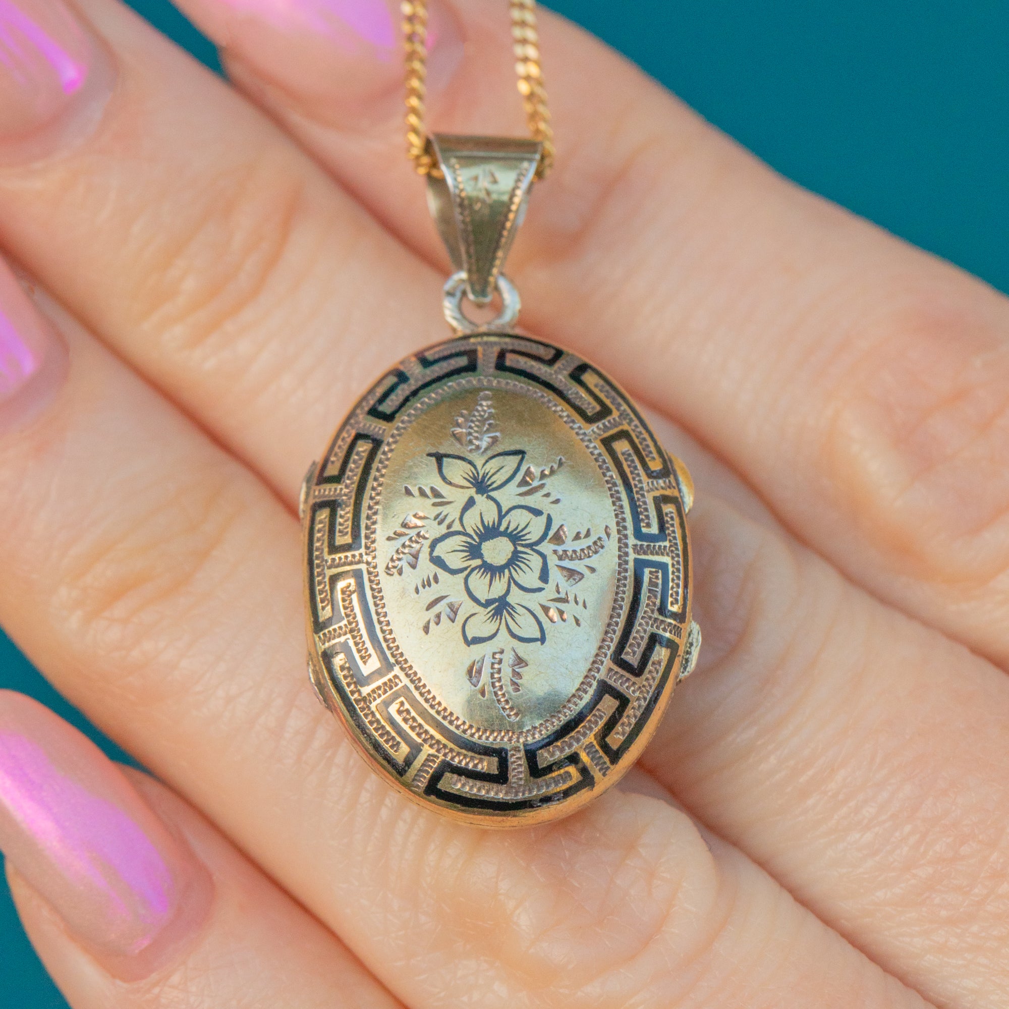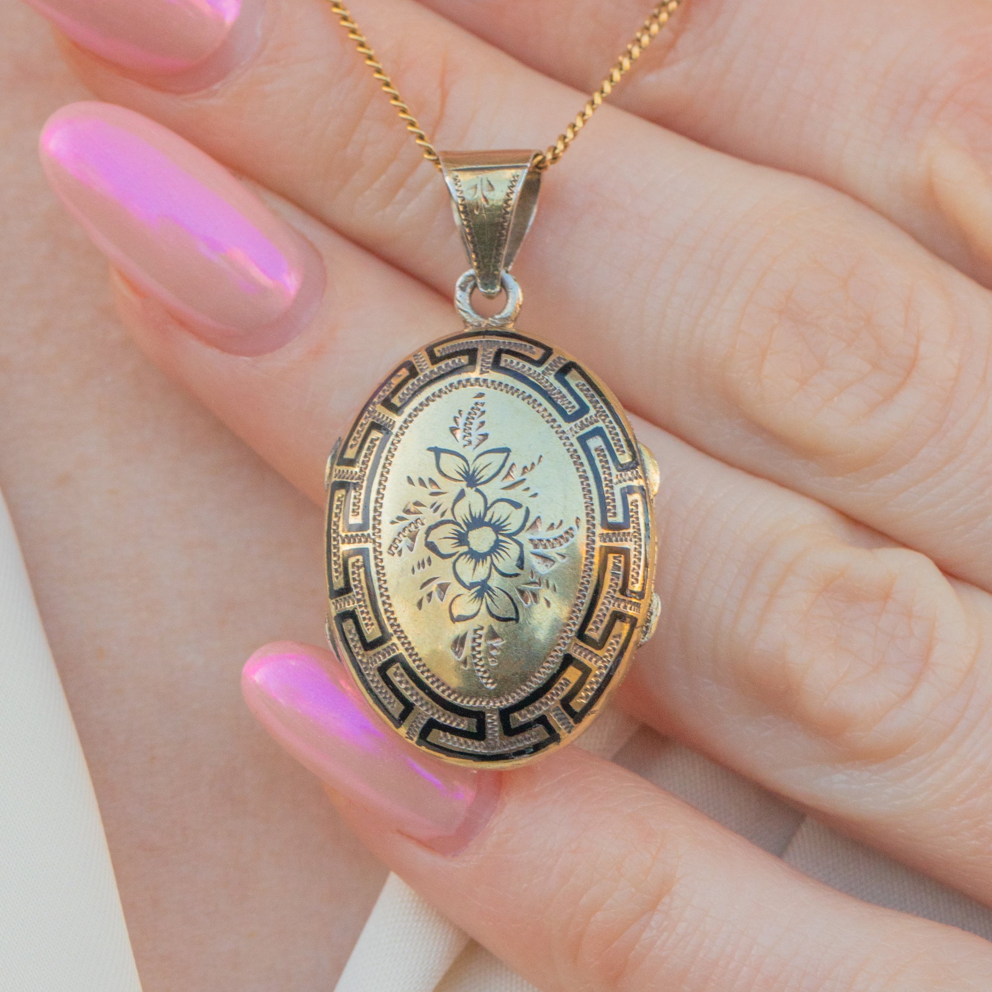 Add a touch of antique charm to your collection with this Victorian Silver black Enamel locket! Crafted from Silver gilded with Gold, this antique locket features a stunning Greek key and floral design inlaid with black Enamel.