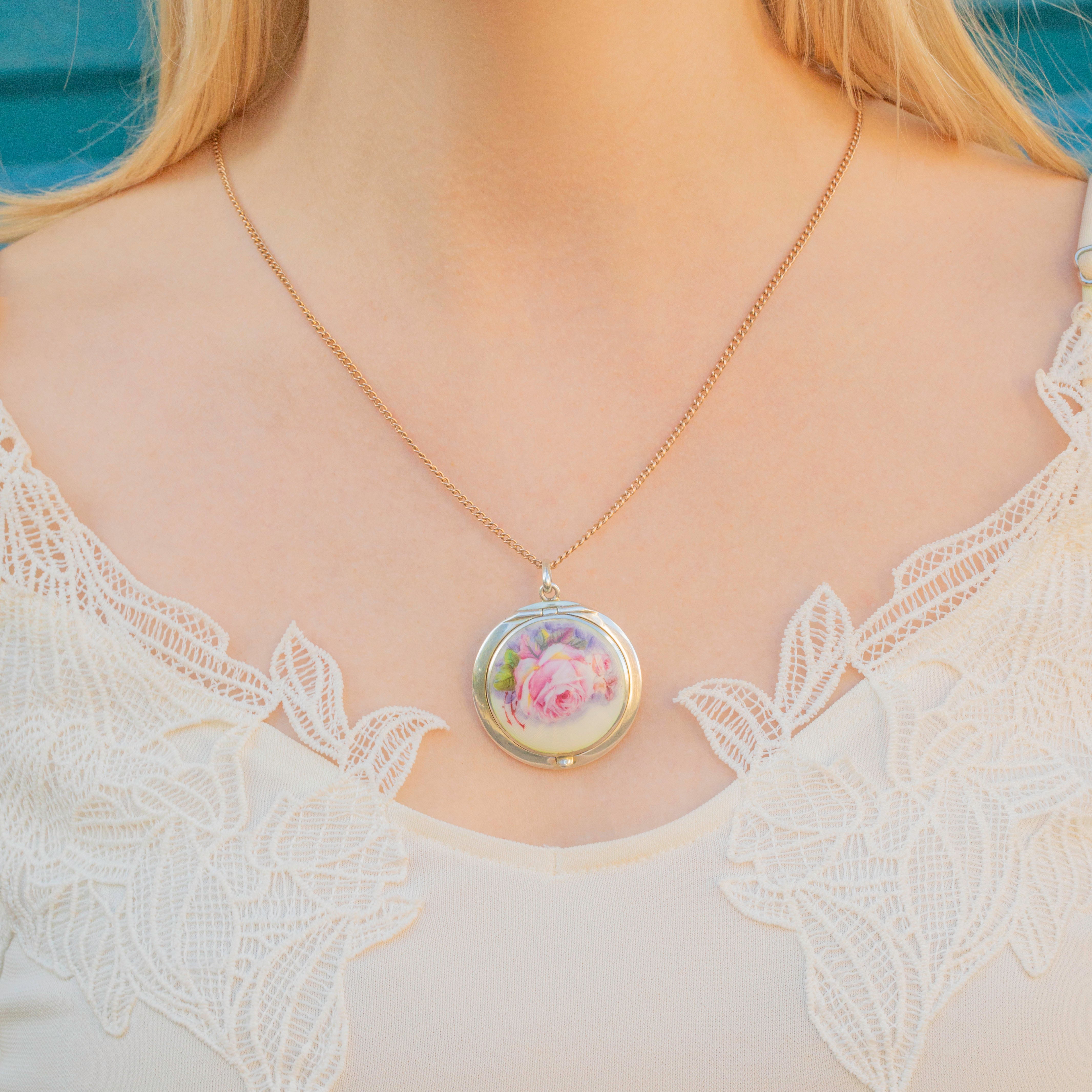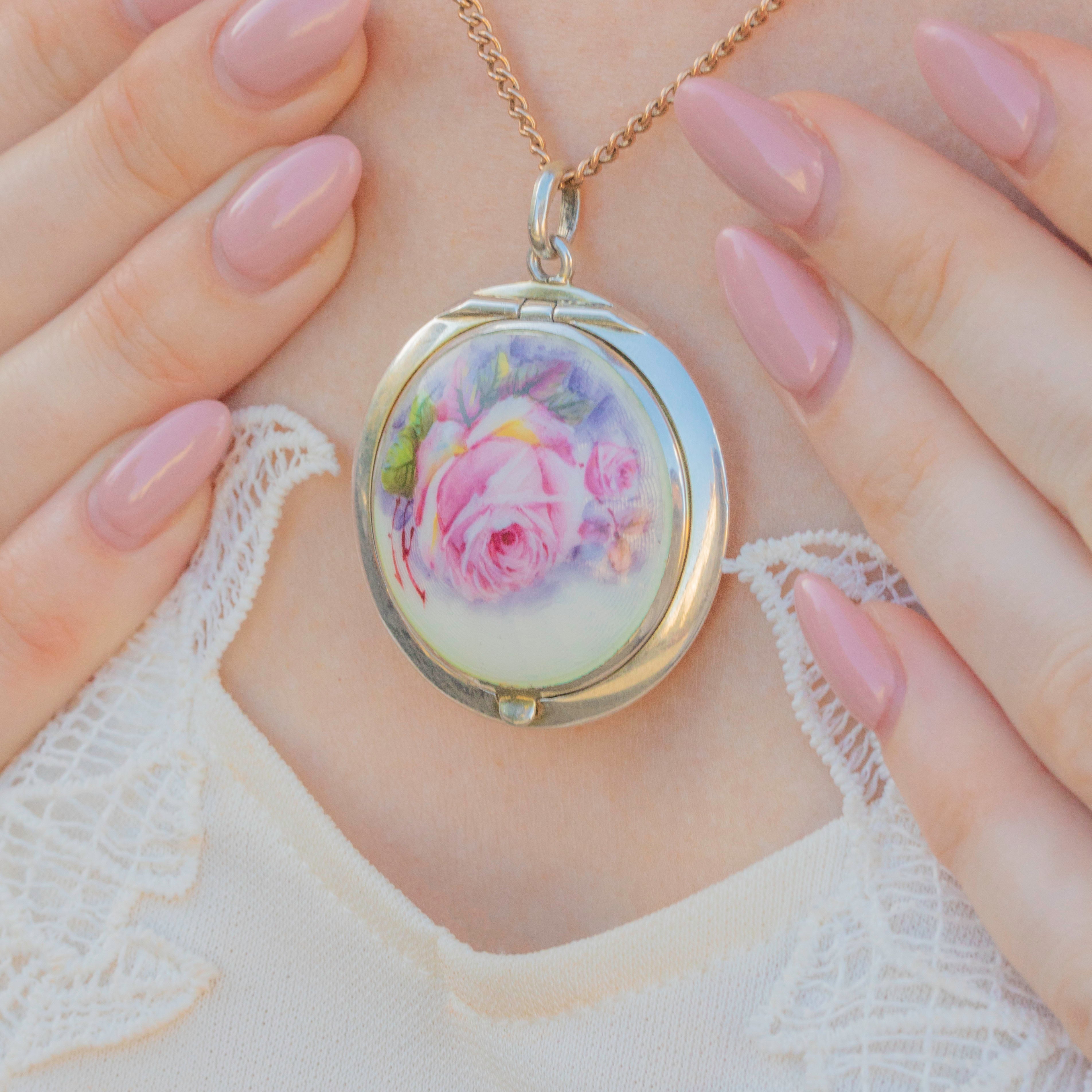 The front of the piece is adorned with a skillfully painted Guilloché Enamel rose with a soft colour palette that perfectly captures the romanticism of the Edwardian era. Showcasing meticulous craftsmanship and beautifully preserved, this antique Guilloché locket will make a fine sentimental gift choice or lovely treat for yourself!