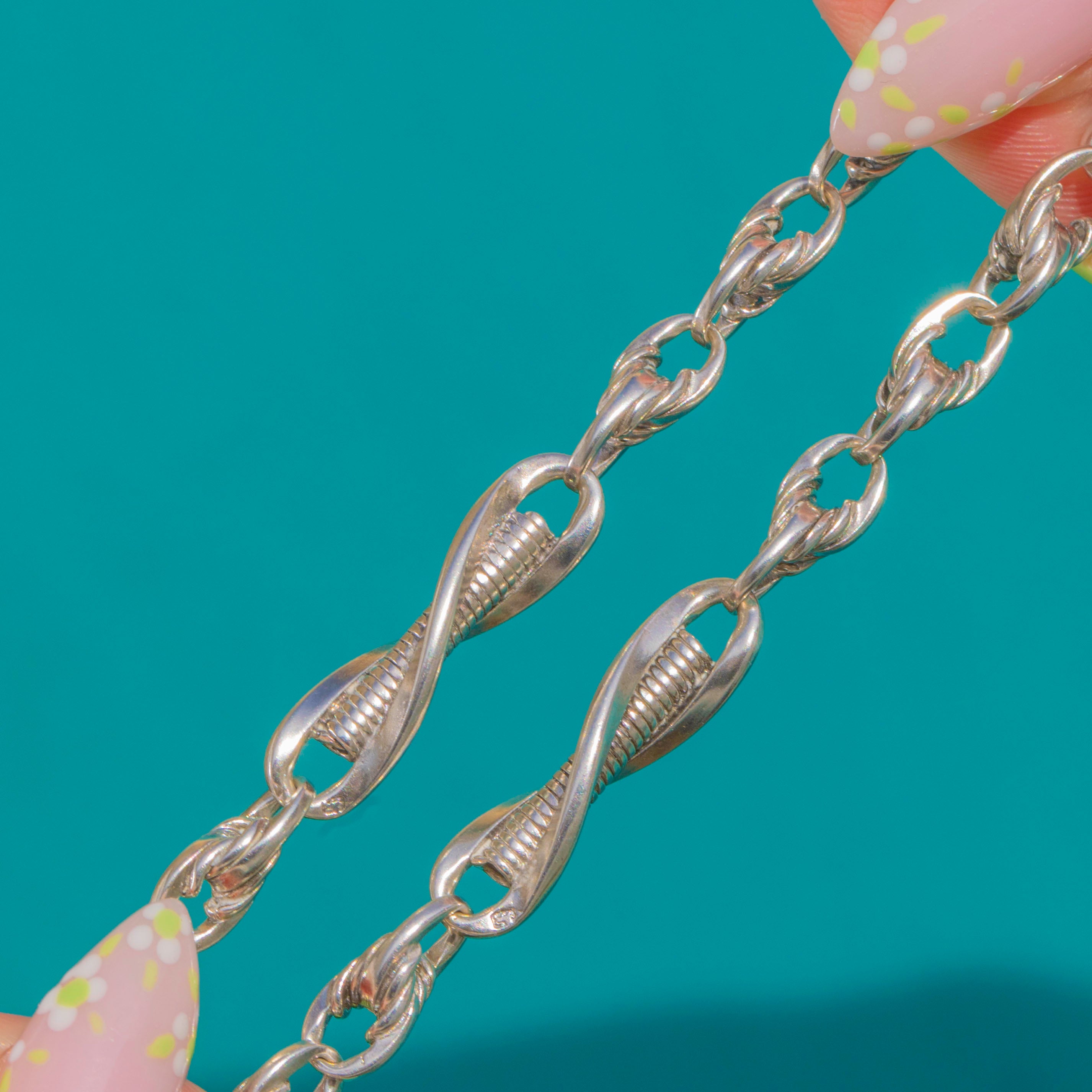 A handsome Edwardian fancy link Albert chain in Sterling Silver. Alternating rope‑twist links and ribbed oval connectors give this piece a richly textured rhythm, finished with a front‑facing T‑bar and matching dog clips for that timeless, tailored look. The articulation is silky and the polish bright, creating a refined play of light across every twist and turn.