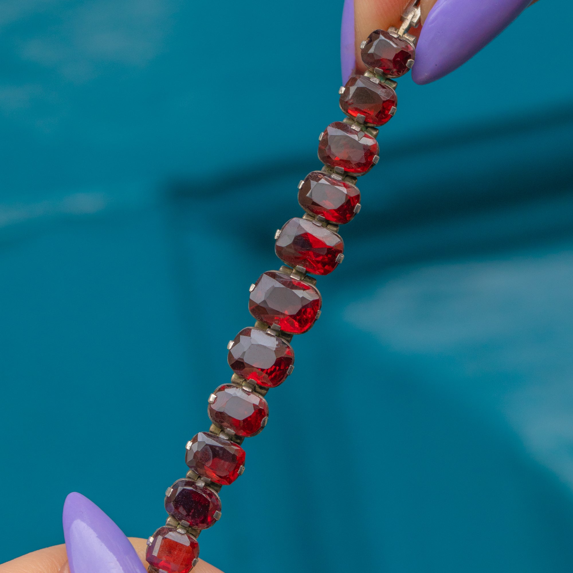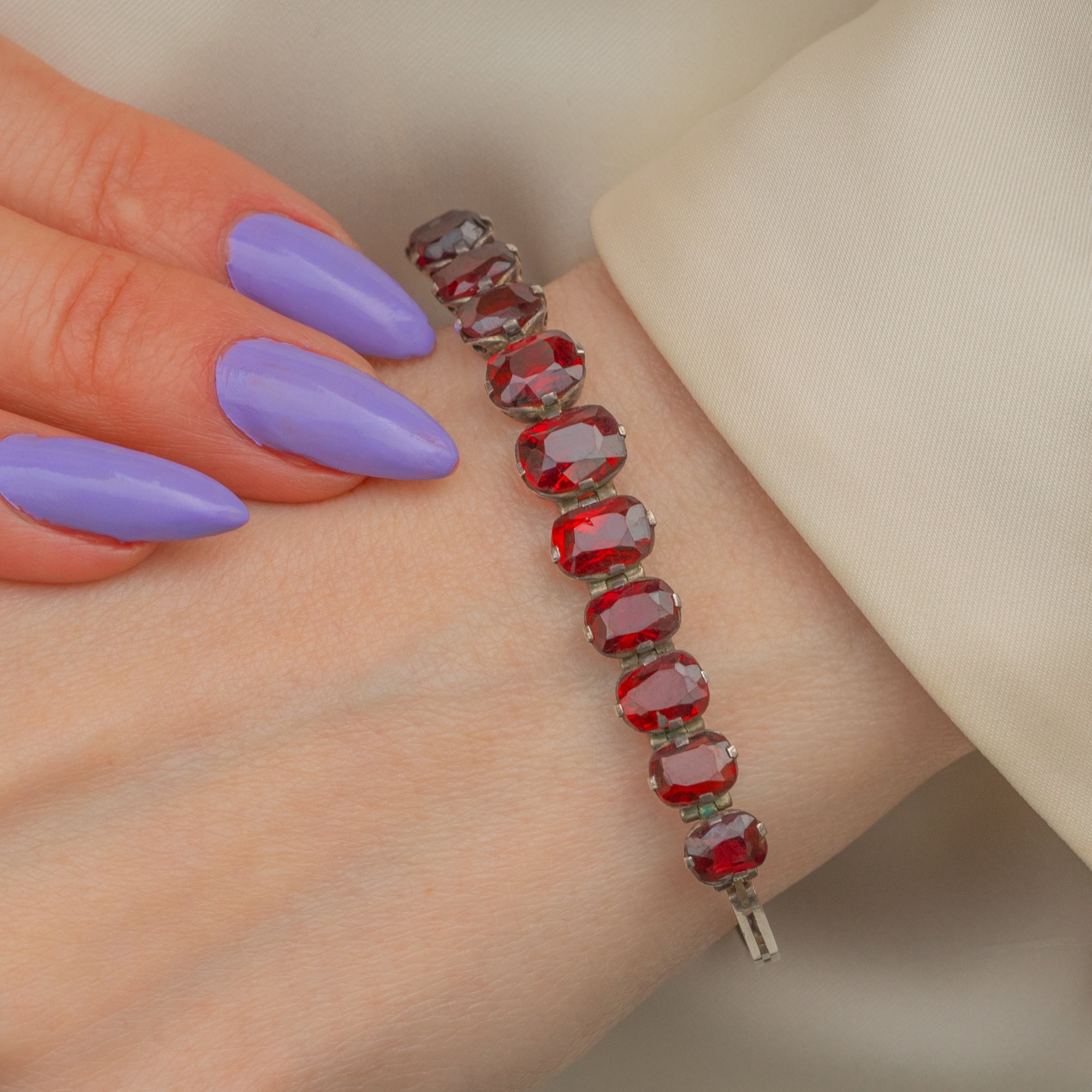 GOOD-VERY GOOD: This antique Silver Garnet Graduating bracelet is in very good condition throughout. All eleven Garnets are secure in their claw settings, with crisp facets. As a whole, her Garnets have survived with only very minor wear to their surface. The second Garnet from the central larger Garnet has a tiny chip, however, as each is so vibrant, this takes nothing away from their beauty! The Silver links are securely connected, with a tongue clasp promising confident wear.