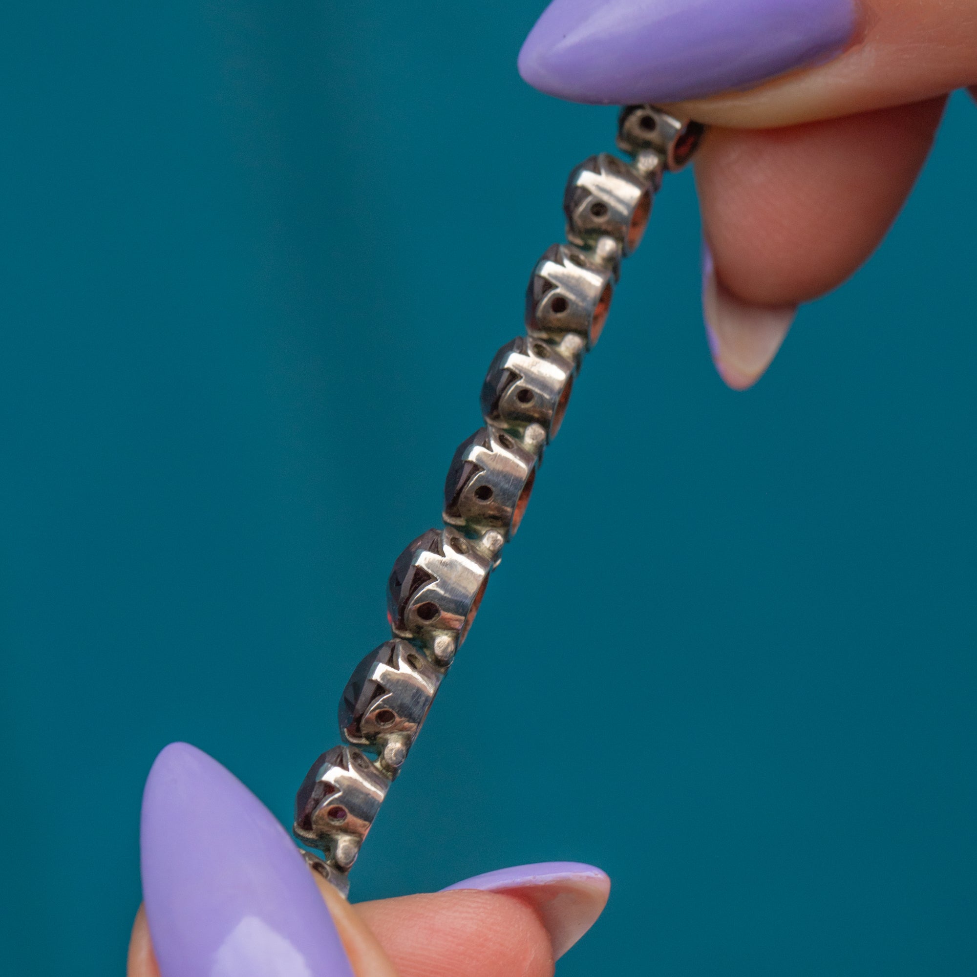 This exquisite antique Silver Garnet graduating bracelet boasts a total carat weight of 10.00ct! Her seductive Garnets elegantly wrap around the wrist, providing great coverage, and burst with cranberry and ruby hues- she is an antique delight.