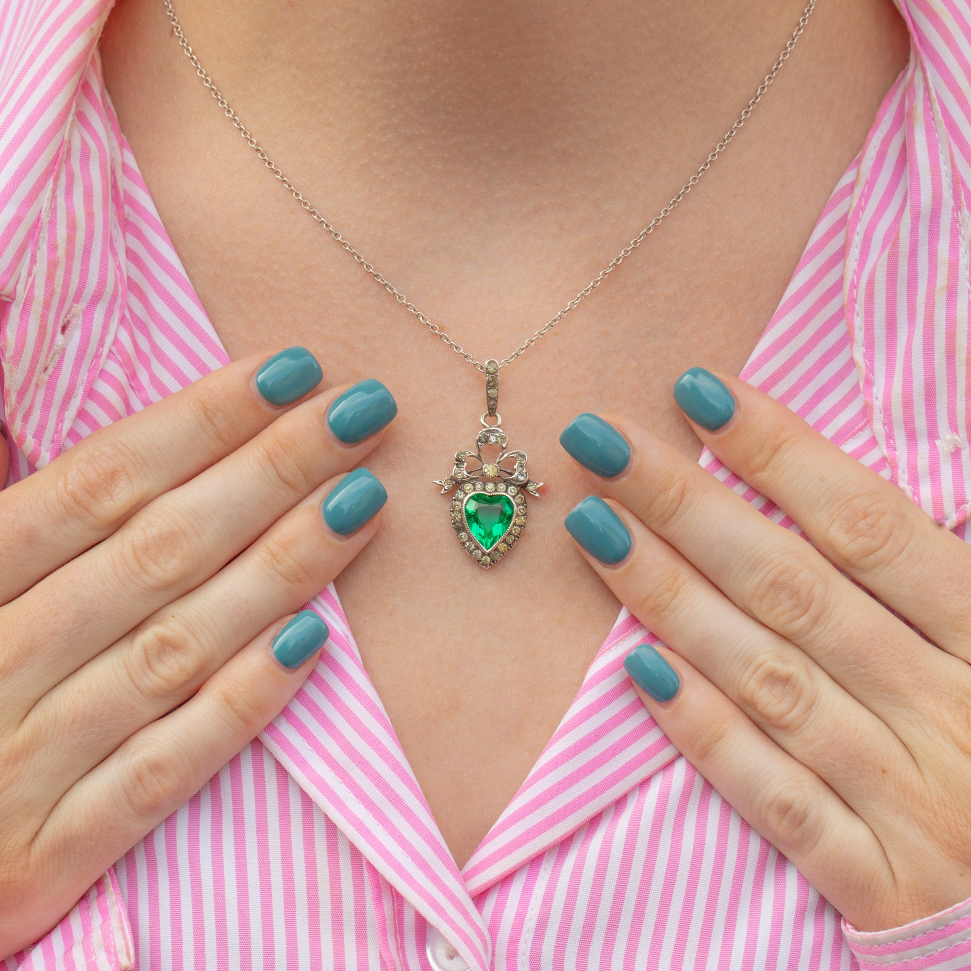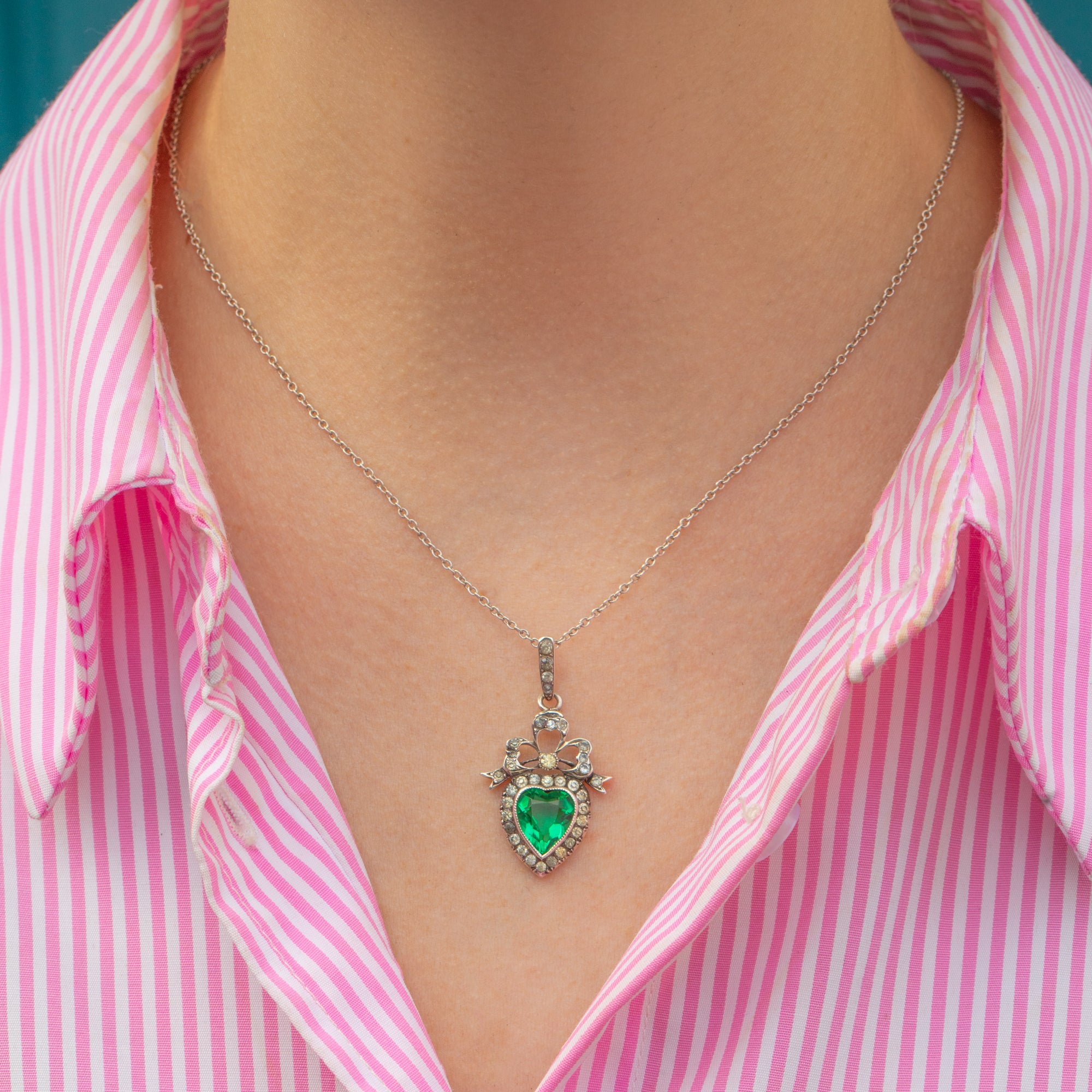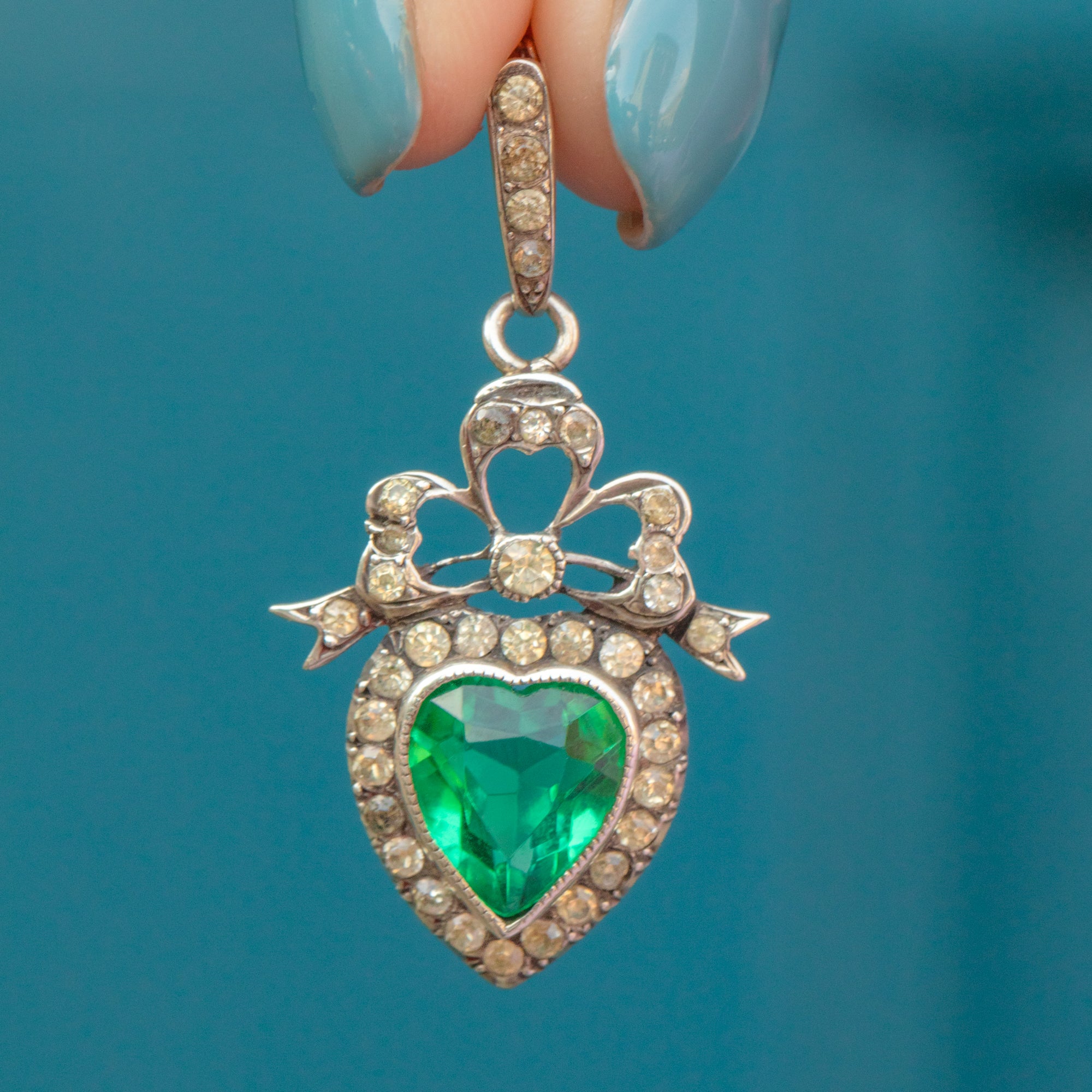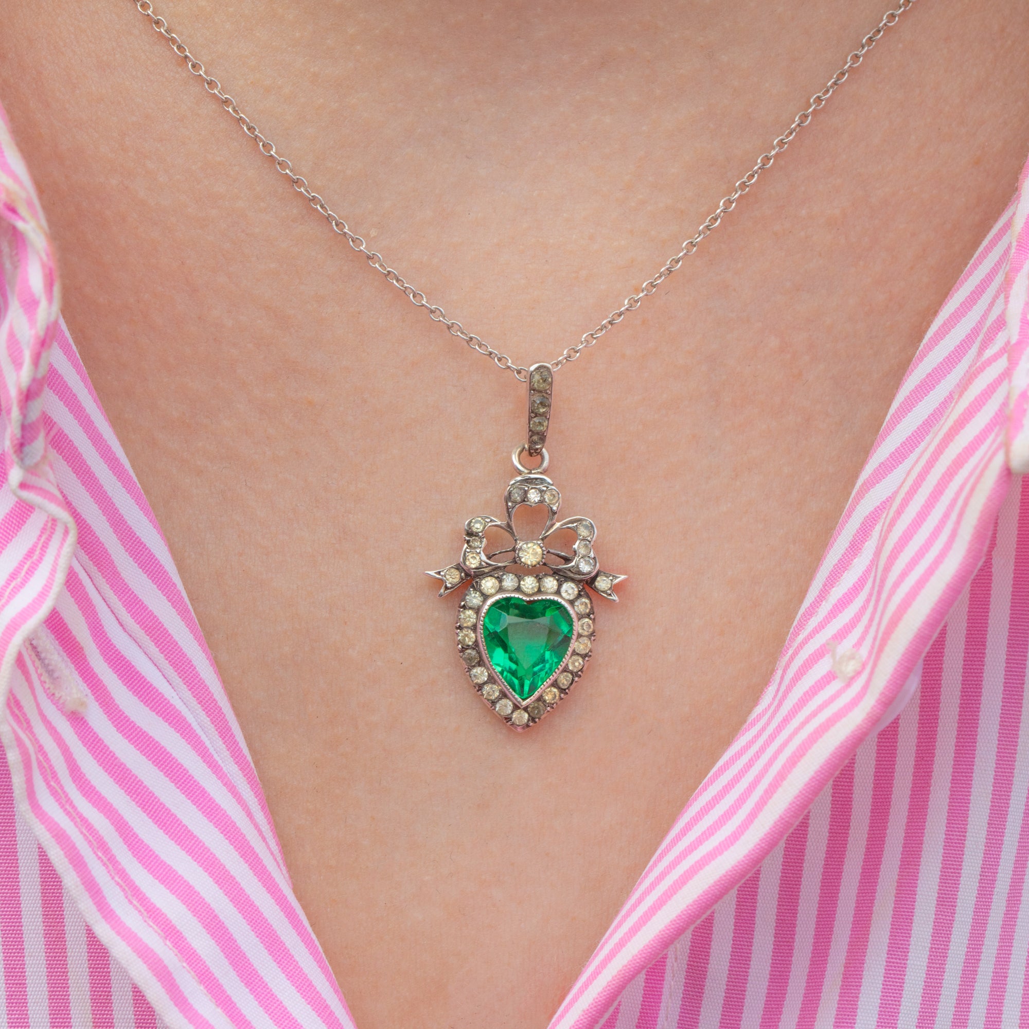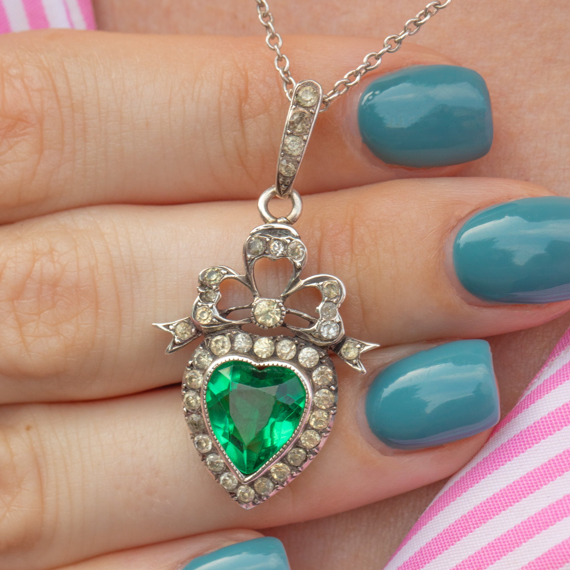 Edwardian Silver Green Paste Heart Charm, with 18" Chain