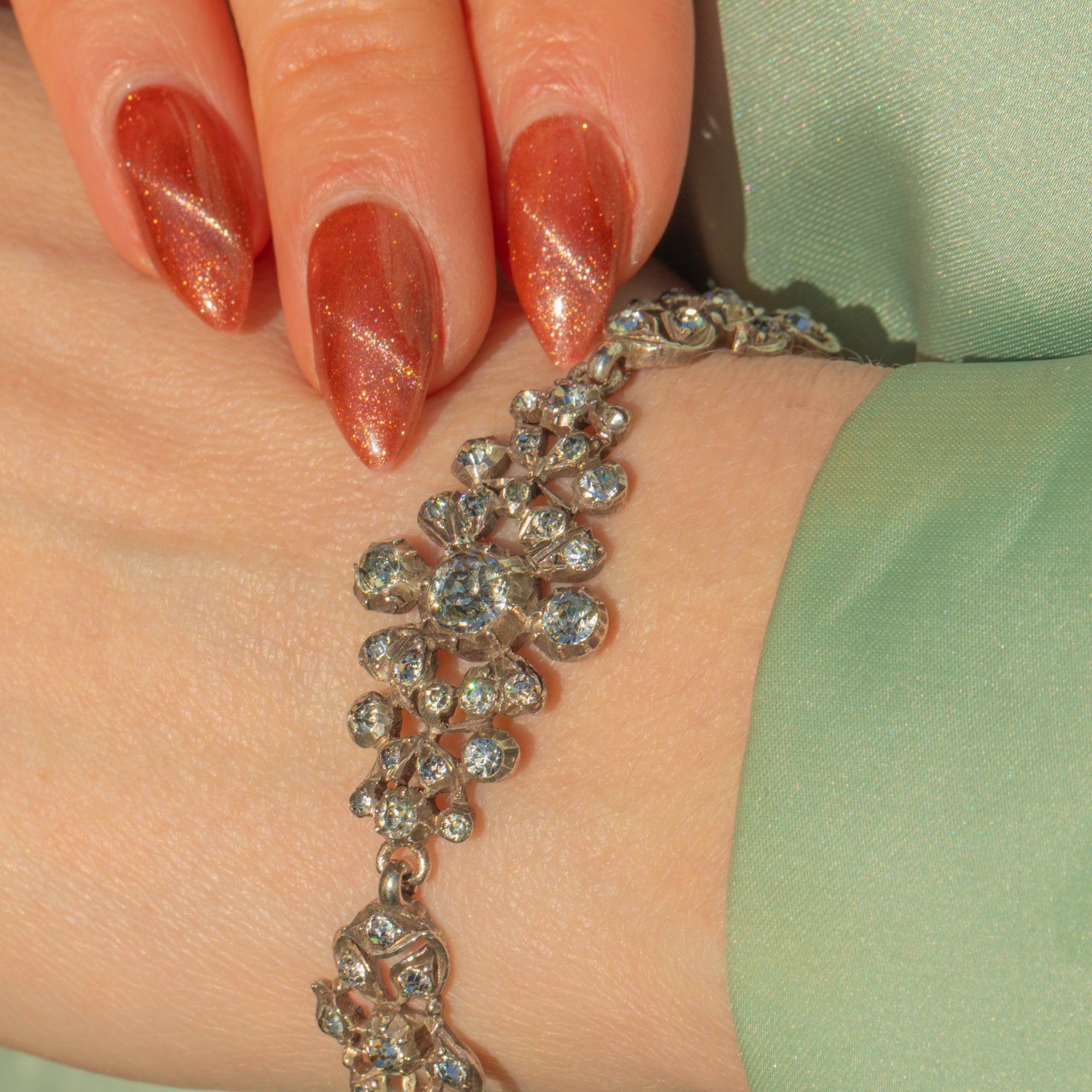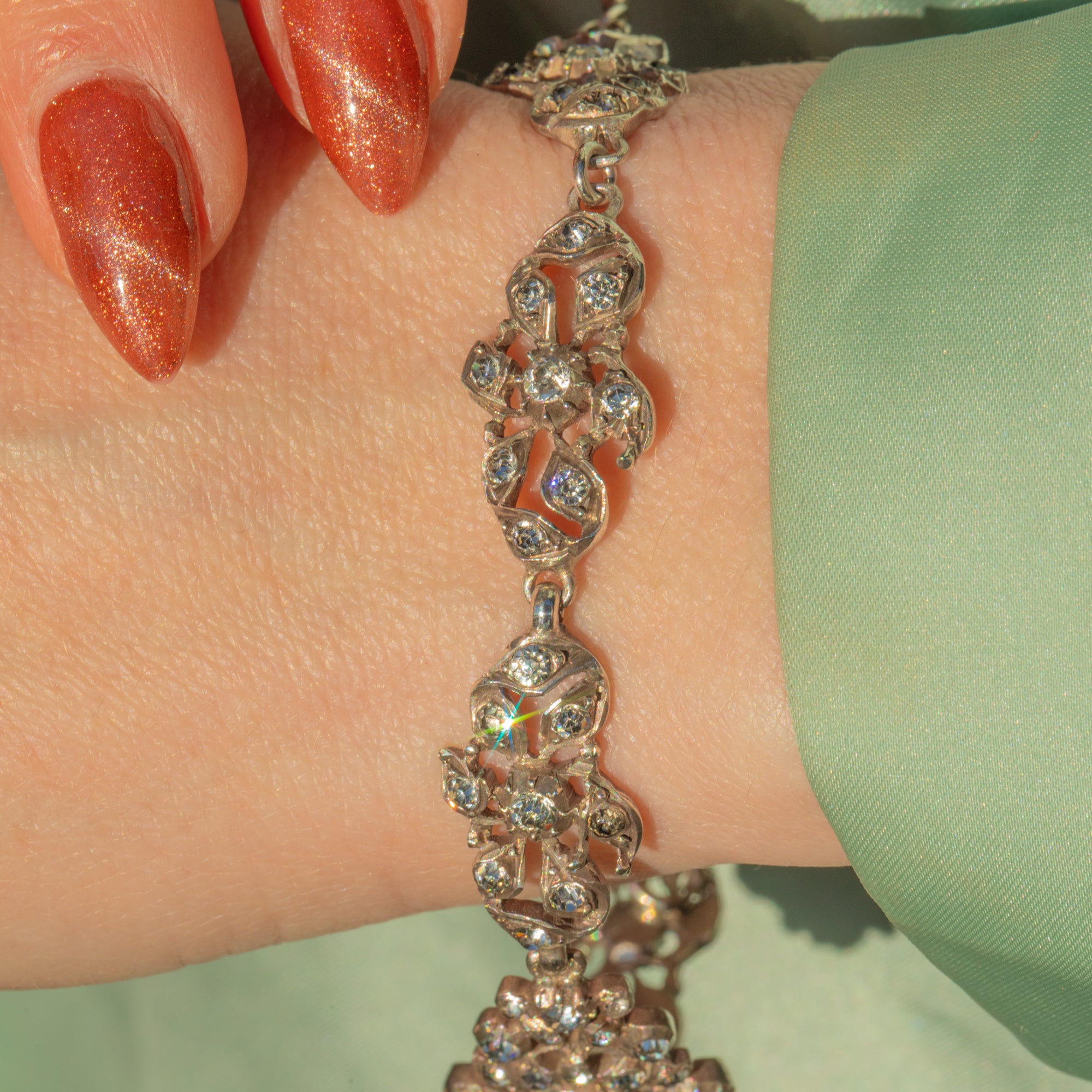 VERY GOOD. This antique Silver Paste floral bracelet is in very good condition. She is crafted wonderfully and has a lovely sparkle. The Paste stones are securely set, although some have a darkened or dulled colour, likely having been replaced over time. There are some signs of wear to the Silver on the inside of the bracelet commensurate with age, which cannot be seen when wearing. The links are securely affixed and the tongue clasp is in perfect working condition, so you can wear this splendid Victorian bracelet with absolute confidence!