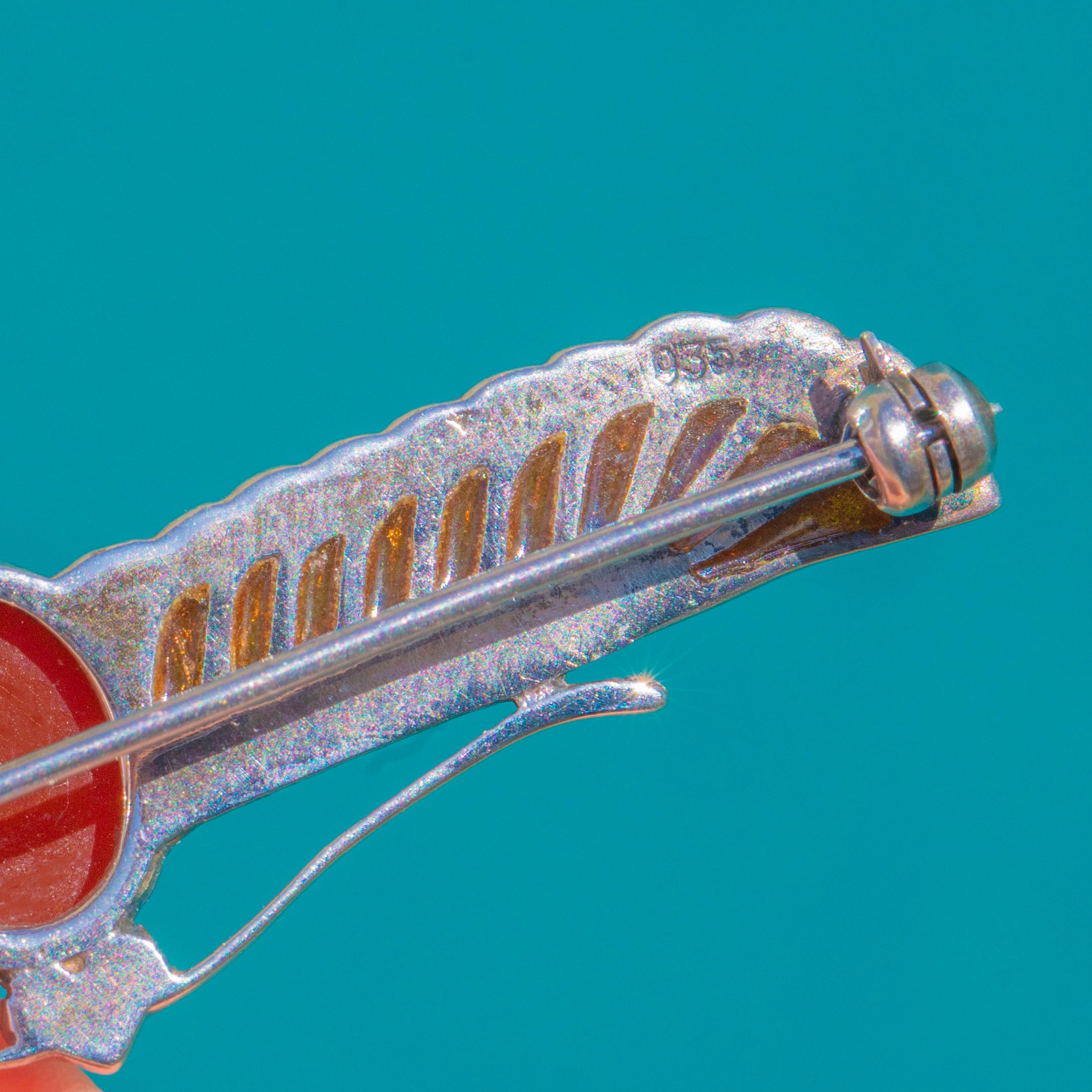 Dating to c.1920, this compact yet sculptural treasure captures the Archaeological Revival mood of the era with poise and precision. Stamped 935 and testing as Silver, it fastens with a classic pin and catch for effortless styling on a lapel, knit, or scarf—an evocative accent that feels both timeless and unmistakably Deco.