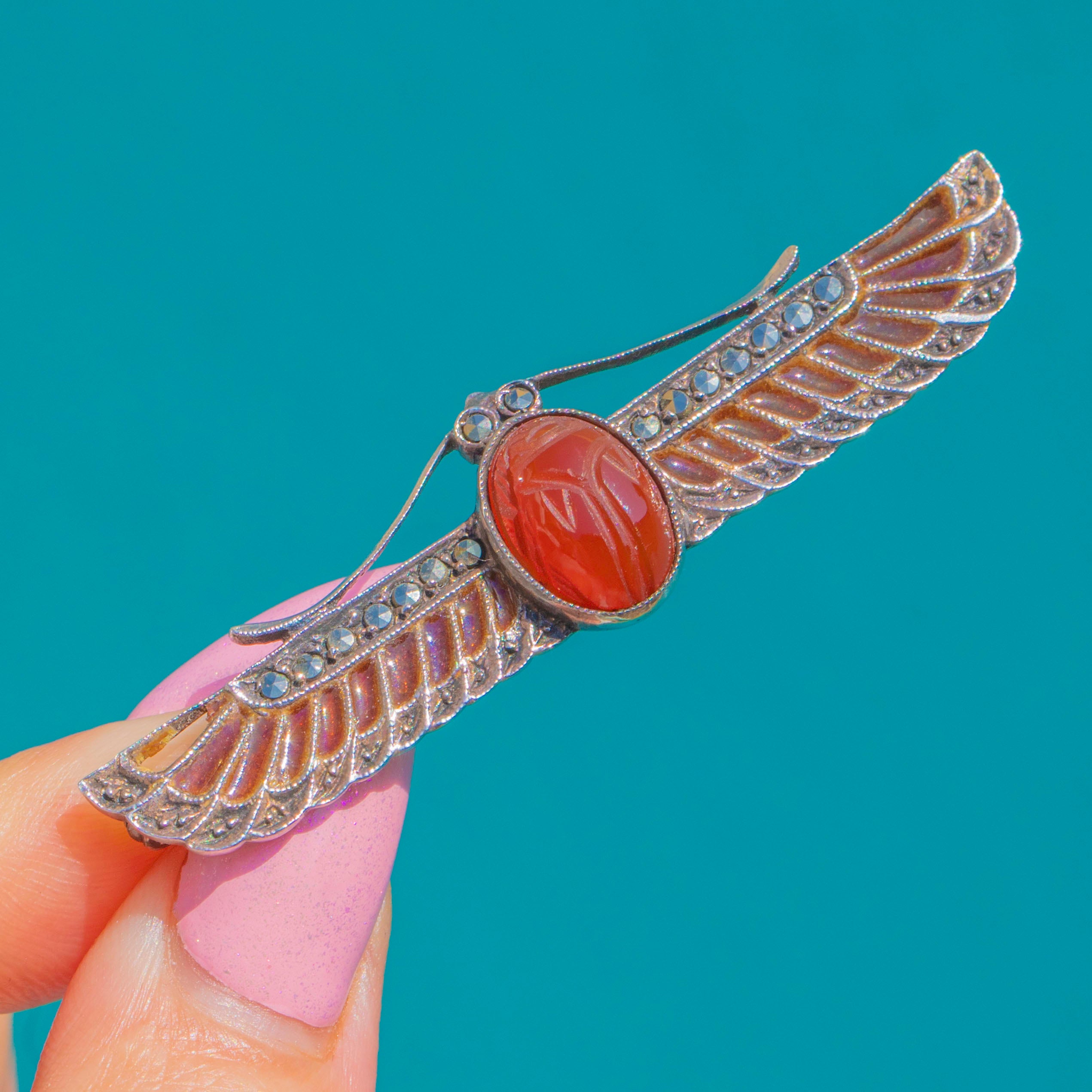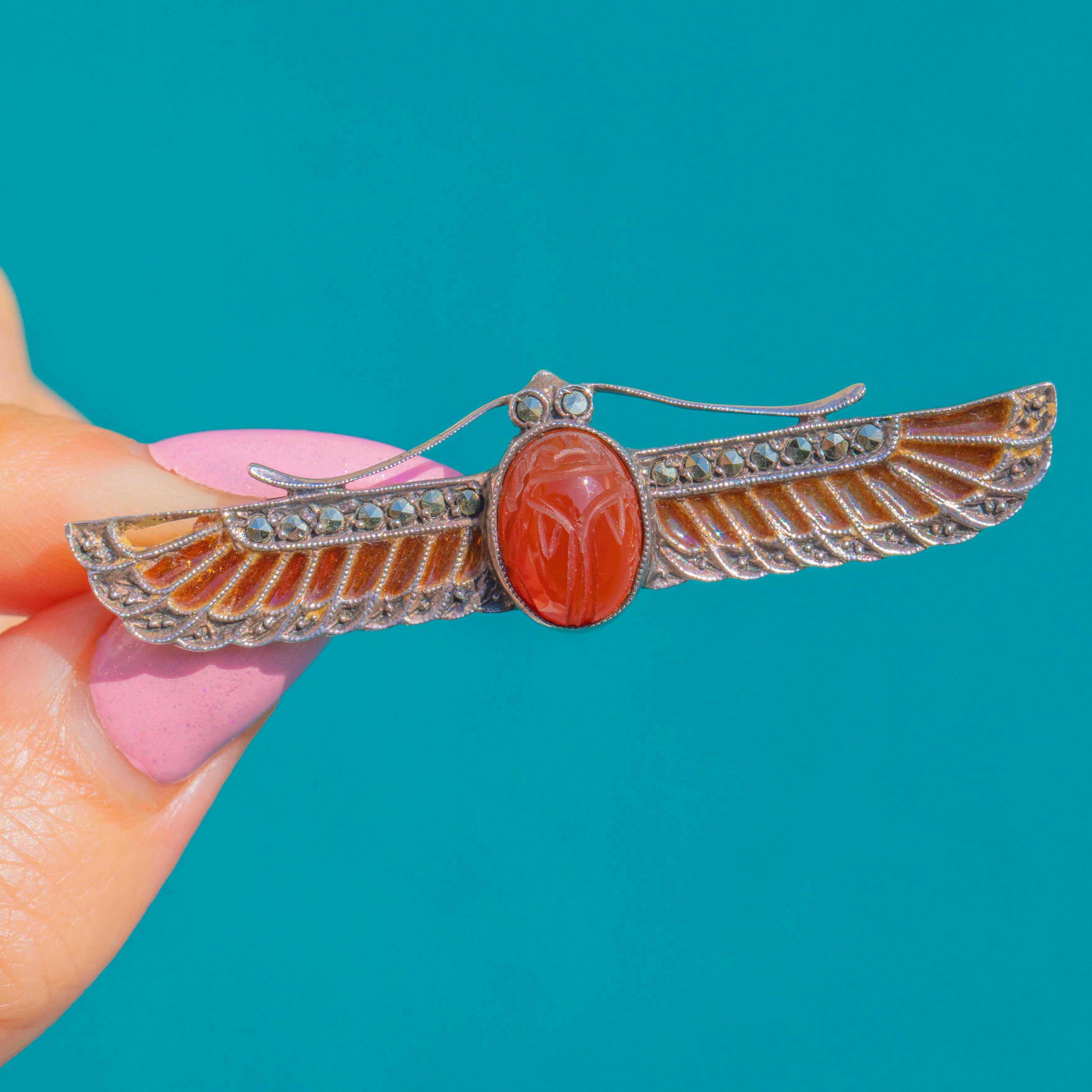 Glowing with Egyptian Revival allure, this Art Deco winged scarab brooch is a jewel of light and line. Crafted in cool Silver, the openwork wings are alive with plique-à-jour enamel that catches the light like miniature stained glass, while fine milgrain and beaded details add elegant texture. Linear rows of faceted accents trace the feathers, bringing a subtle sparkle to the sweeping silhouette.