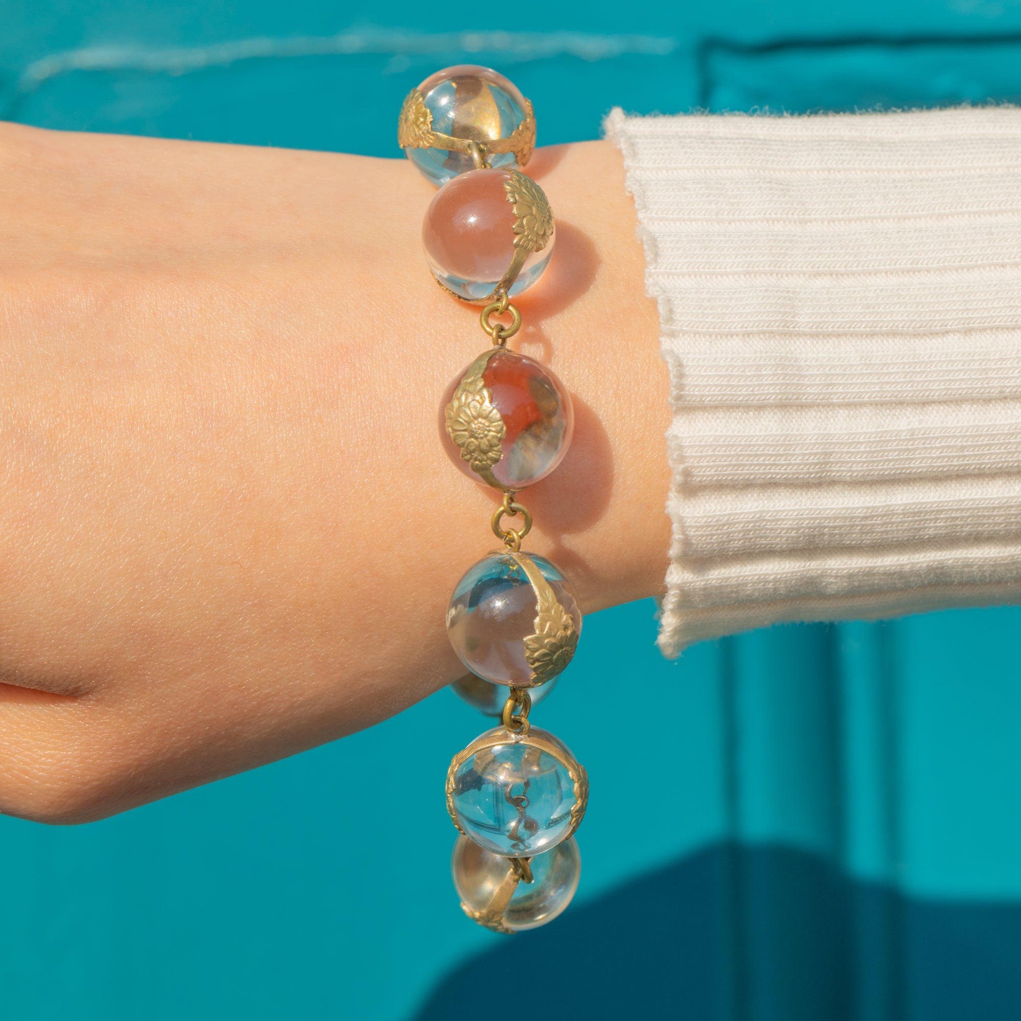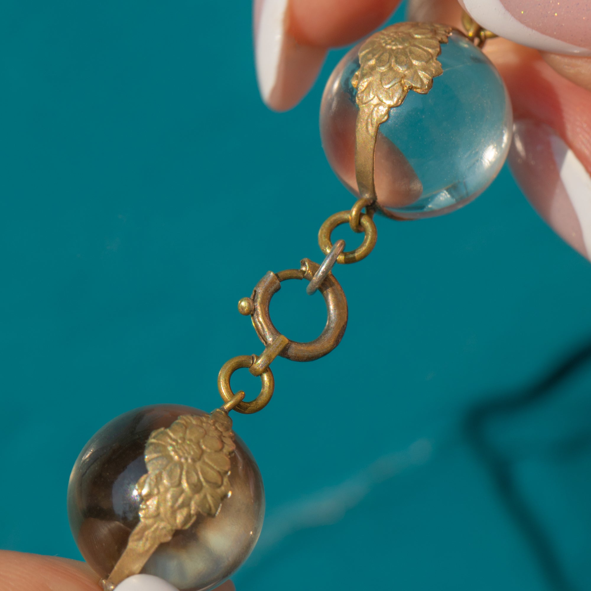 Comprised of ten spherical Rock Crystals, named 'pools of light' after their magical adularescence, this Victorian bracelet radiates a whimsical allure. Each crystal is set within lustrous floral Silver settings, adding a lovely antique charm to this piece.