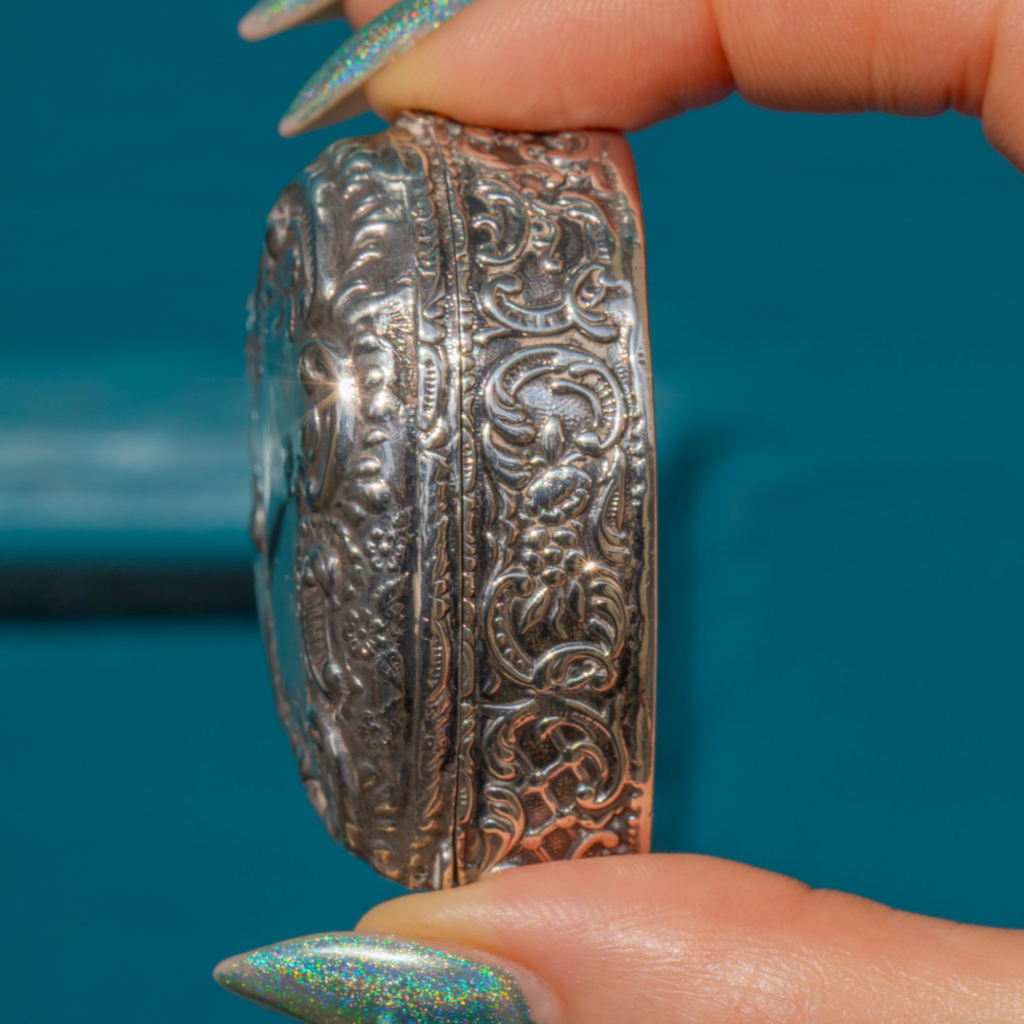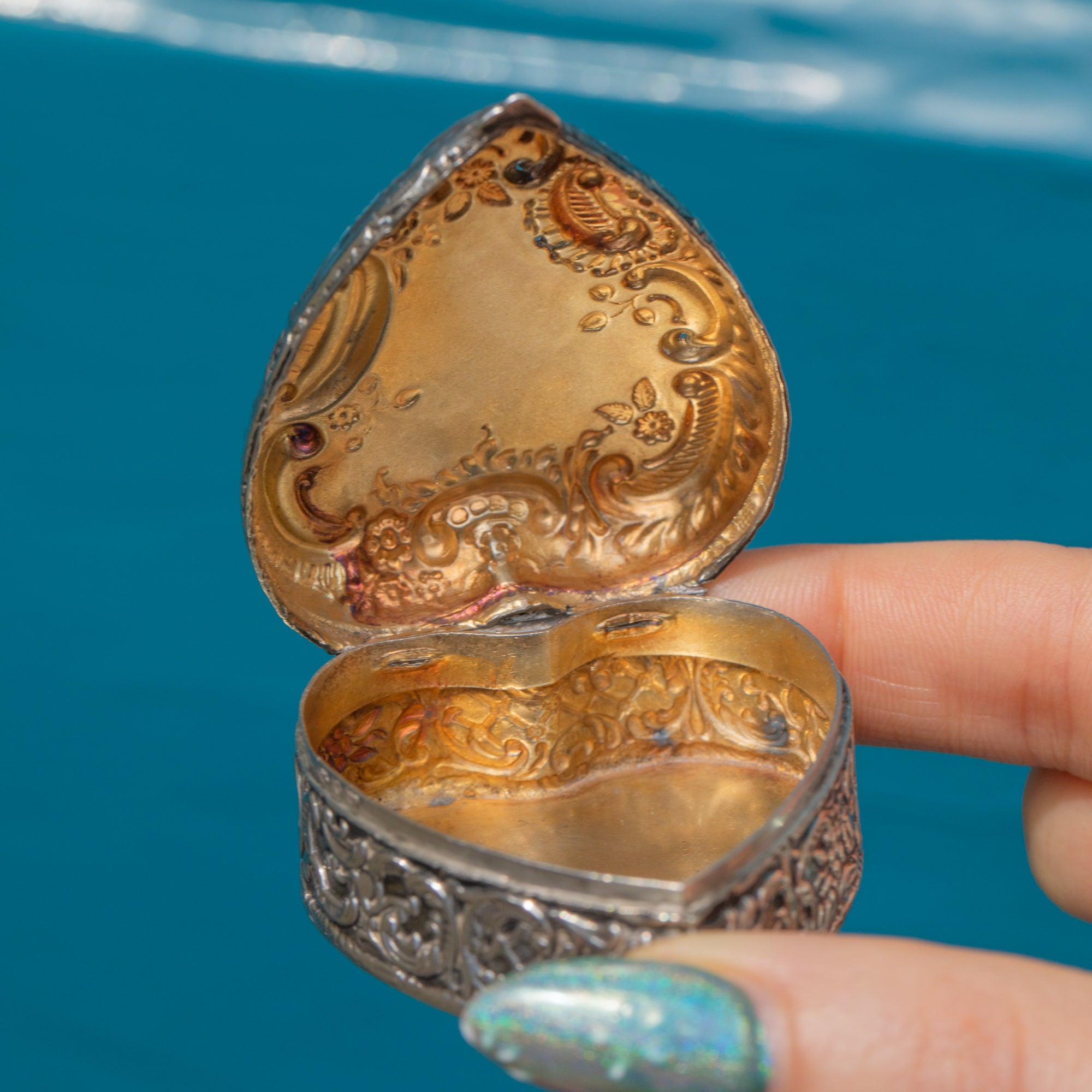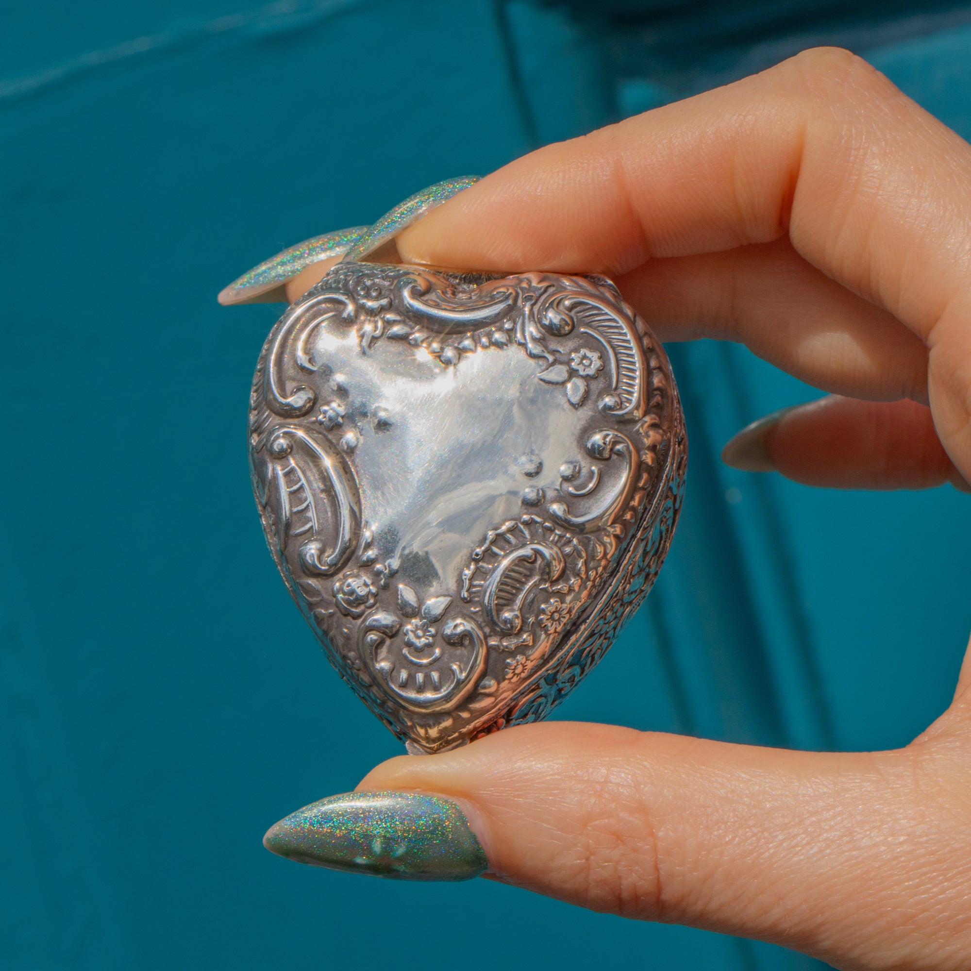 The perfect new abode for your most precious trinkets, this antique Silver repoussé heart shaped trinket box will bring a touch of Victorian charm to your nightstand!
