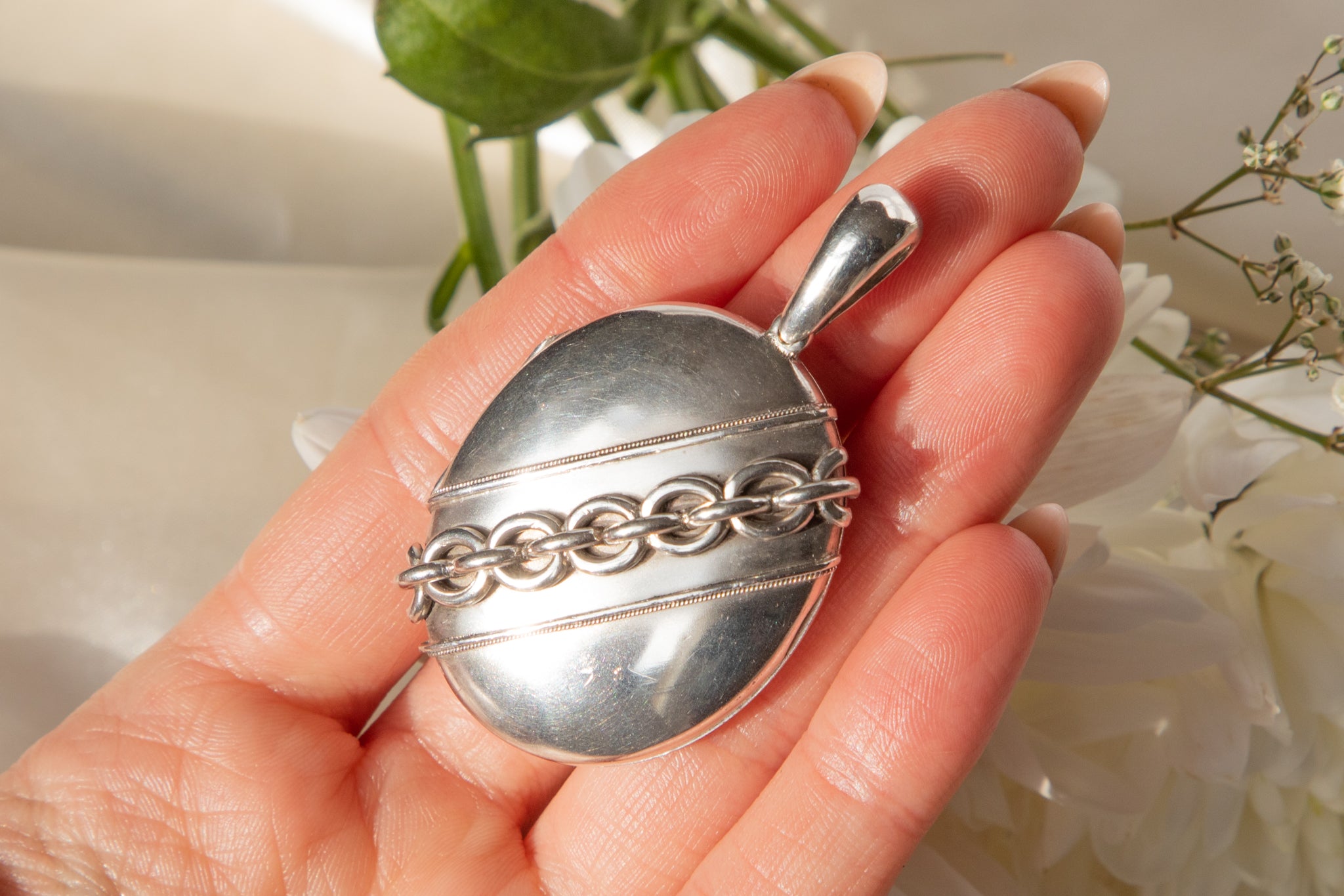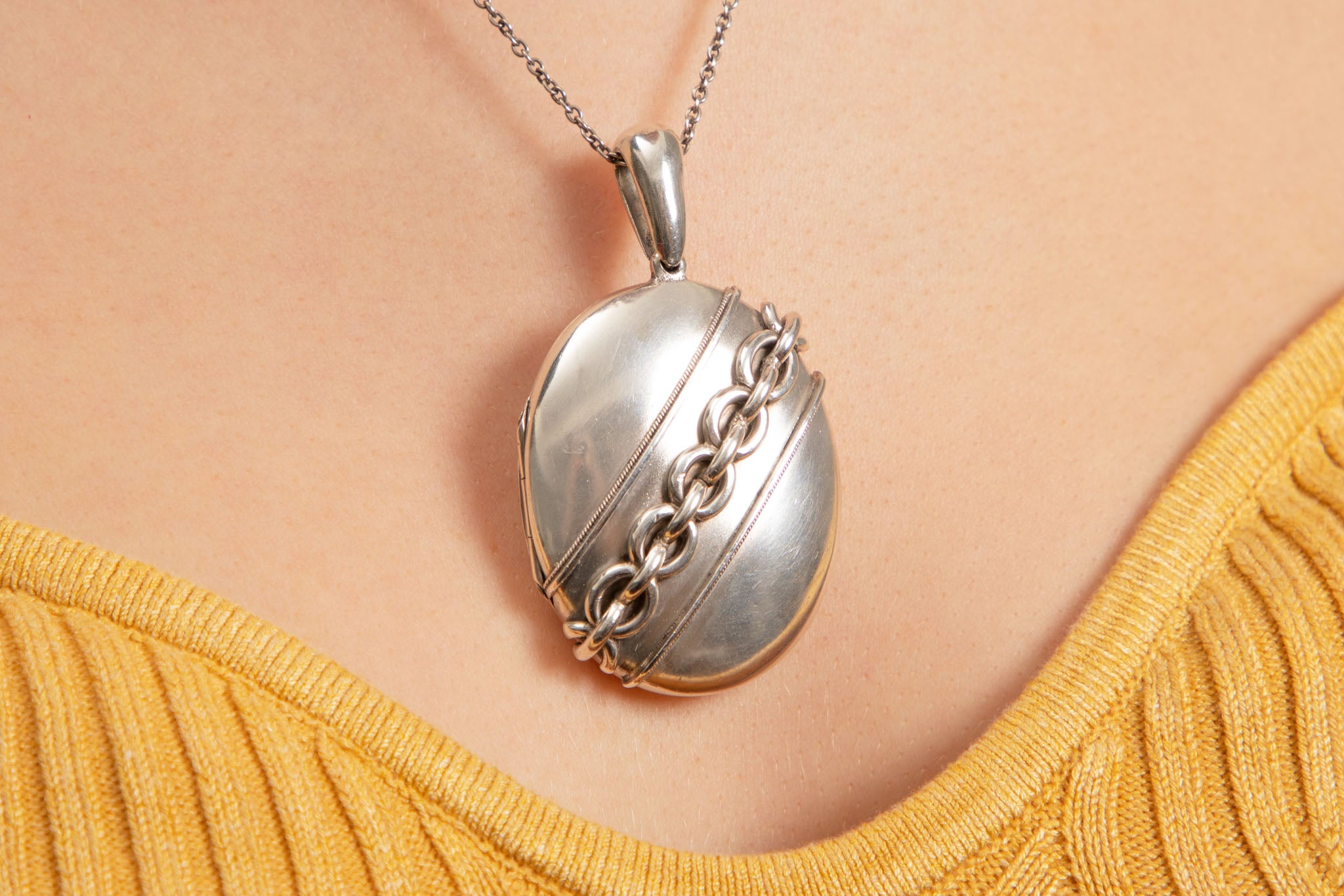 When opened she has space to keep two large photos in either side and with her bale, she can be affixed to a chunkier chain to keep in theme with the locket itself. At 21.5g this Victorian Silver locket is a robust piece that you can wear with confidence as often as you please!