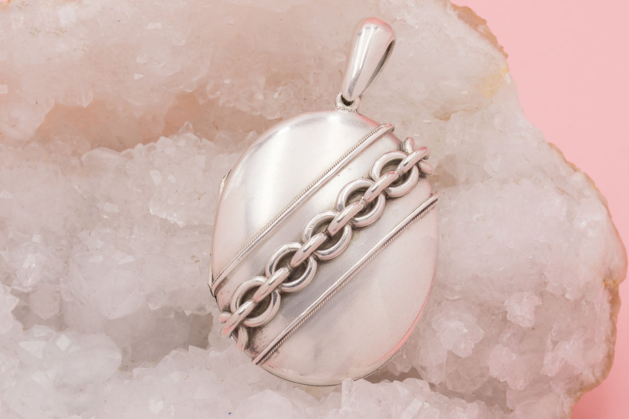 An antique Sterling Silver 'chain' motif locket to add a striking statement to your repertoire! Her unmissable belcher chain motif runs diagonally across the front of the large locket, creating depth, texture and an overall gothic feel to the piece.