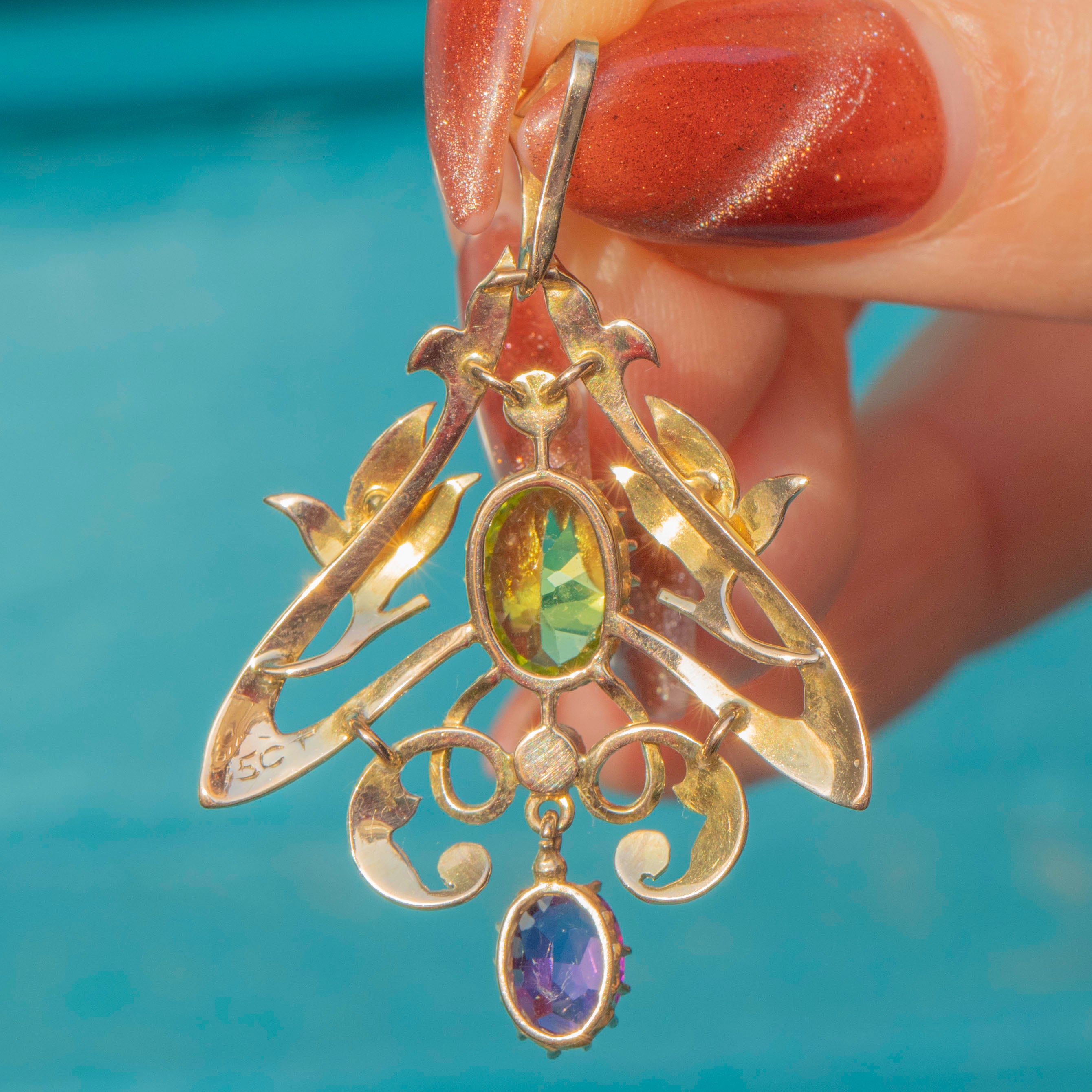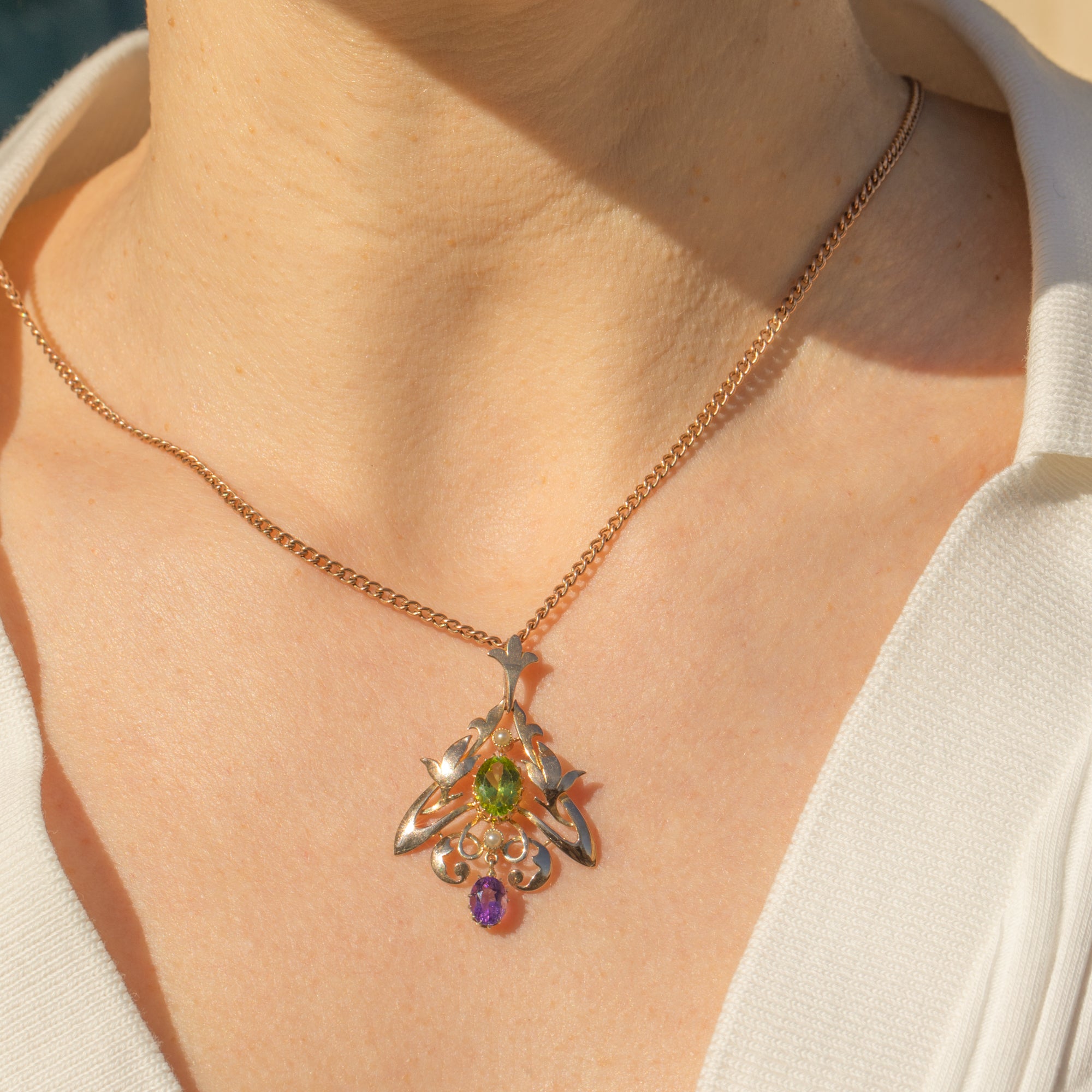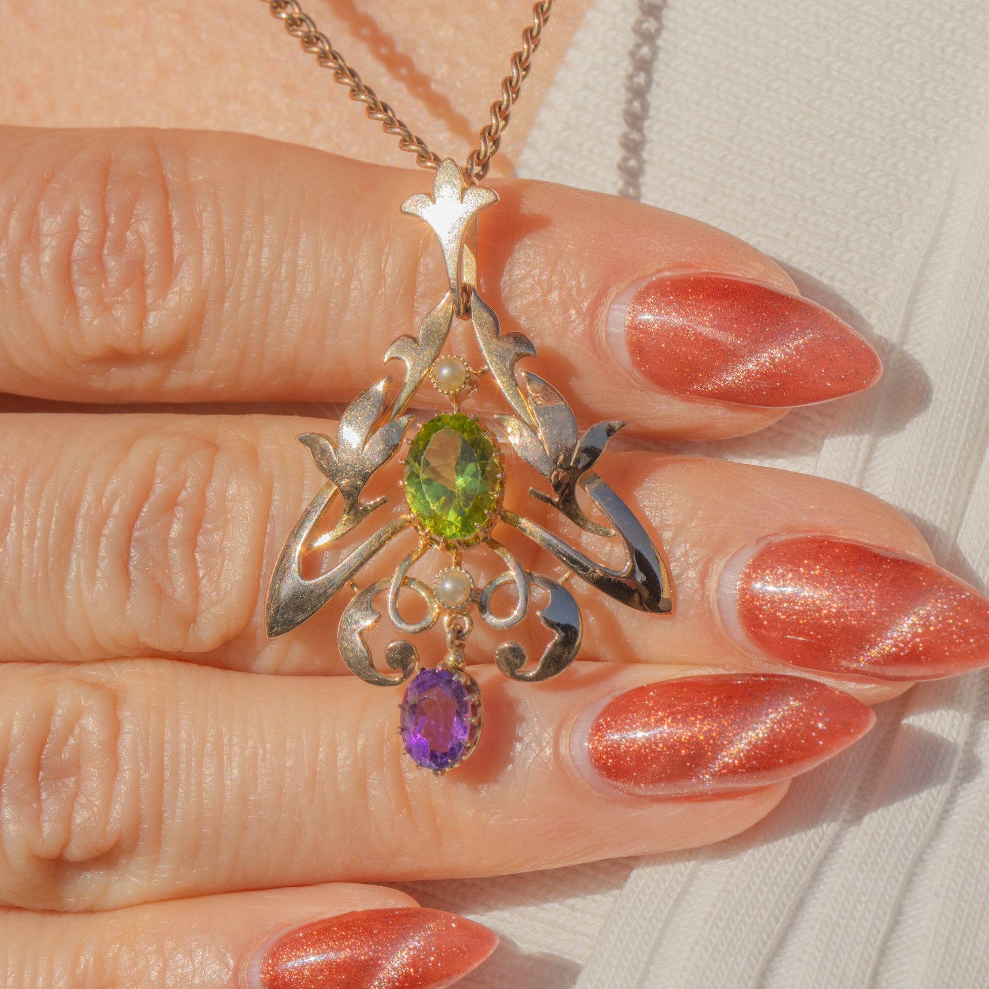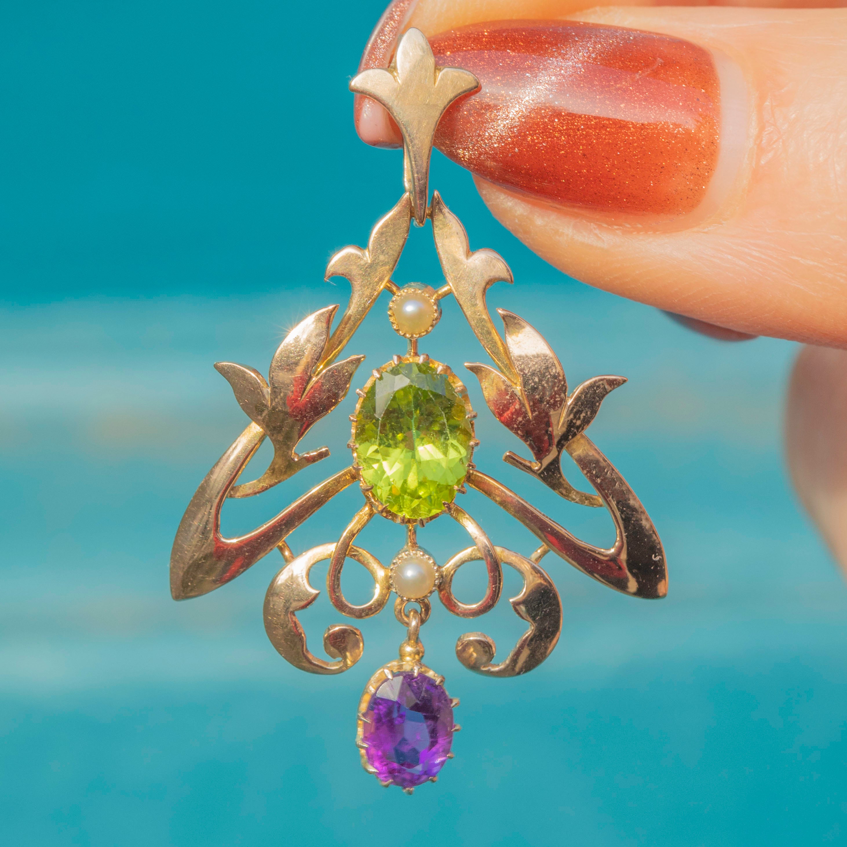 This antique Suffragette 15ct Gold Peridot Amethyst Pearl  pendant is a highly coveted piece of Art Nouveau jewellery! The brightly saturated 15ct Gold has been formed into an eye-catching design, with sweeping curved lines and floral motifs that perfectly capture the aesthetic of the Art Nouveau era.
