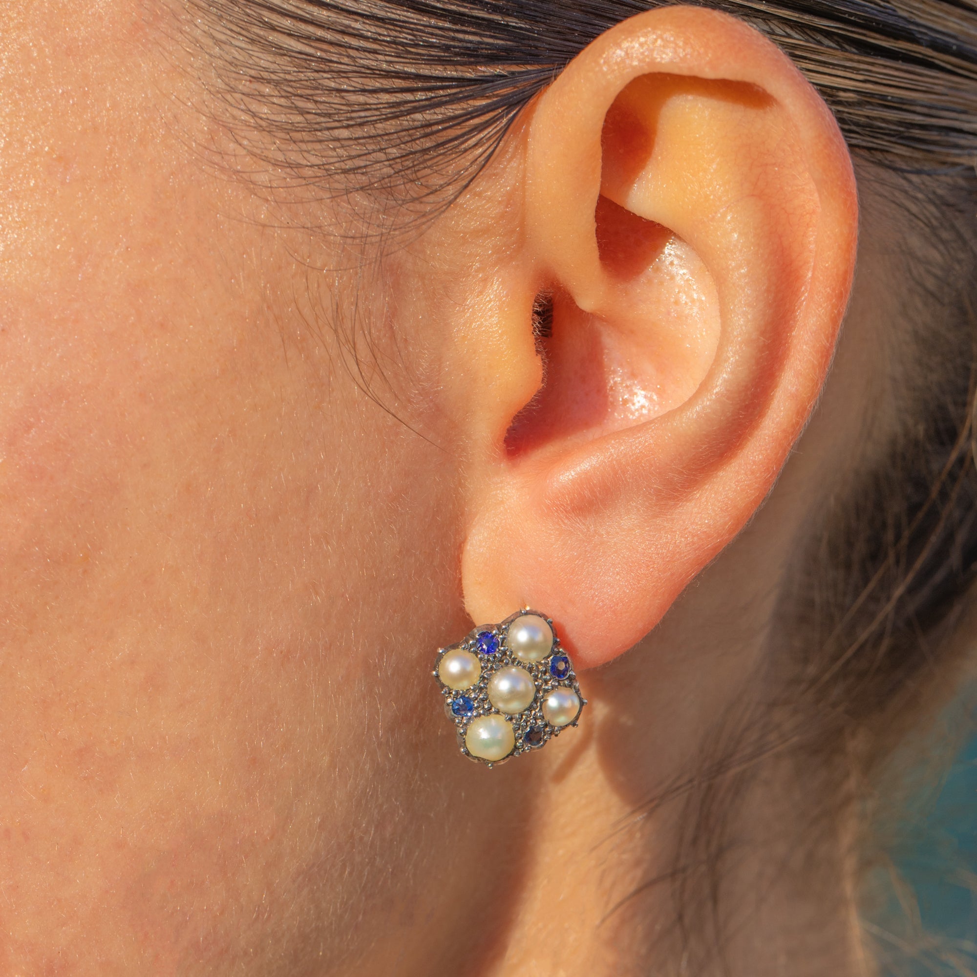These antique Edwardian cluster earrings are beautifully luminous, full of soft colour and elegant sparkle. Each earring forms a rounded floral cluster, with dark Tanzanite stones complemented by creamy Pearls for a refined early 20th-century look.