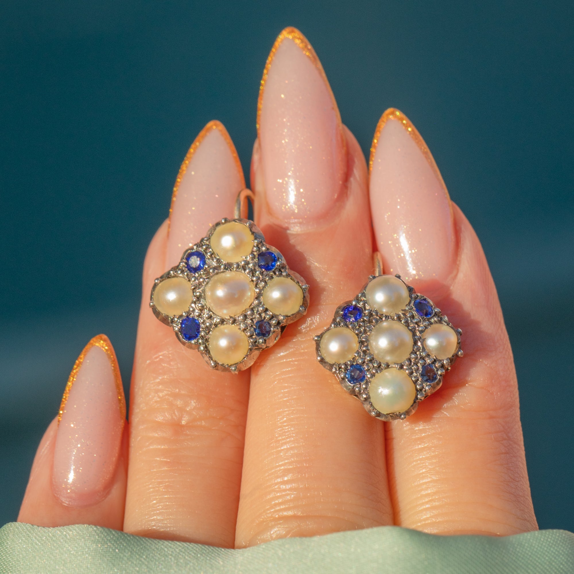 EXCELLENT: The stones are bright and well-matched with no visible abrasions. Pearls have lovely lustre with minimal wear. Hooks and settings are secure and in excellent antique condition with only gentle age-consistent surface wear.