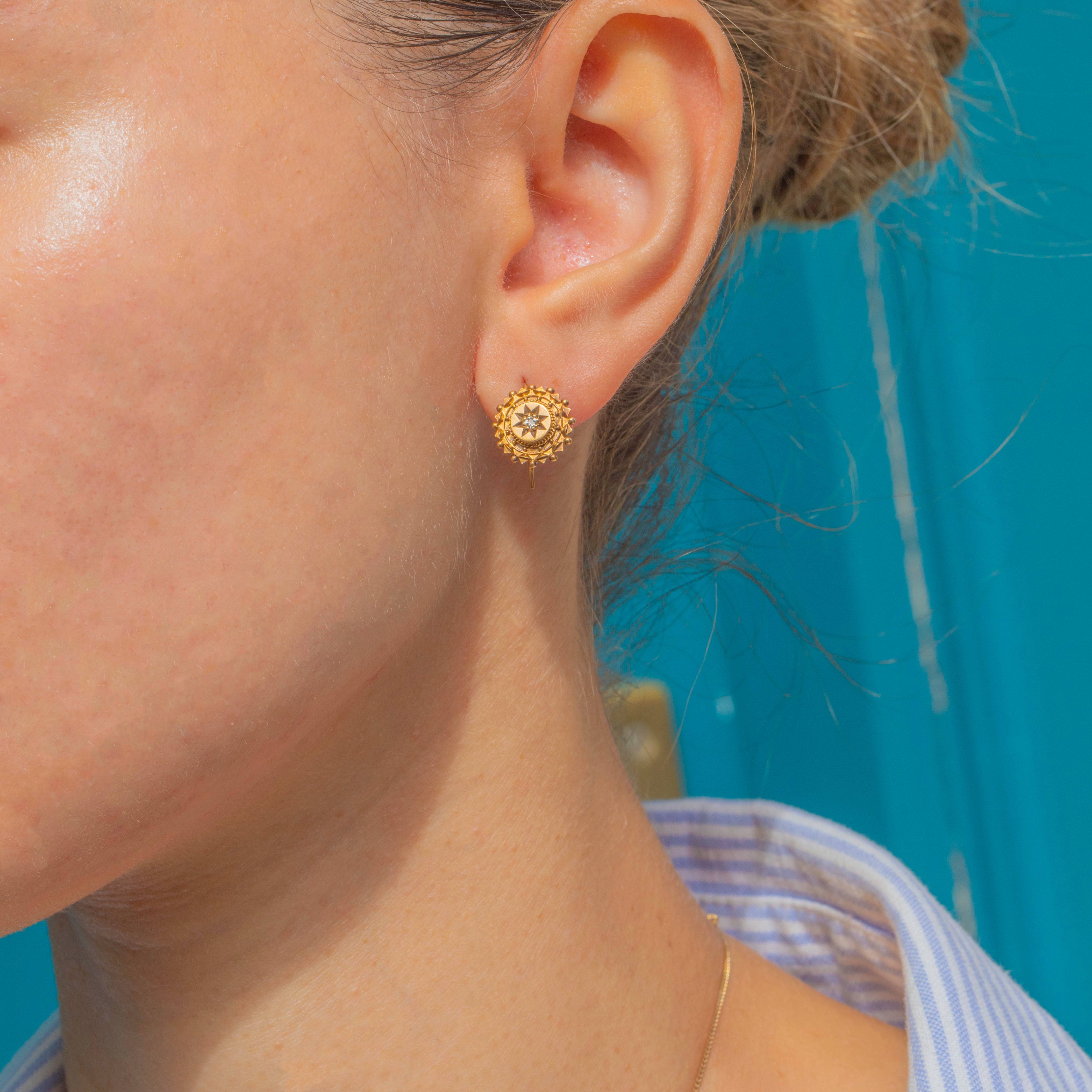 Measuring 1cm in diameter (excluding hooks), the earrings have a wonderful presence despite their light weight of just 1.6g for the pair. Their warm high-carat Gold colour and intricate hand-workmanship give them a timeless beauty, and the Diamonds add a subtle sparkle to the textured design.