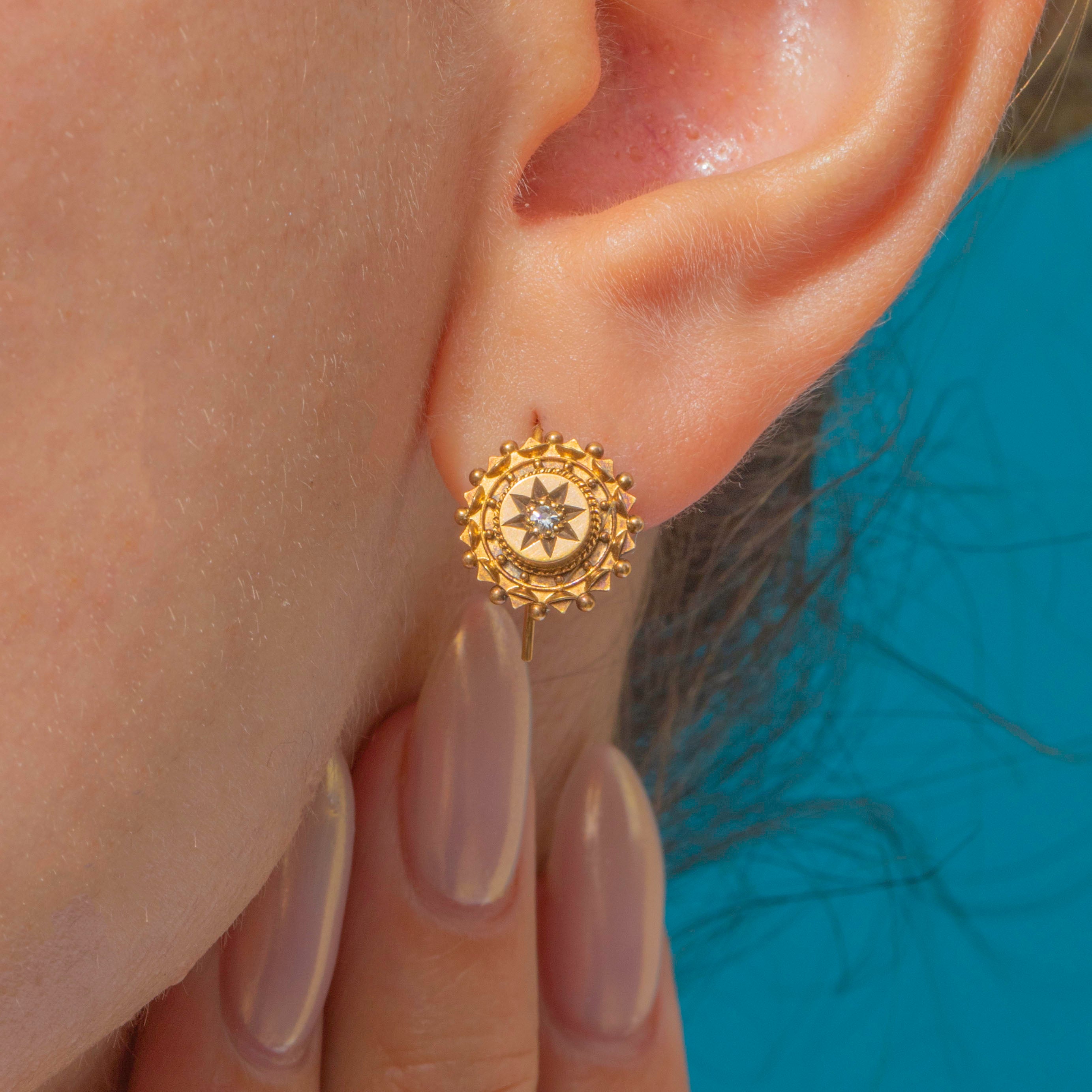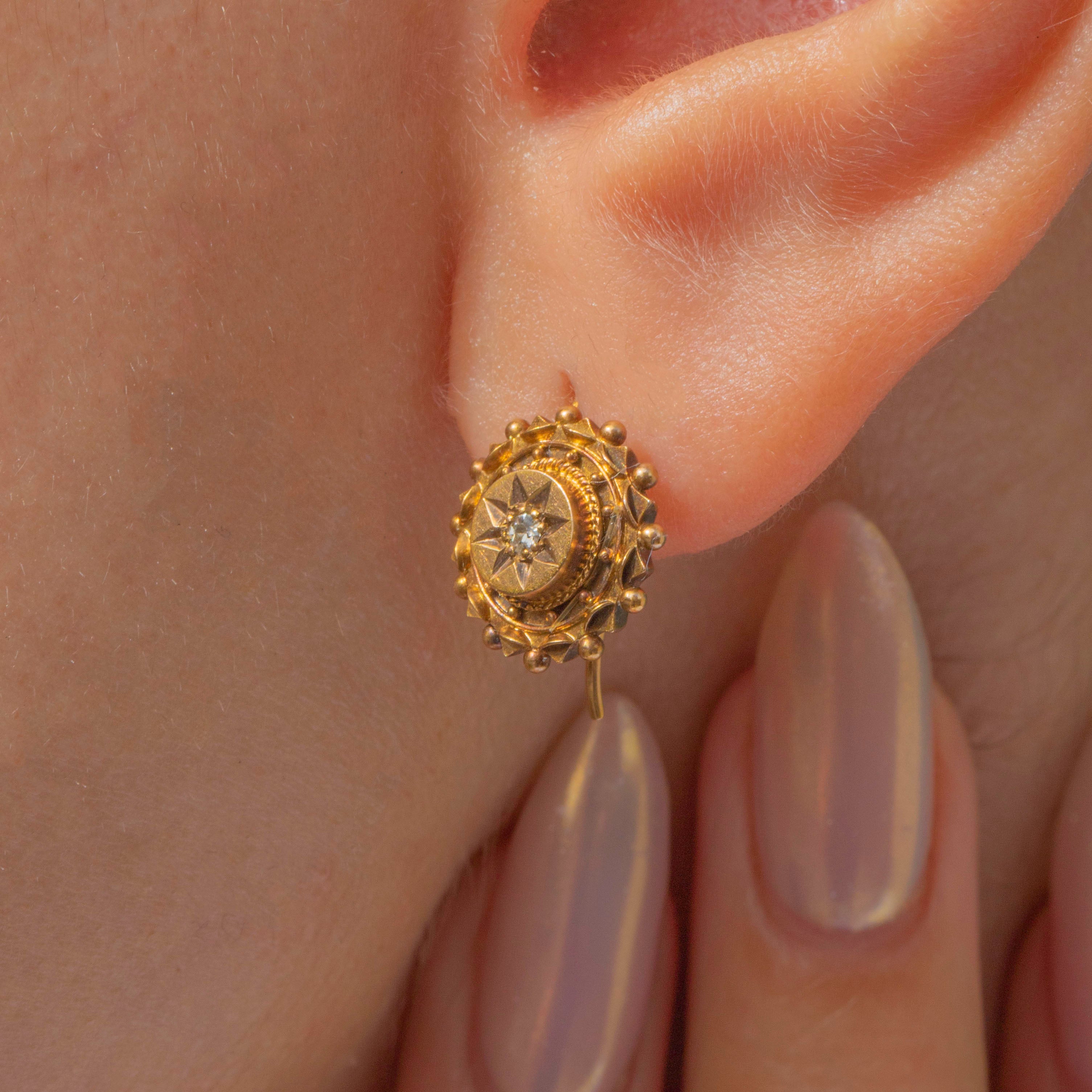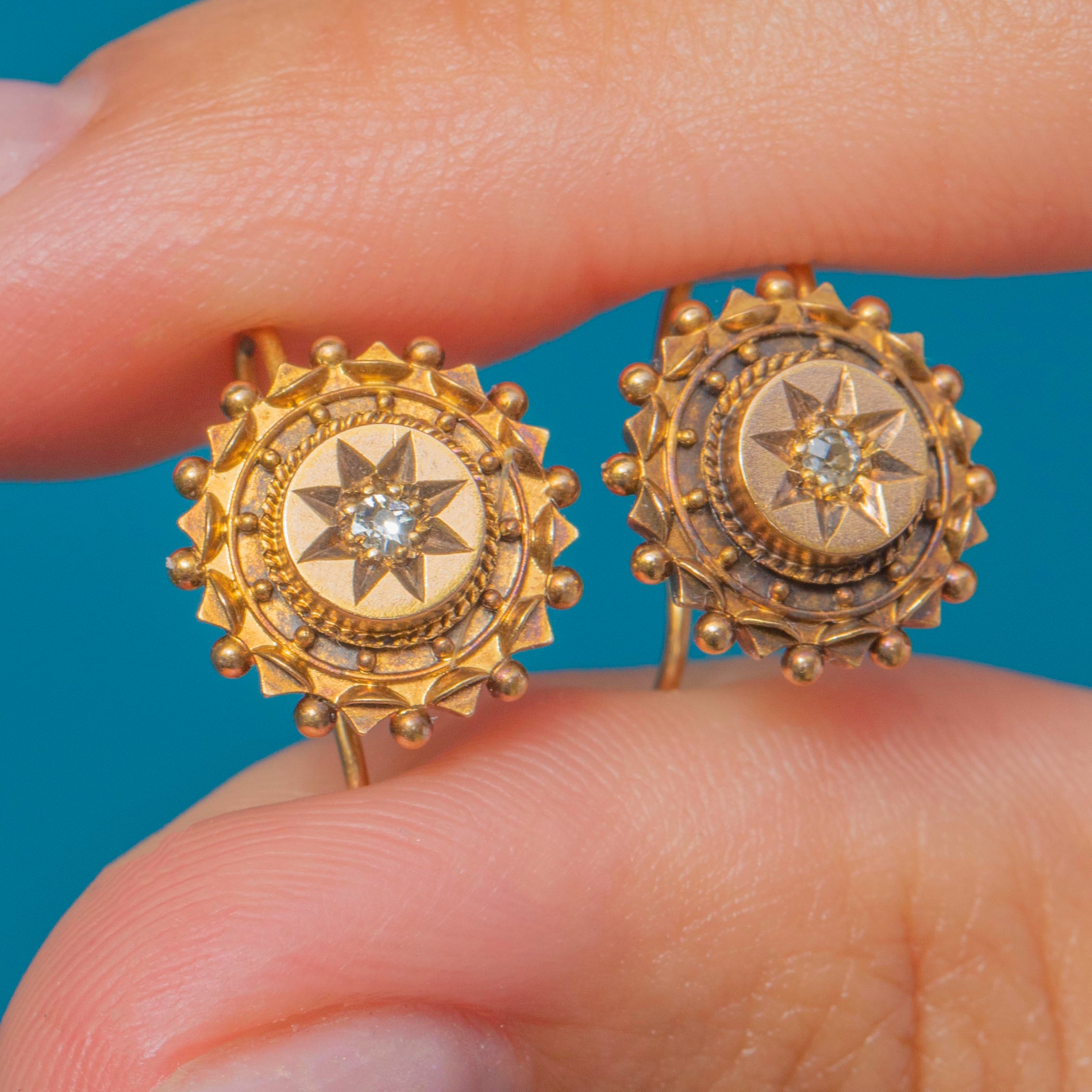 These Antique Victorian earrings are a striking example of Etruscan Revival design, crafted in rich 15ct Gold c.1850. Each earring features a central star-set old mine cut Diamond, surrounded by ornate granulation and applied beadwork in the bold Revival style inspired by ancient Roman jewellery.
