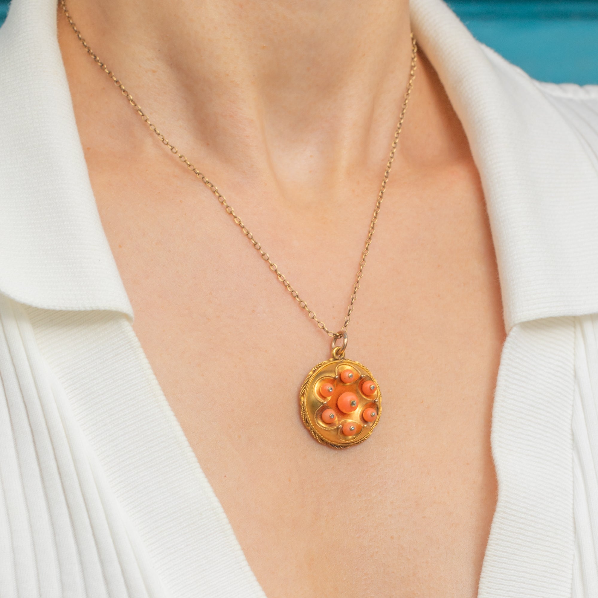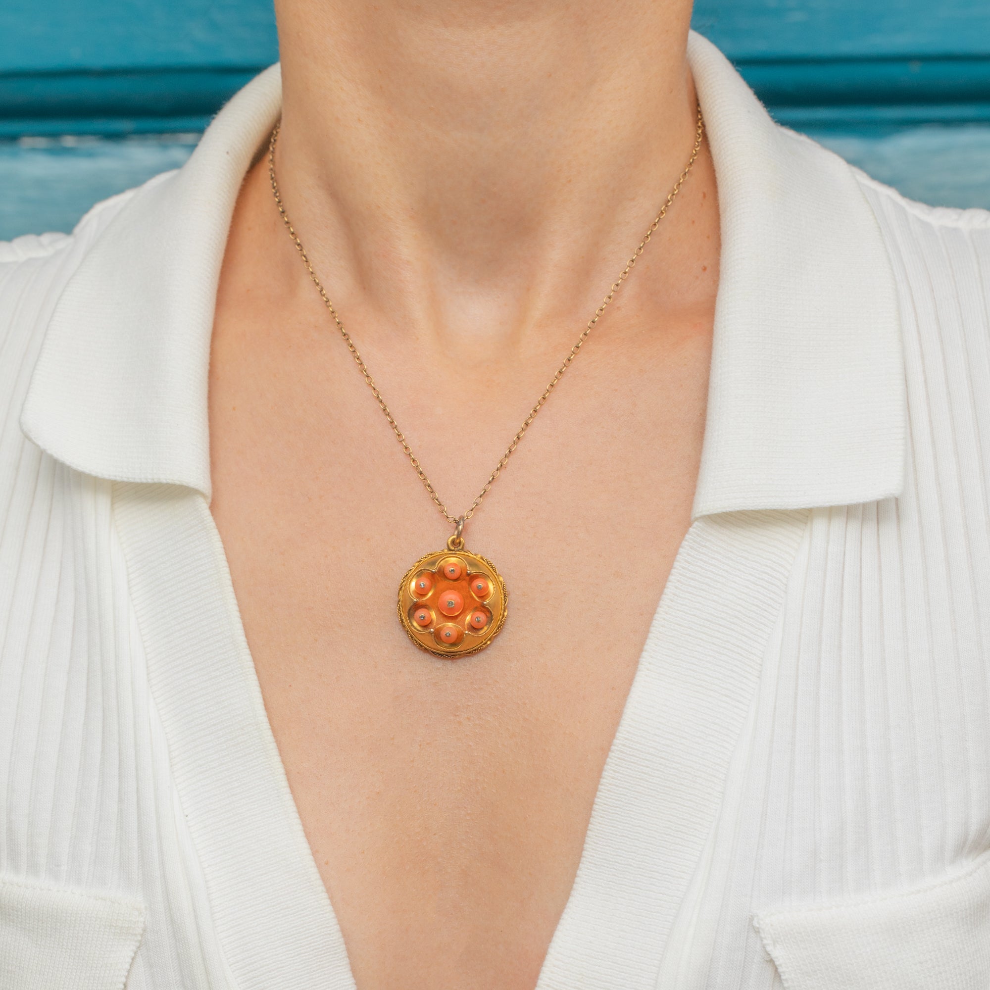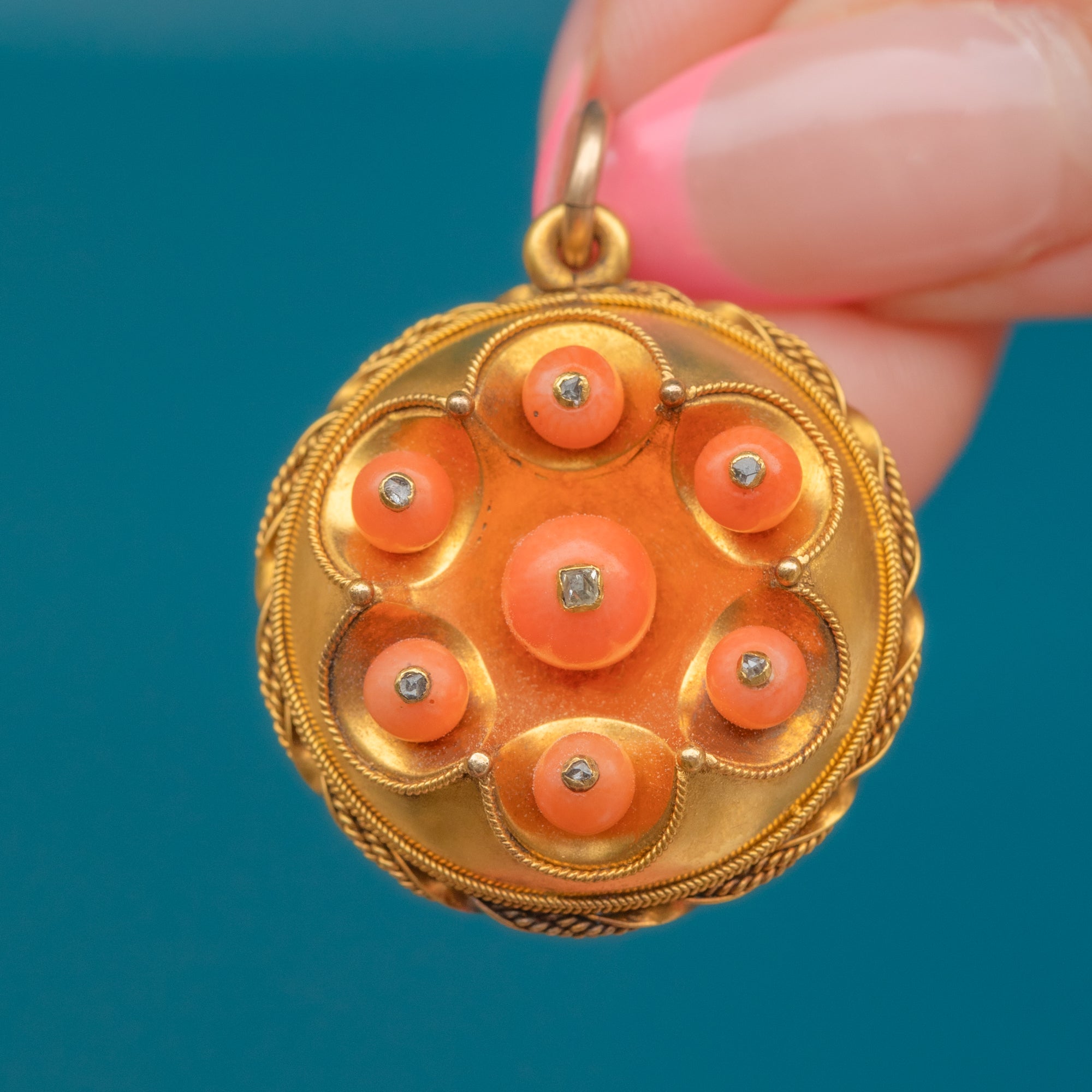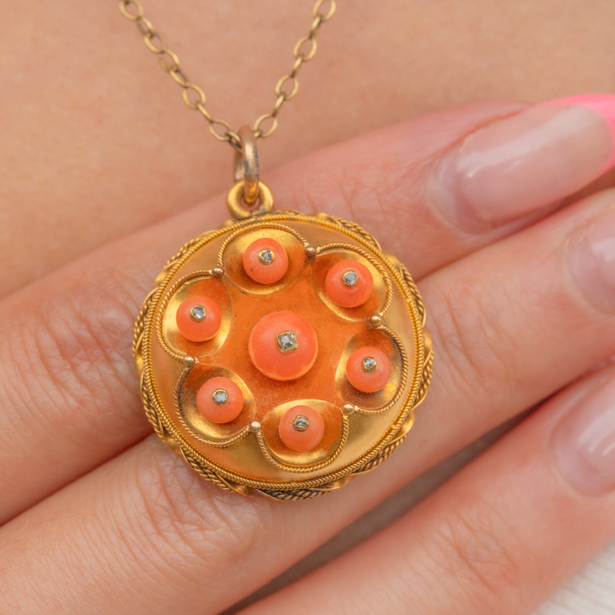 This striking antique 18ct Gold Coral and Diamond locket is simply brimming with gorgeous details! The burst of clementine orange Coral beads, the typical swirly Etruscan Revival rope Gold-work and all those dainty Diamonds combine to create the most dazzling jewel!