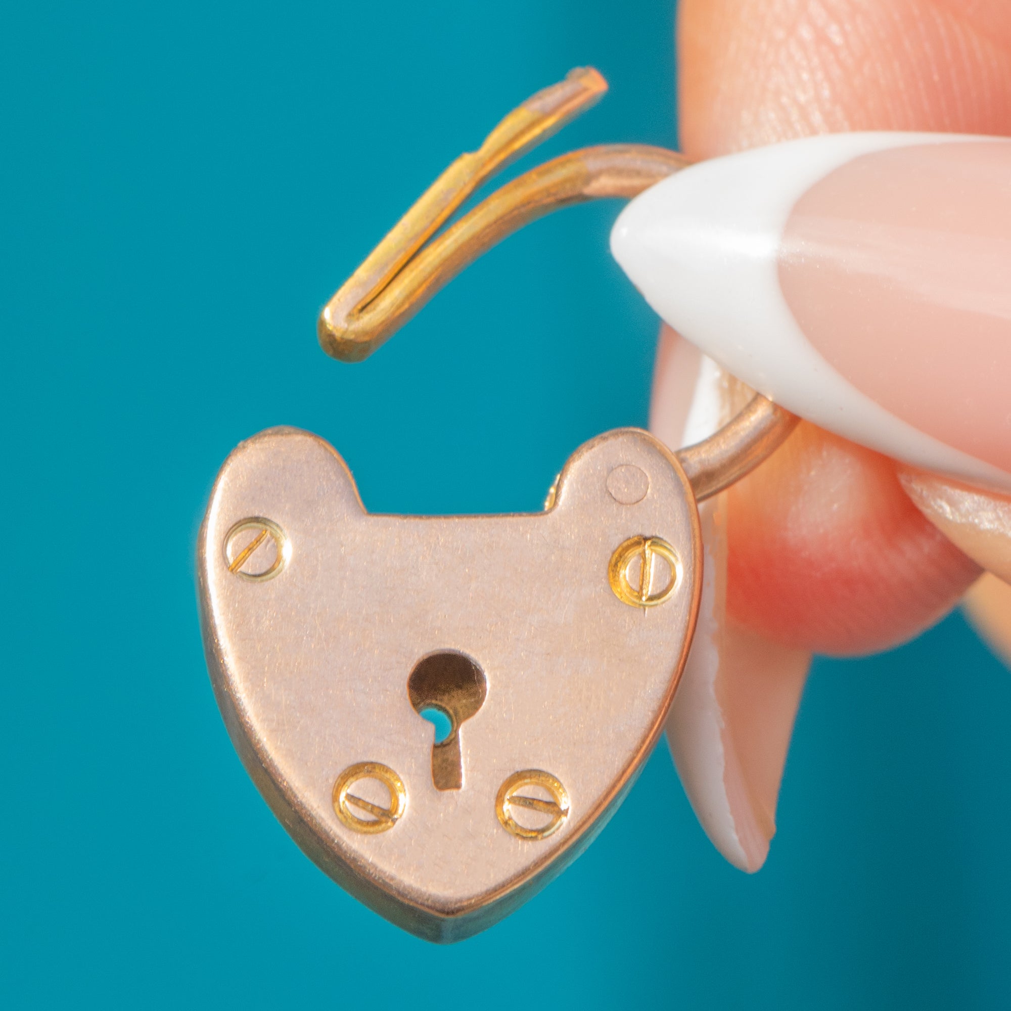 A timeless Victorian 9ct Gold heart padlock pendant, glowing with a warm yellow-rosy hue and finished in a sleek high polish. The face is adorned with a sweet keyhole motif and tiny faux screw details, while the working hinged shackle clicks closed smartly and doubles as the bail for effortless wear as a pendant.