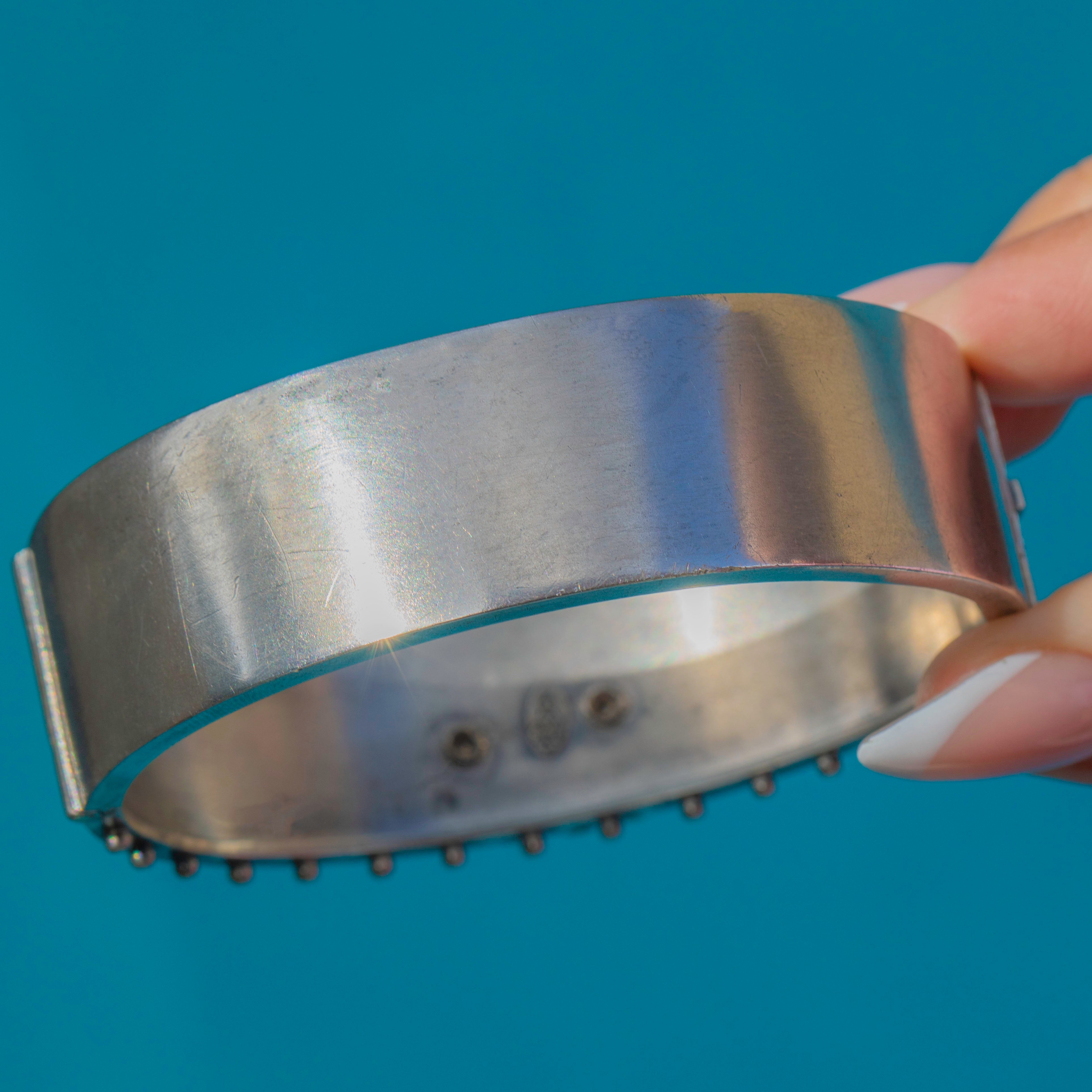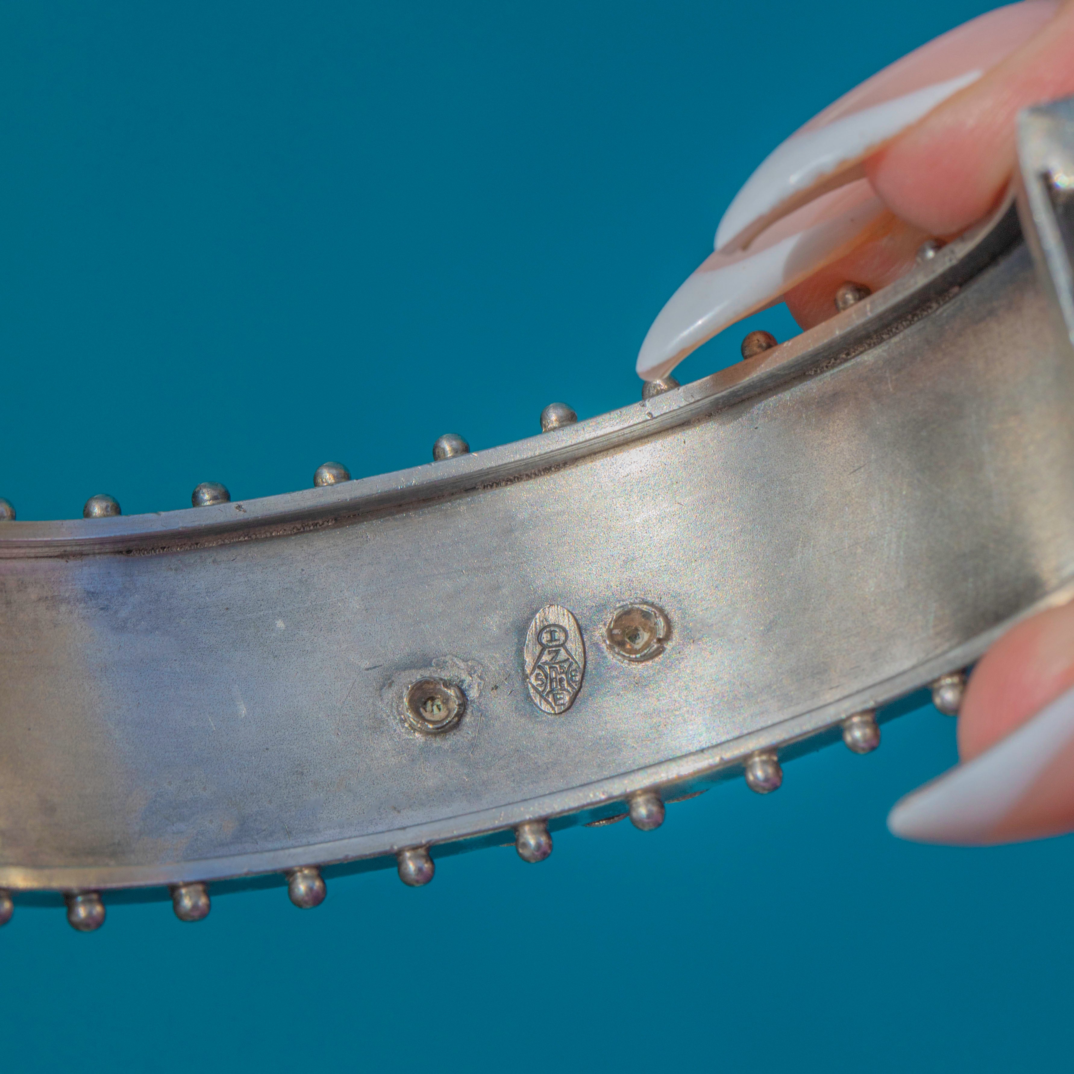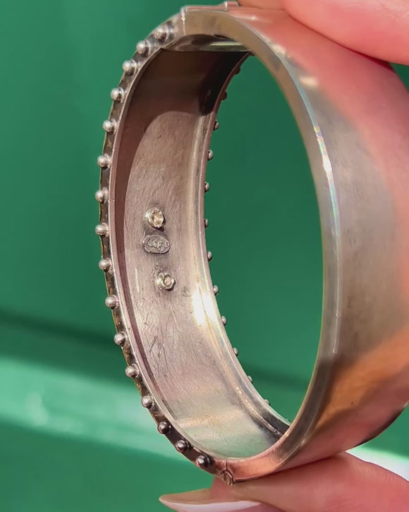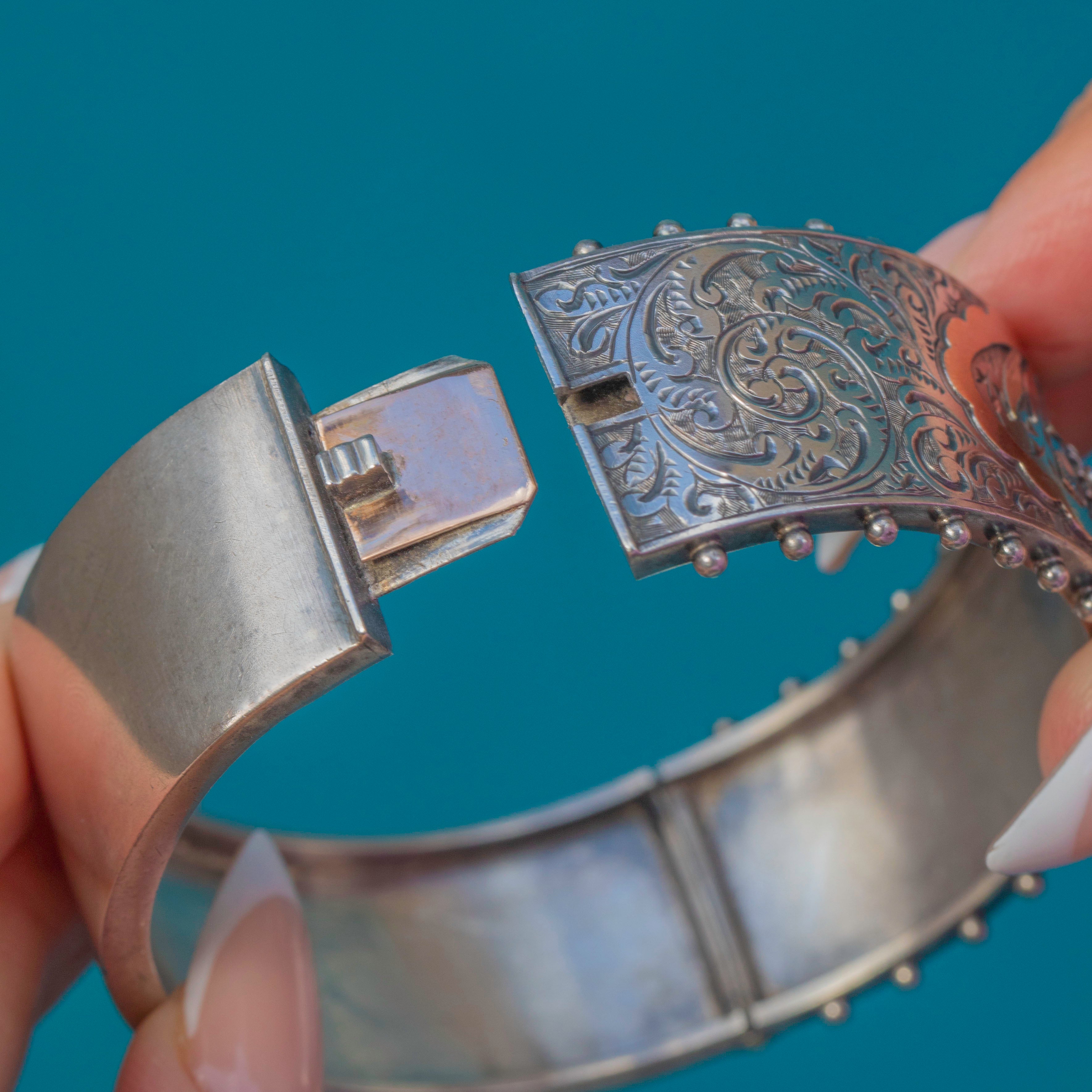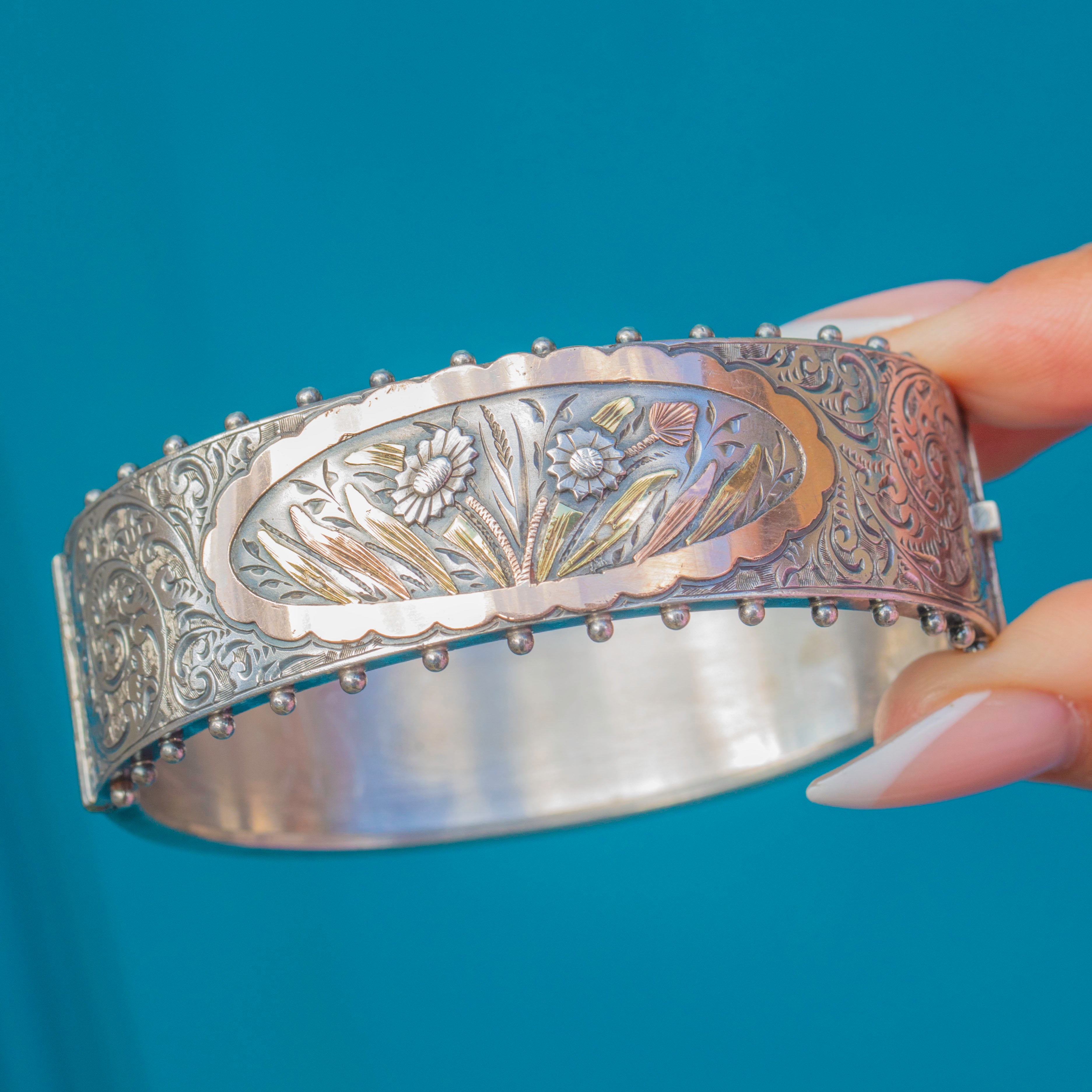 EXCELLENT: This bangle is in superb antique condition. The Silver retains a rich patina that highlights the engraving and mixed-metal details beautifully. The Gold accents are intact and vibrant, with minimal signs of age-related wear. The hinge and clasp work securely, making this a well-preserved and highly collectable Victorian piece.