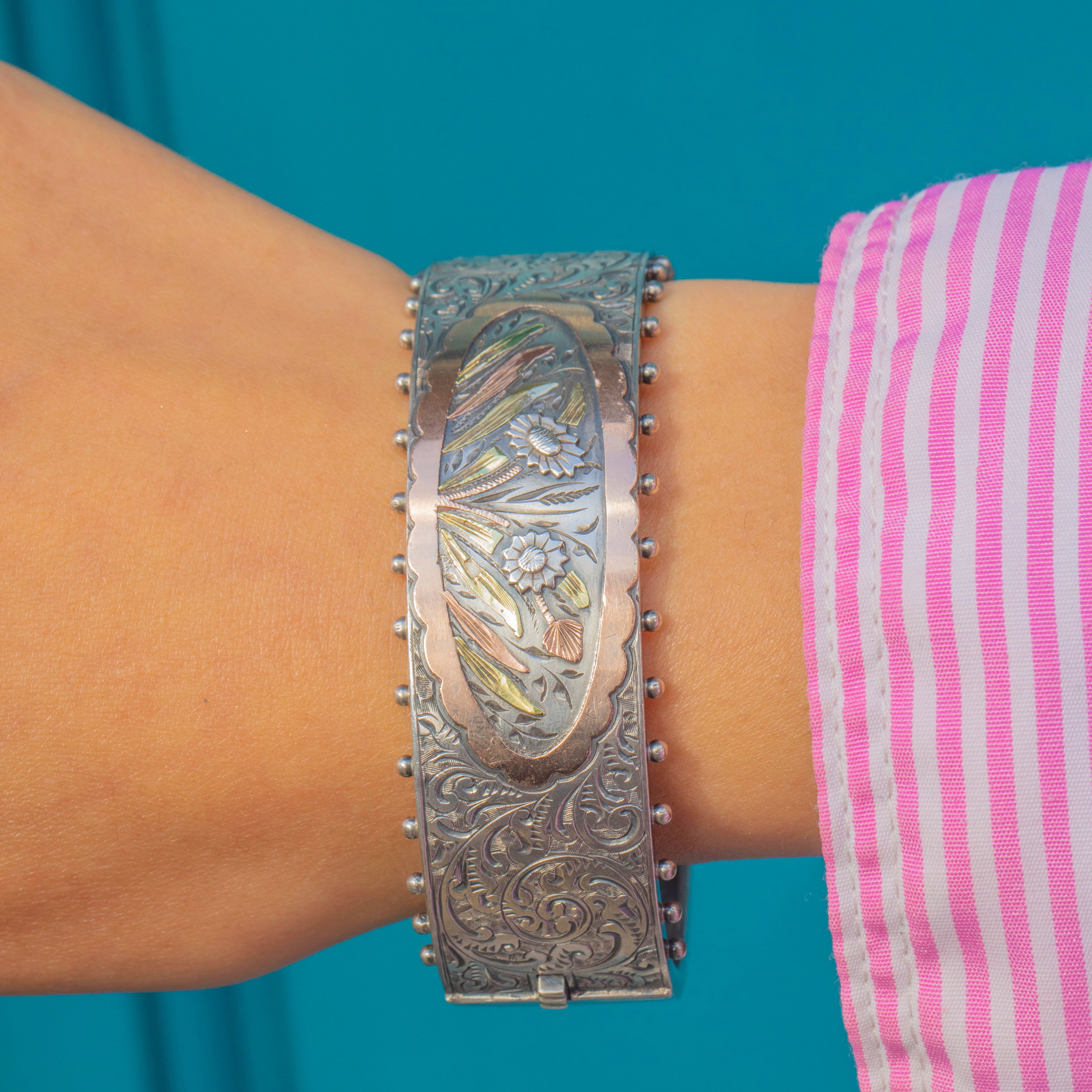 This Antique Victorian Aesthetic bangle is a rare and beautifully detailed treasure. Crafted in Sterling Silver and adorned with applied 9ct Rose and Green Gold accents, it features a charming motif of daisies and grasses in full bloom. The engraving and embossing are wonderfully crisp, with the mixed-metal details bringing colour and texture to the design.