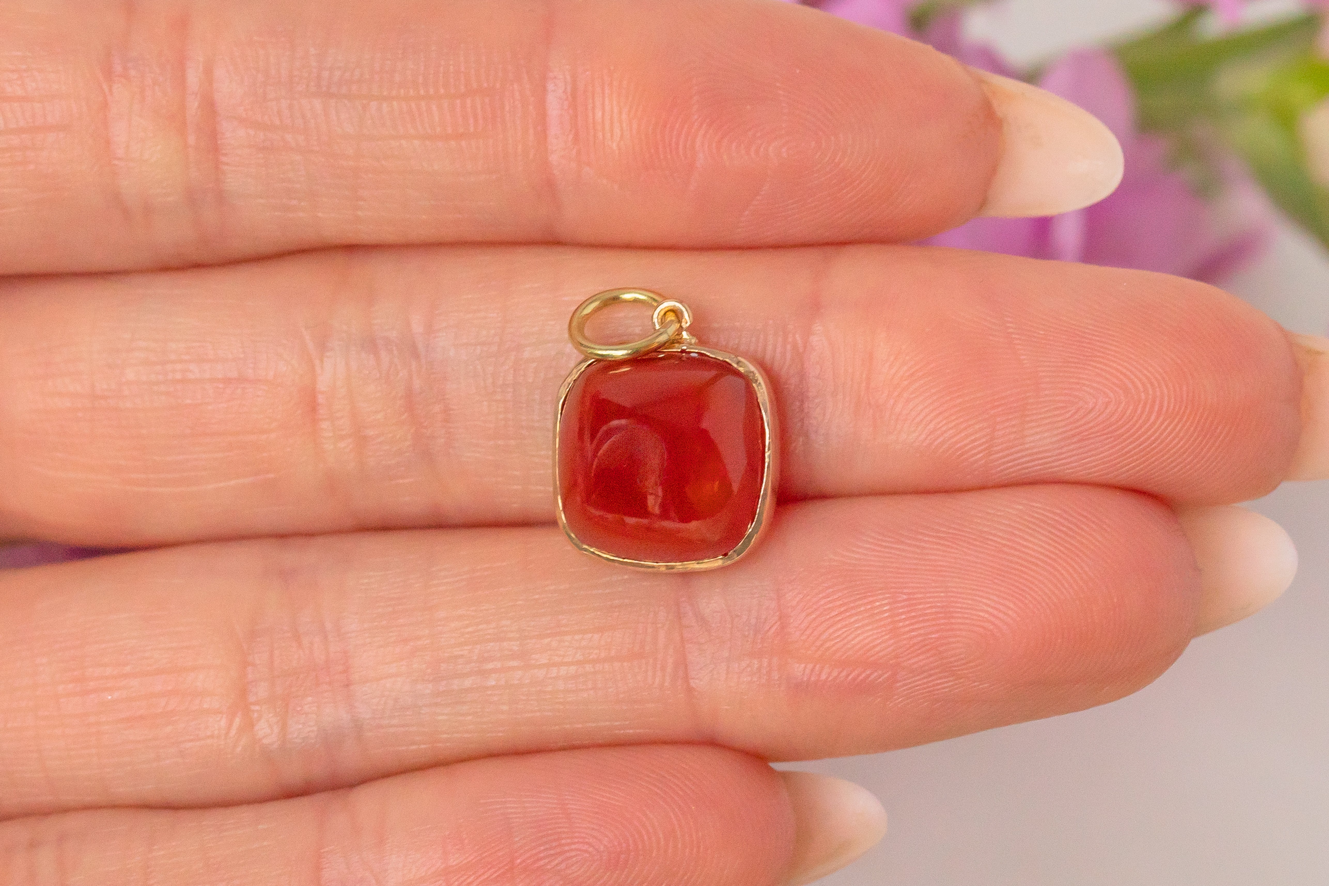 VERY GOOD. This Art Deco 14ct Gold Carnelian sugarloaf pendant is in very good condition. The Carnelian is secure within her setting and her sugarloaf cut is smooth to the touch, with a gorgeous shine. There are small chips on the back of the Carnelian, however, this cannot be seen when worn. There are a few dings on the bezel setting at the back, but it looks pristine face-on and has a lovely buttery hue throughout. With a soldered jump ring, this antique Carnelian charm can be worn with the utmost confidence!