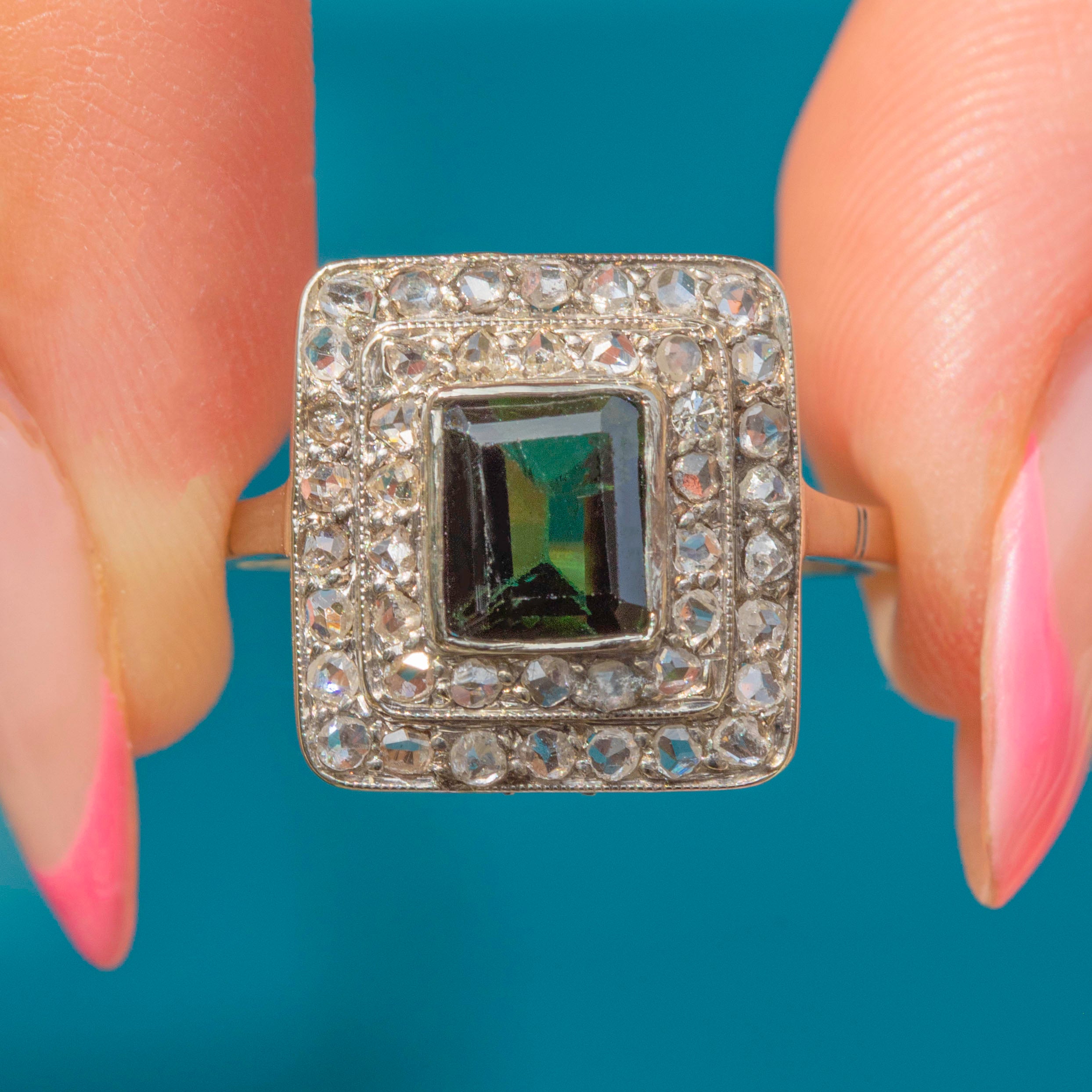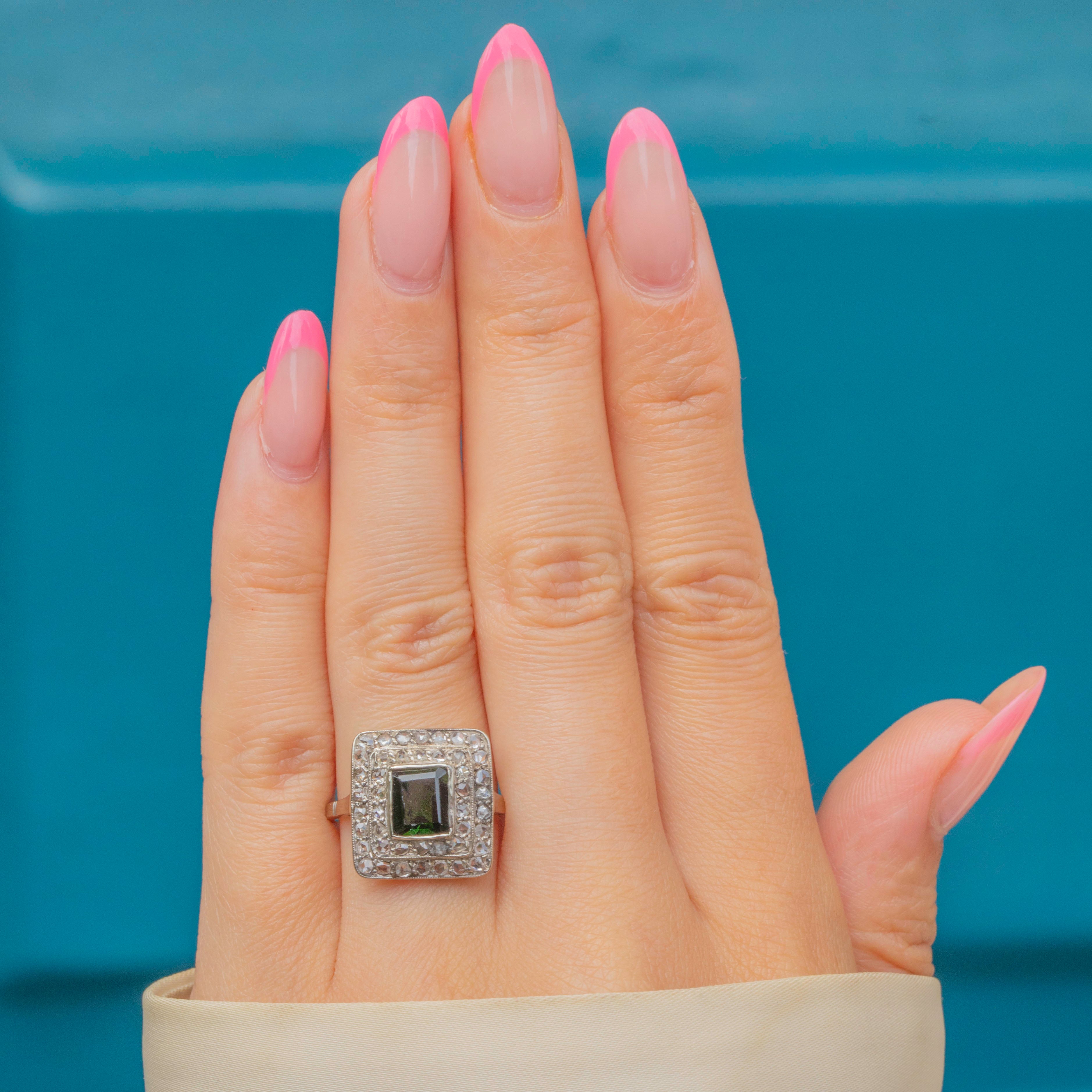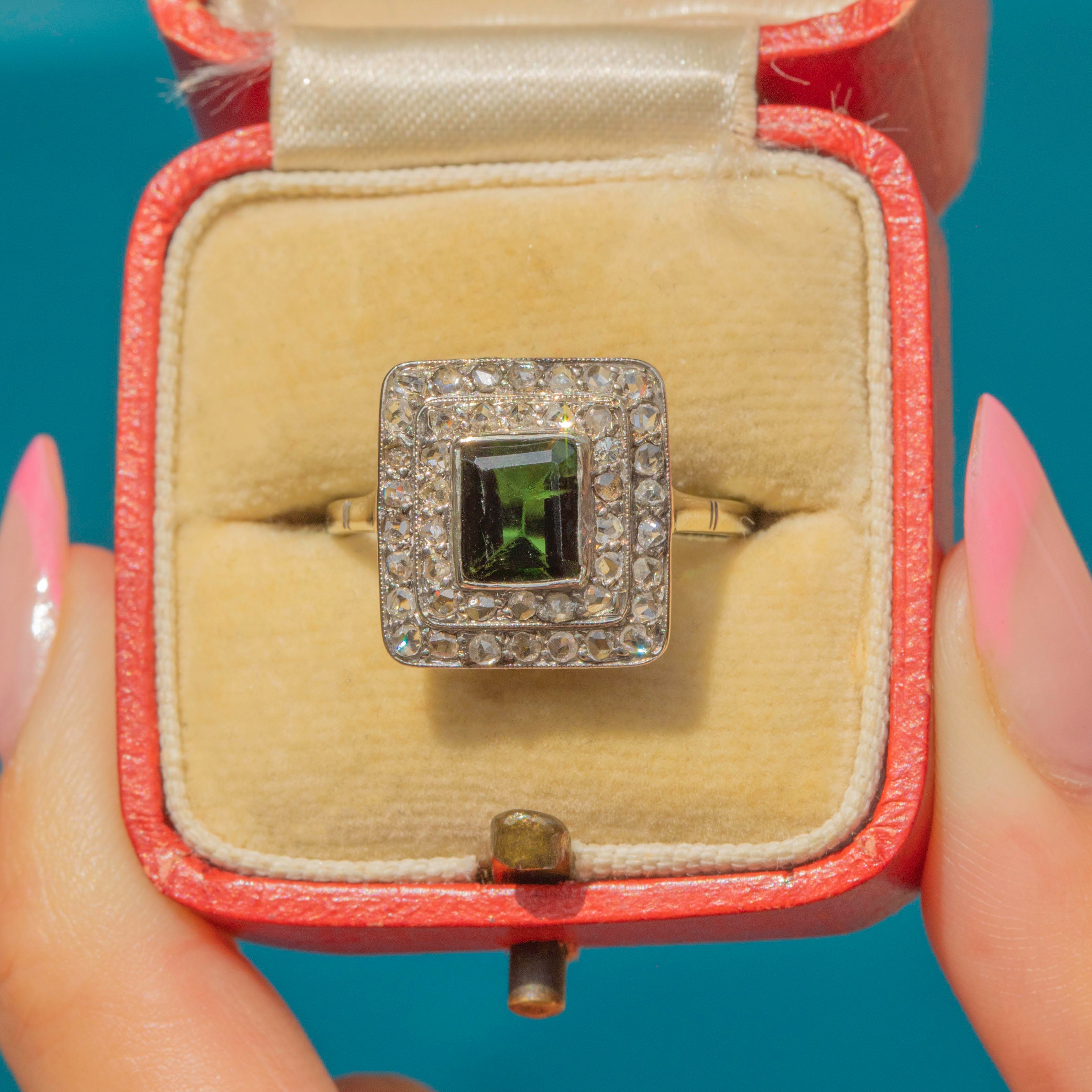 Circa 1920, this Art Deco 14ct Gold green Tourmaline Diamond cluster ring encapsulates everything we know and adore about the Art Deco period. The perfectly formed geometric face and plethora of glittering rose-cut Diamonds, providing a charismatic sparkle that's just made for dancing, cocktail and just being fabulous!!