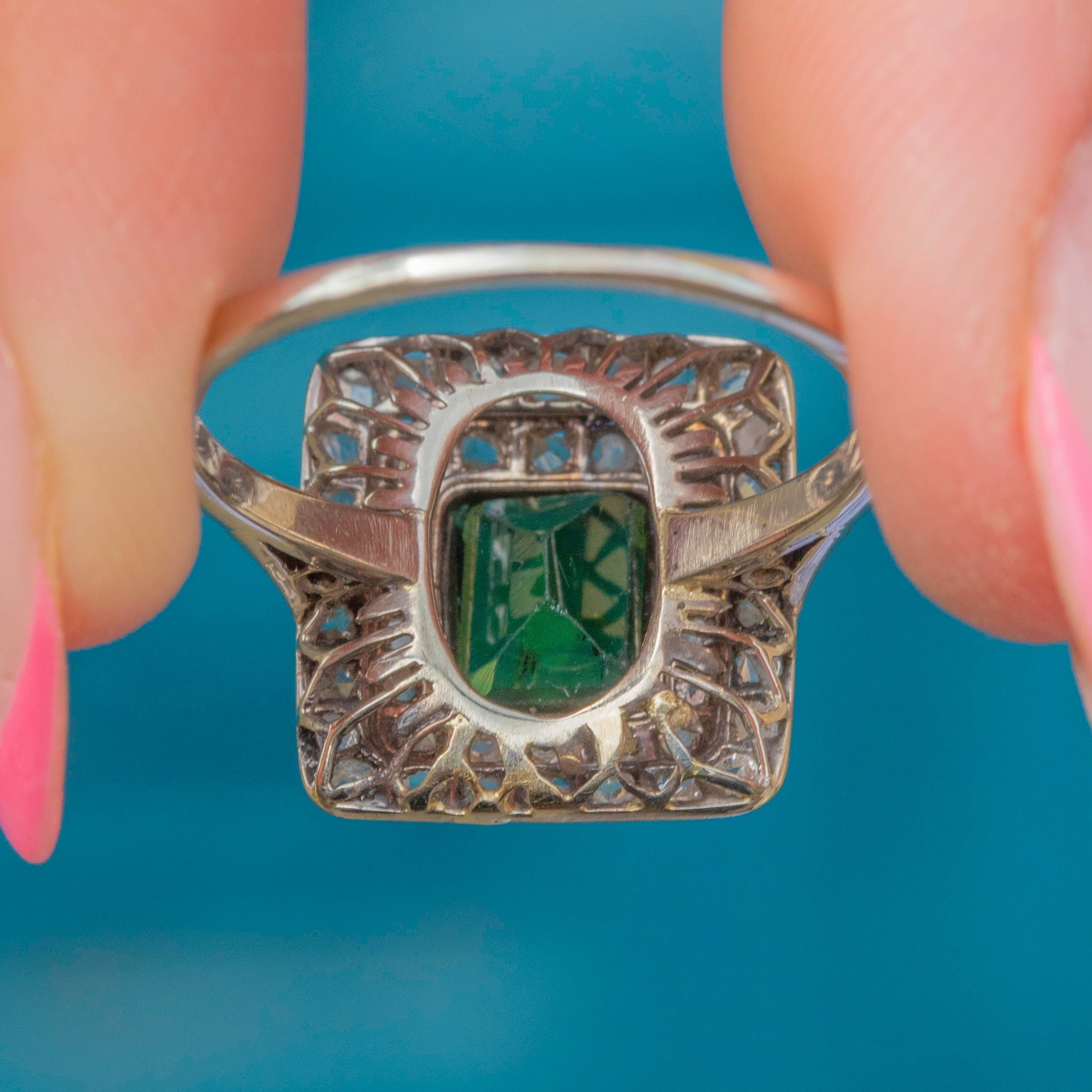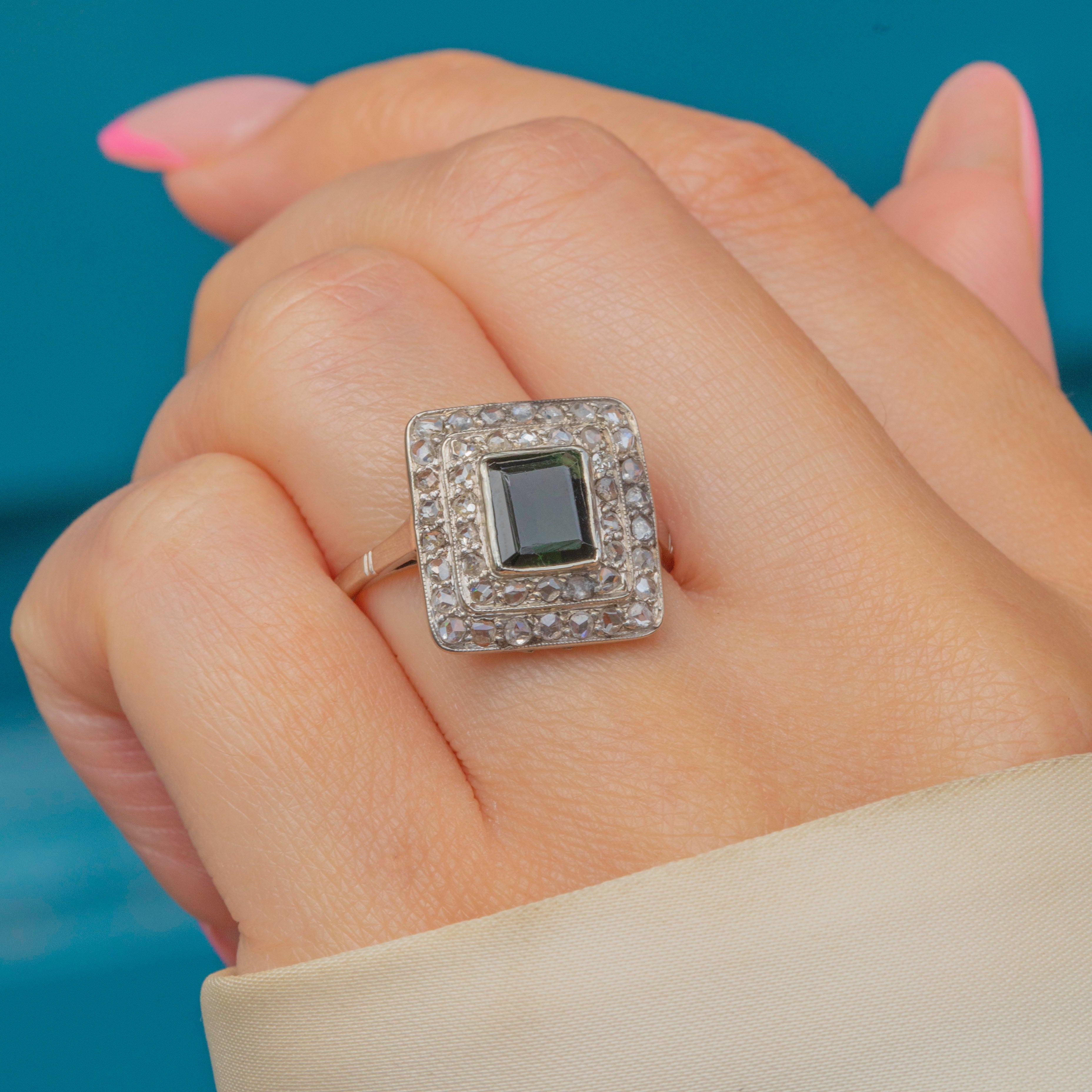 EXCELLENT. This Art Deco 14ct Gold green Tourmaline Diamond cluster ring is in excellent condition! Each gemstone is secure within its setting, with no chips or surface wear to note. The 14ct white Gold has wonderful reflective qualities and is formed with comfort in mind. The ornate Gold work on the back of the settings showcases the exceptional attention to detail throughout this Art Deco ring. We can't get enough of her and we know you won't be able to either!