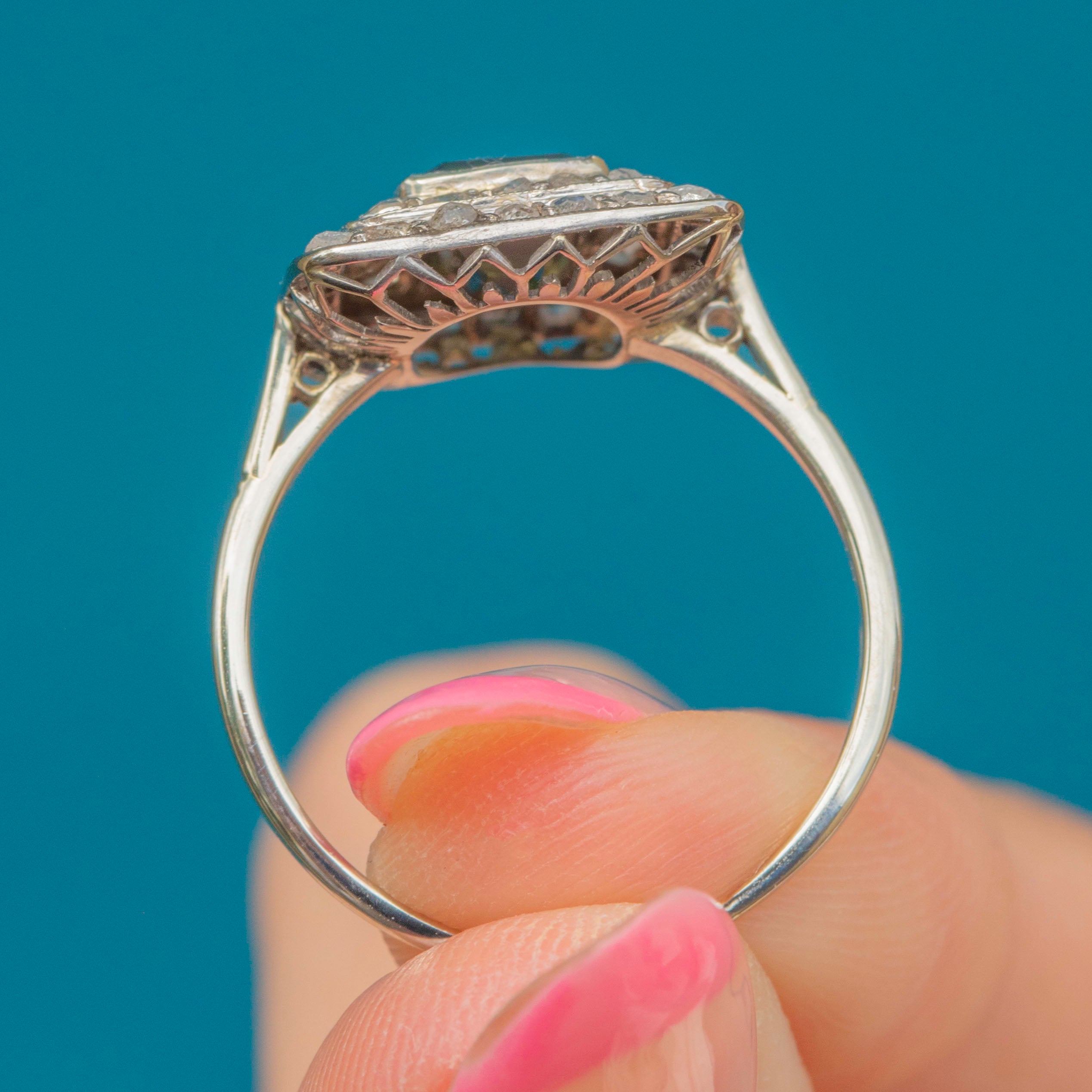 At her centre lies a deep forest green 1.65ct Tourmaline, which when held up to the light reveals a spectrum of colours, with flashes of Emerald and deep olive-green too. Bound together in an elegant hand-crafted filigree 14ct White Gold setting, this Art Deco Diamond is striking and so of it's time.