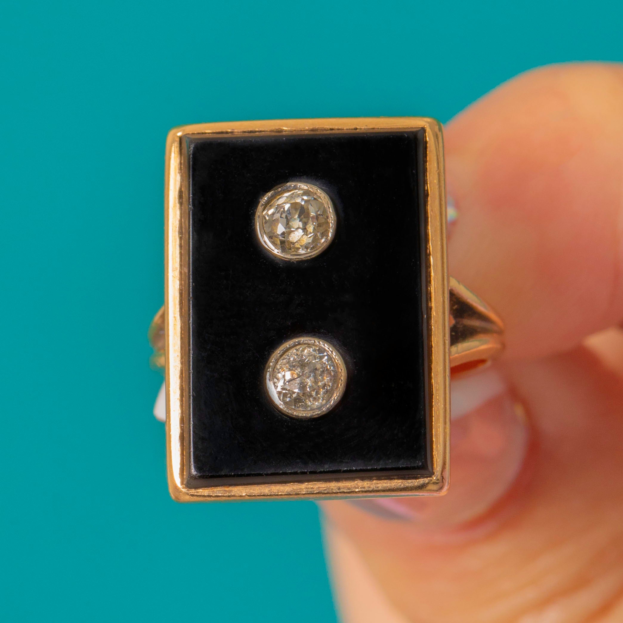 MATERIALS: Tests as 14ct Gold, Onyx, Old European Cut Diamonds (0.30ct).