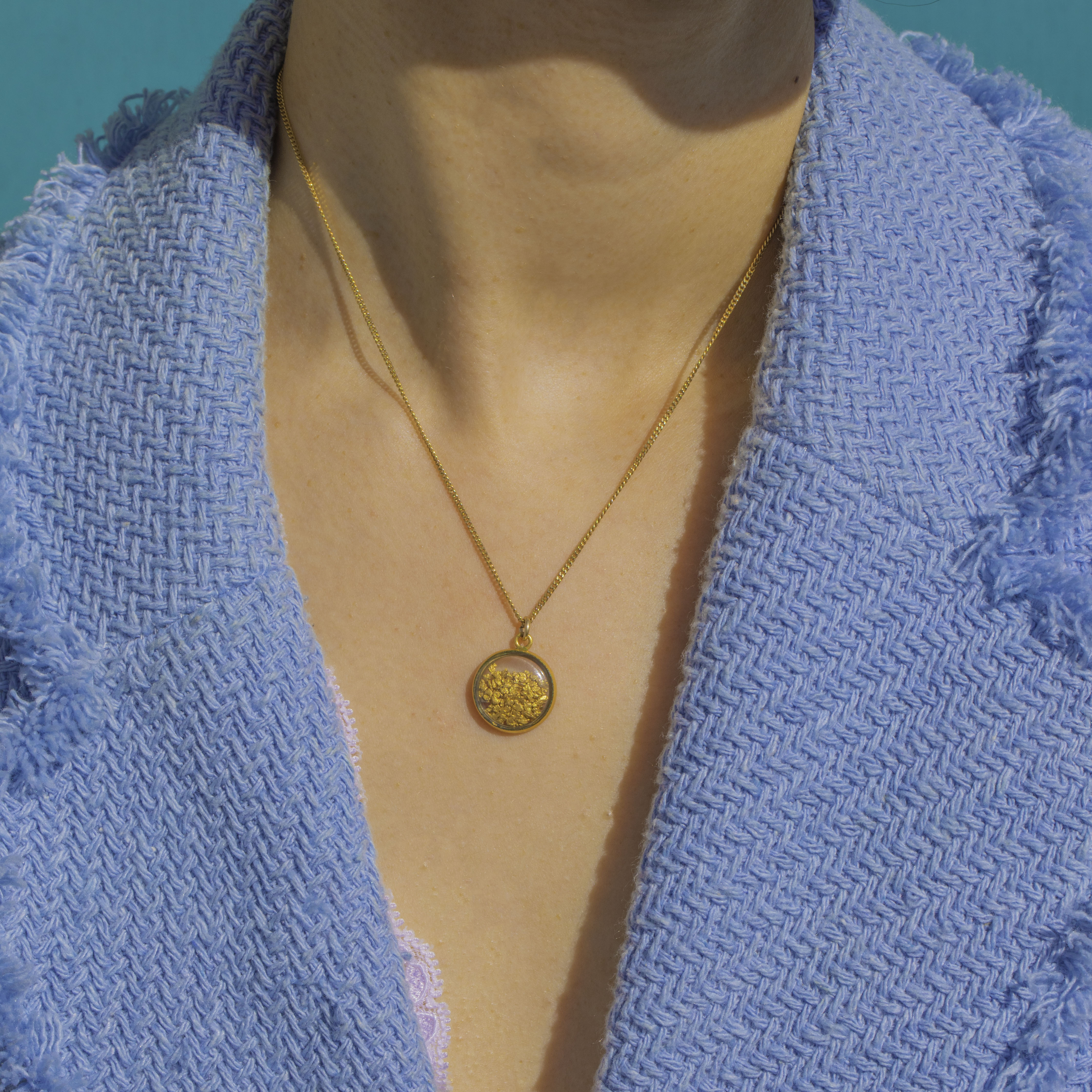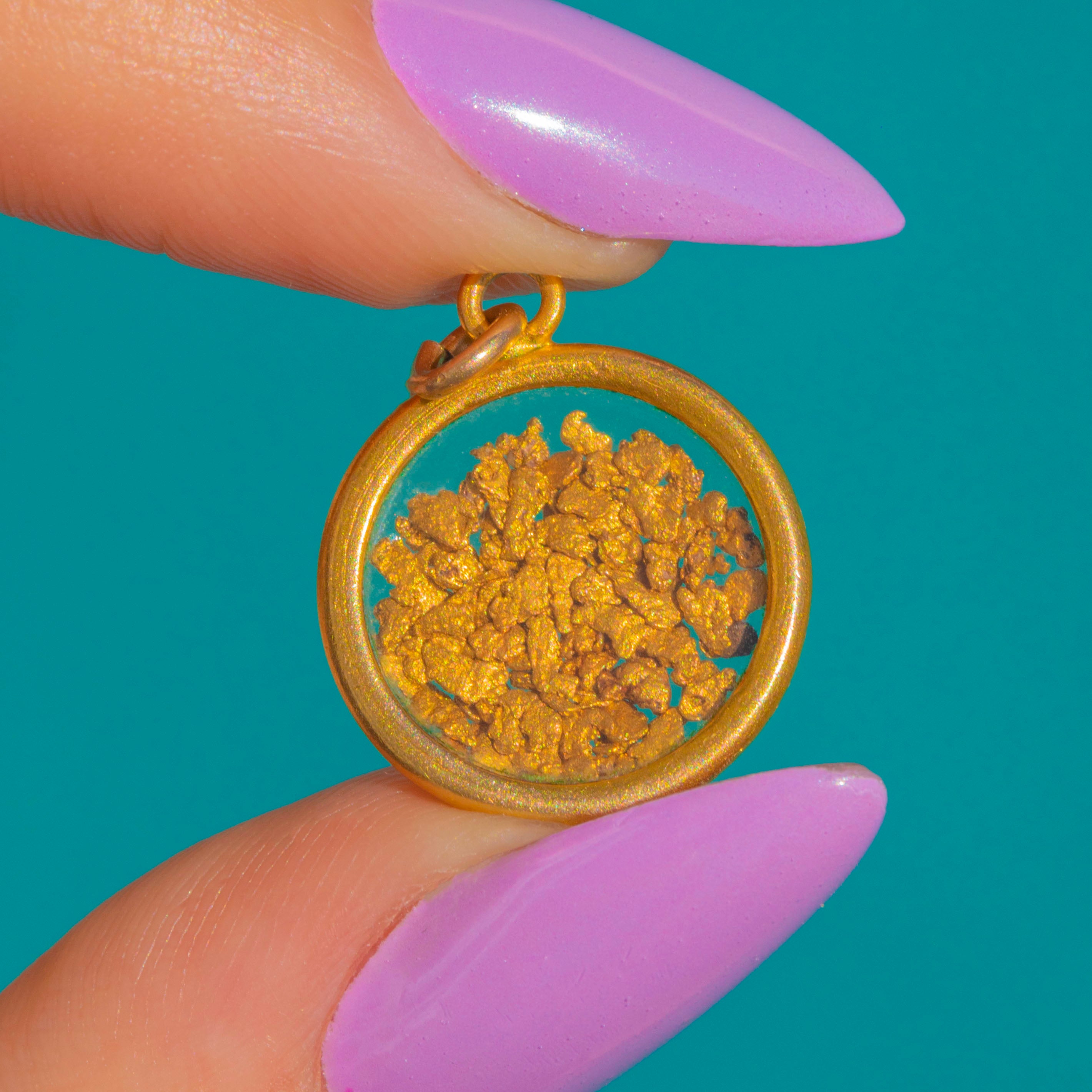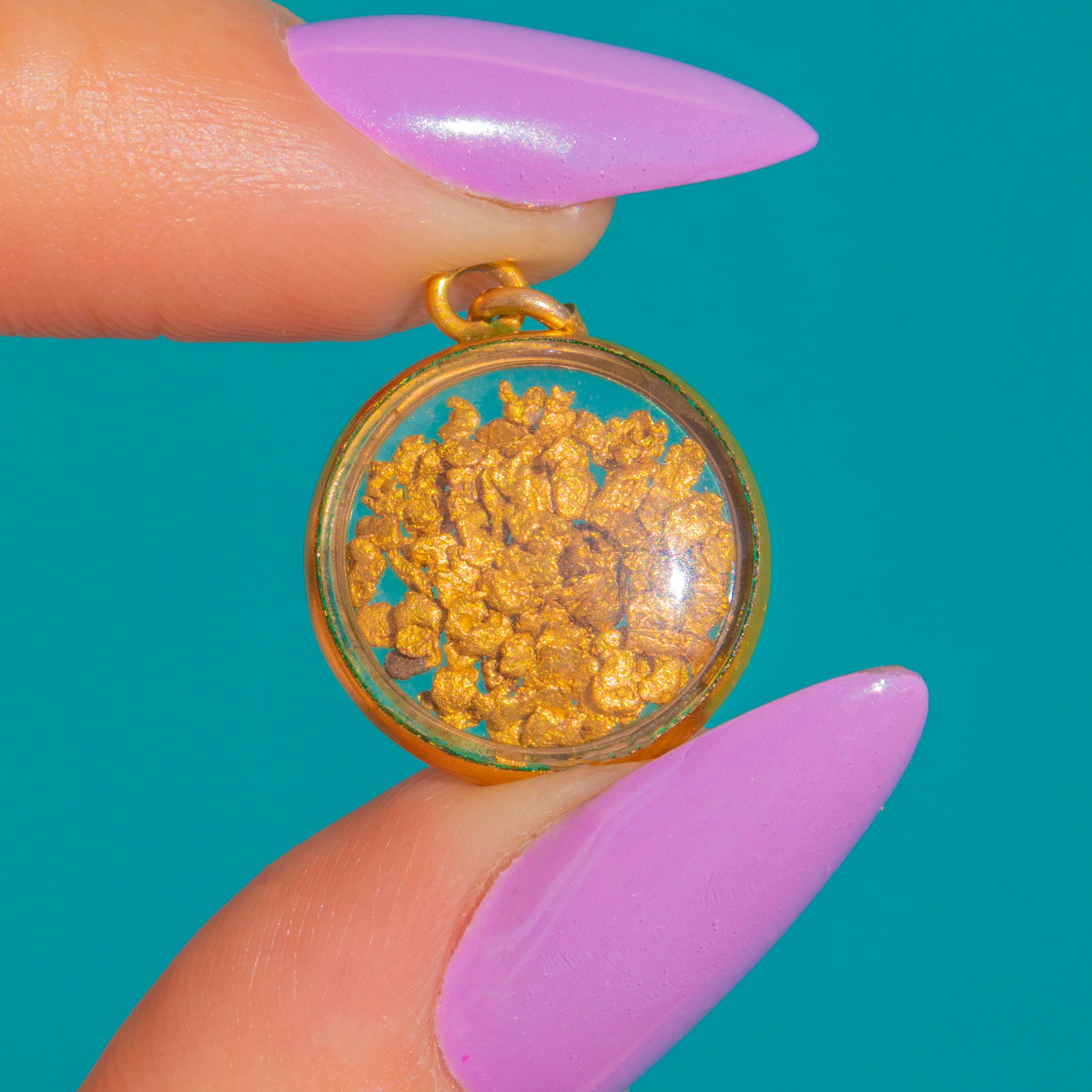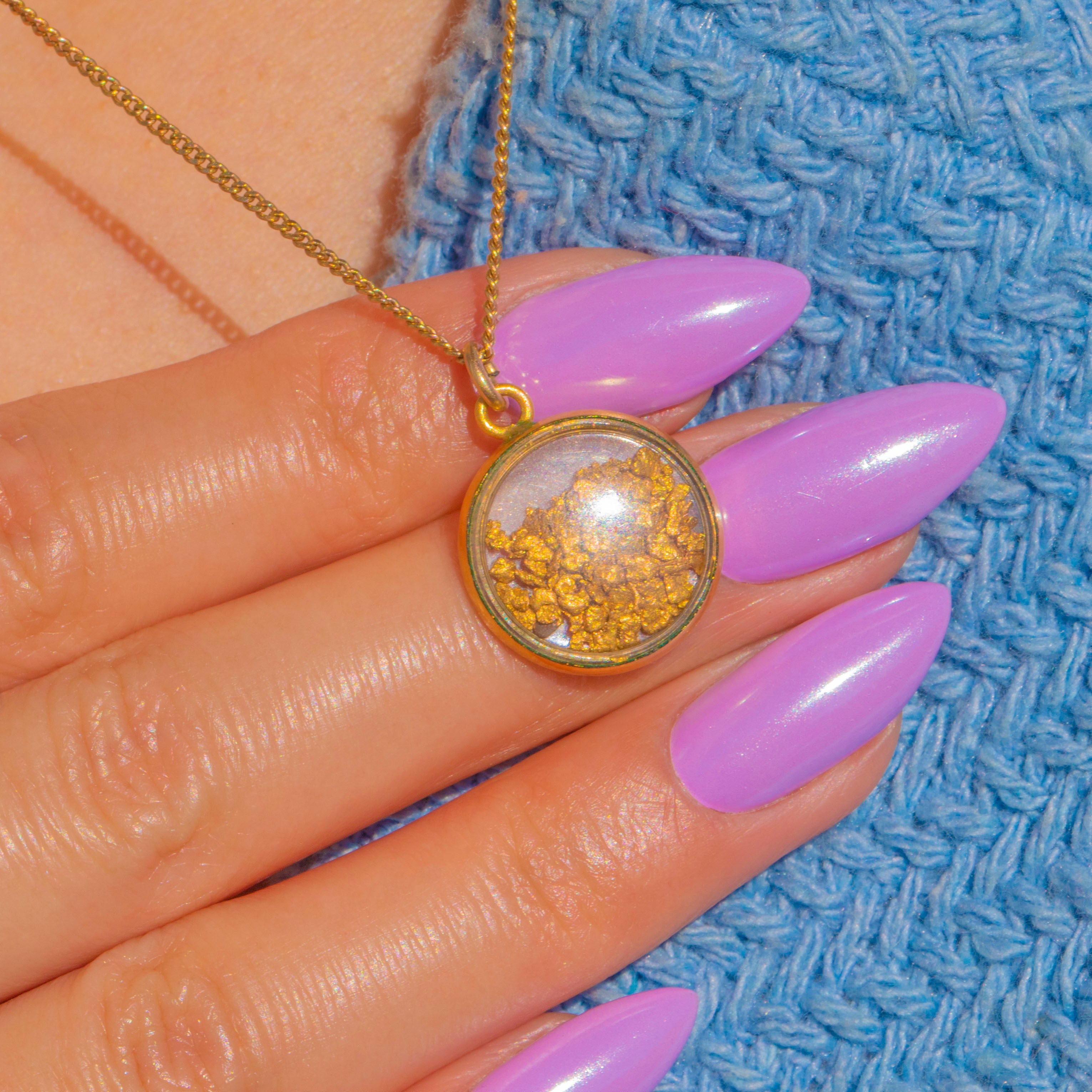 A luminous Art Deco treasure, this round 15ct Gold frame charm captures a pure 22ct Gold flakes beneath a clear domed window. The sleek bezel and petite bale lend a refined, minimalist silhouette, while the organic glow of the nugget brings warmth and intrigue.